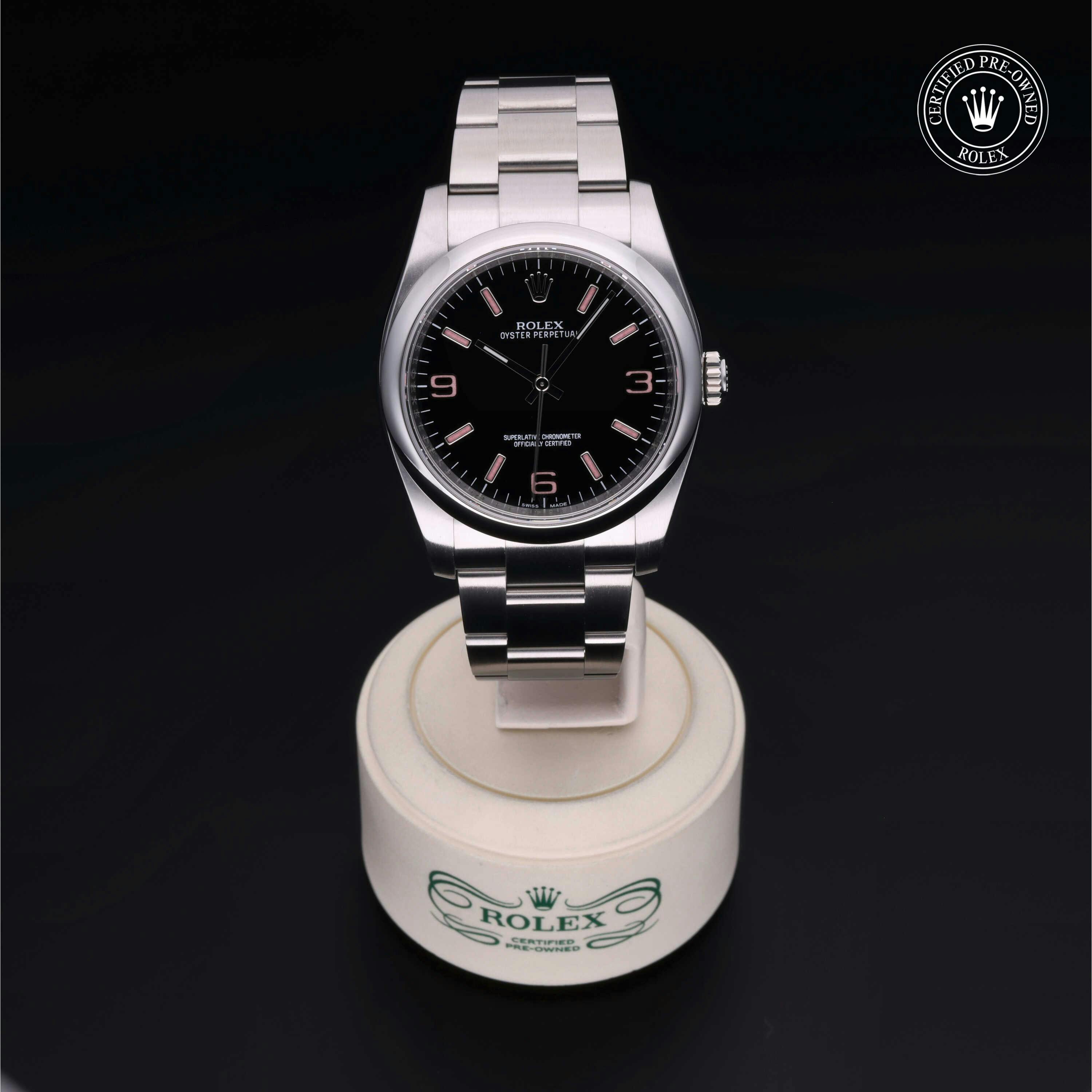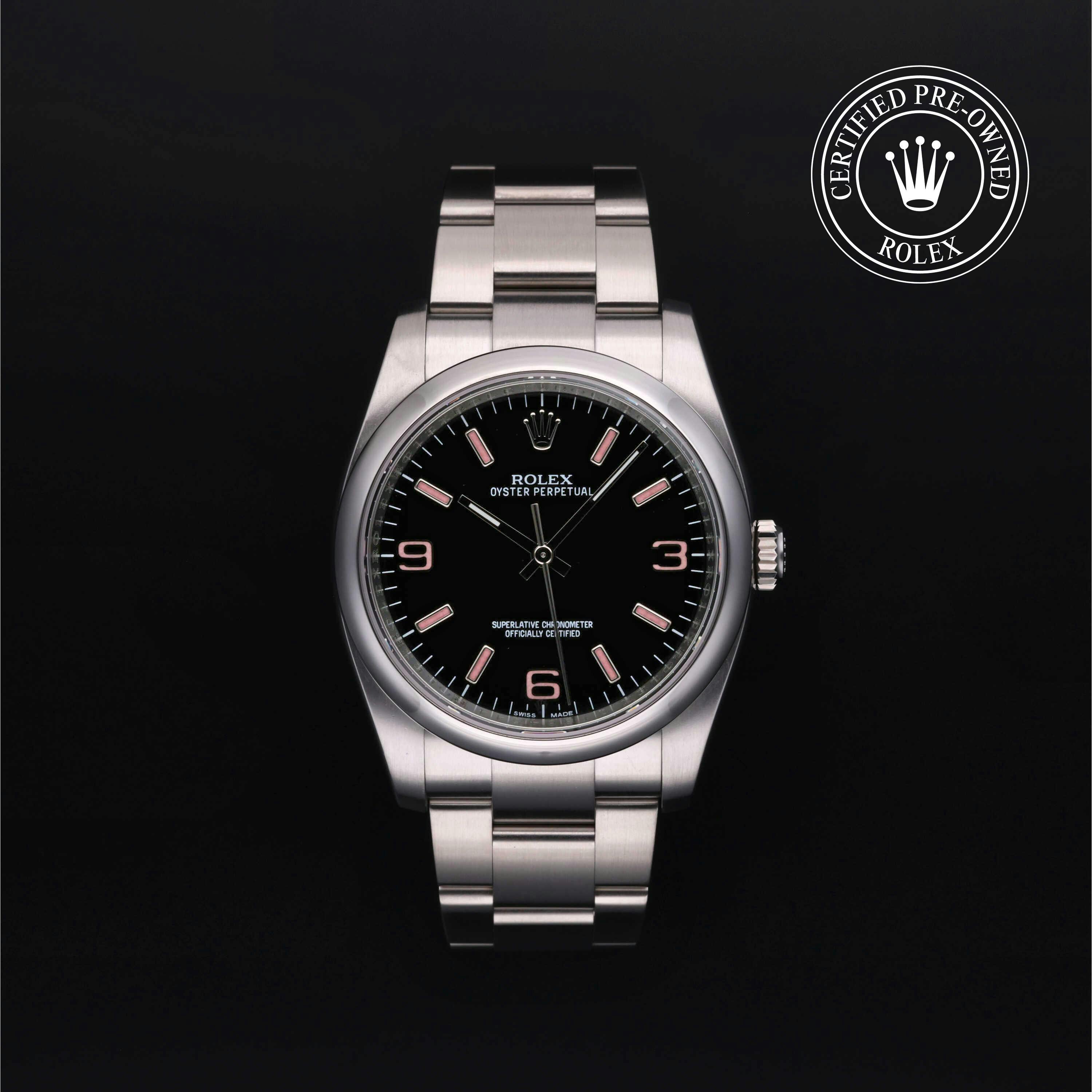 Rolex Certified Pre-Owned Oyster Perpetual (116000) self - winding automatic watch, features a 36mm stainless steel case and domed bezel surrounding a black dial on a stainless steel oyster bracelet. Functions include hours, minutes and seconds. This watch has received Rolex-authorized service and certification. It does not come with the original box or papers, but includes a custom Rolex Certified Pre-Owned hang tag, travel pouch and RCPO international warranty card.