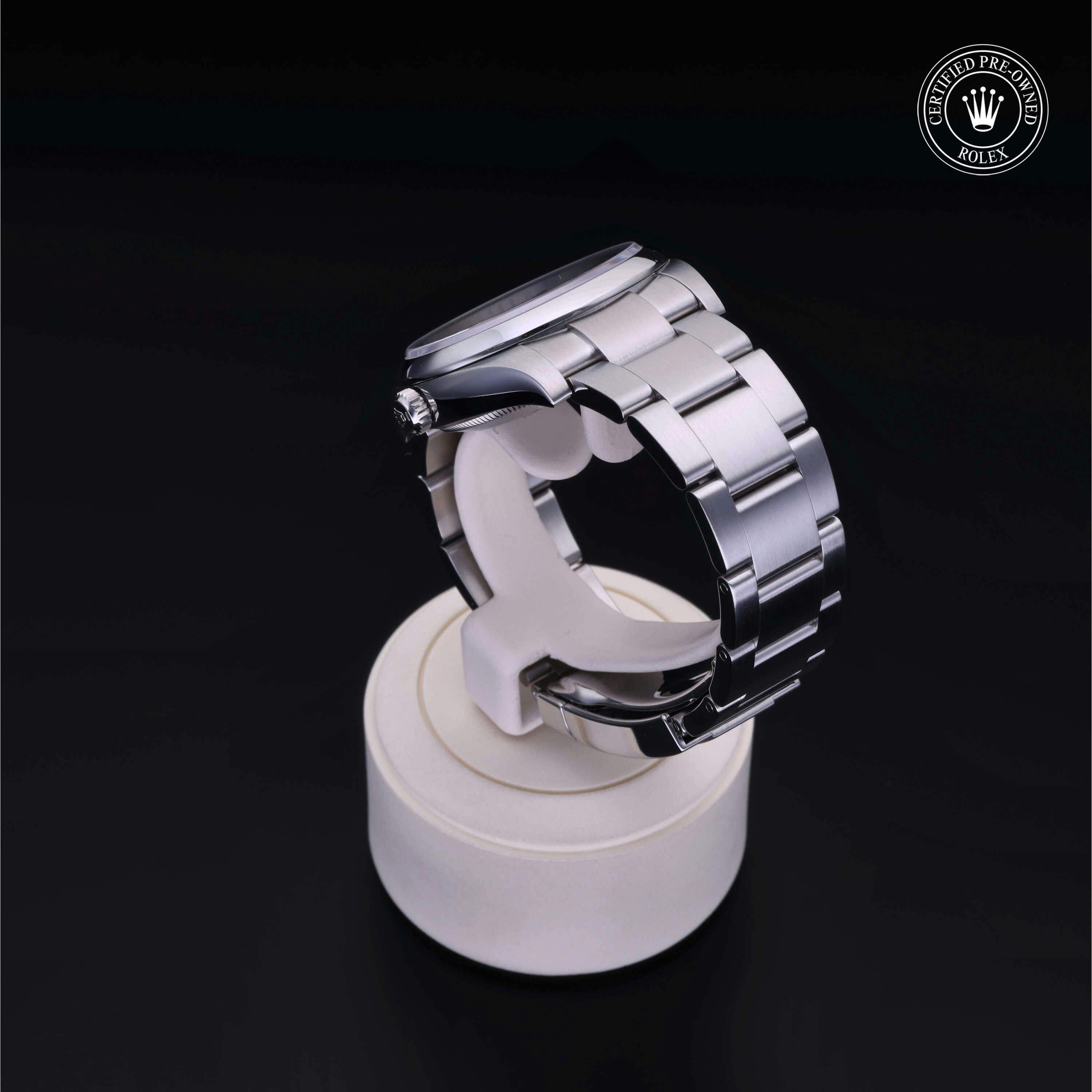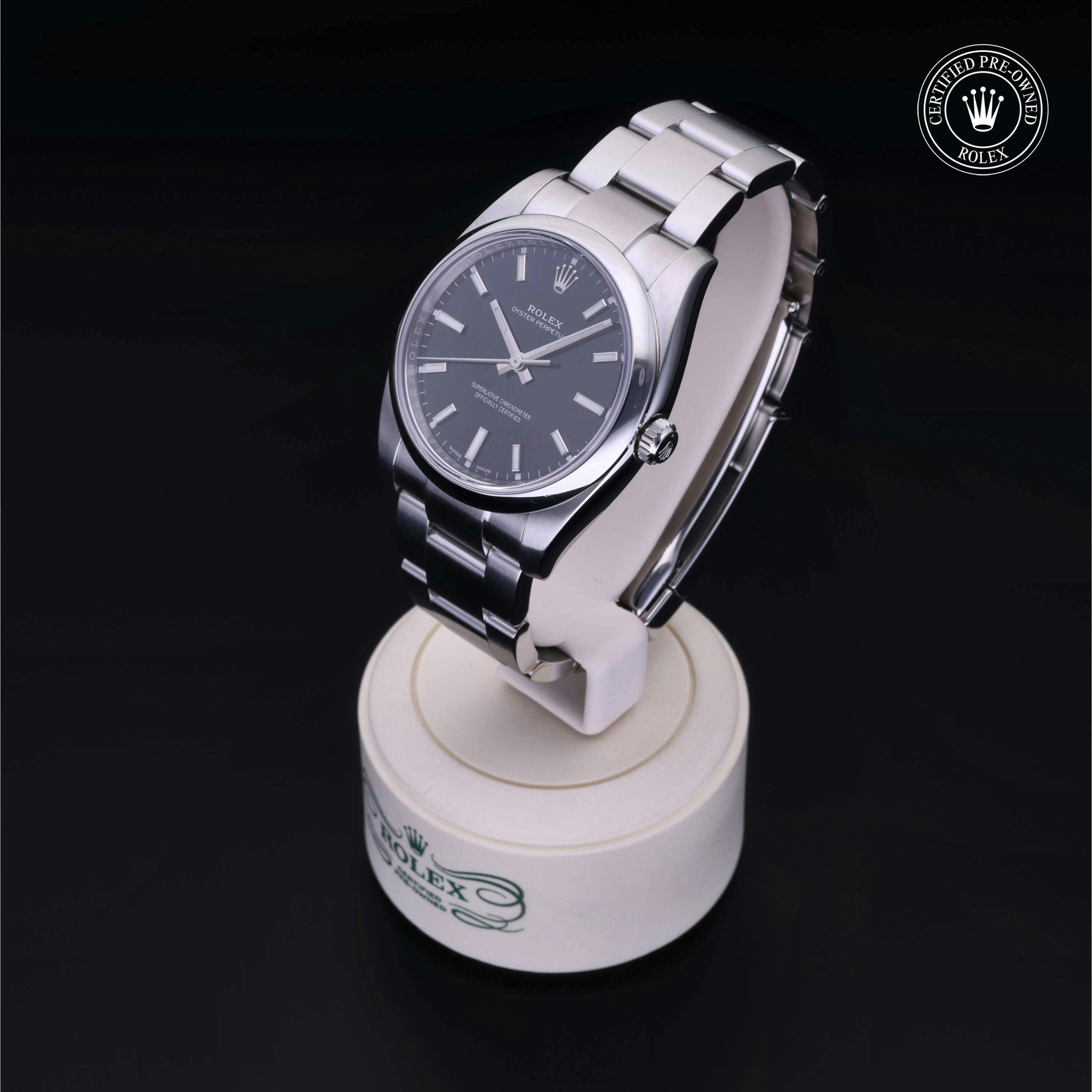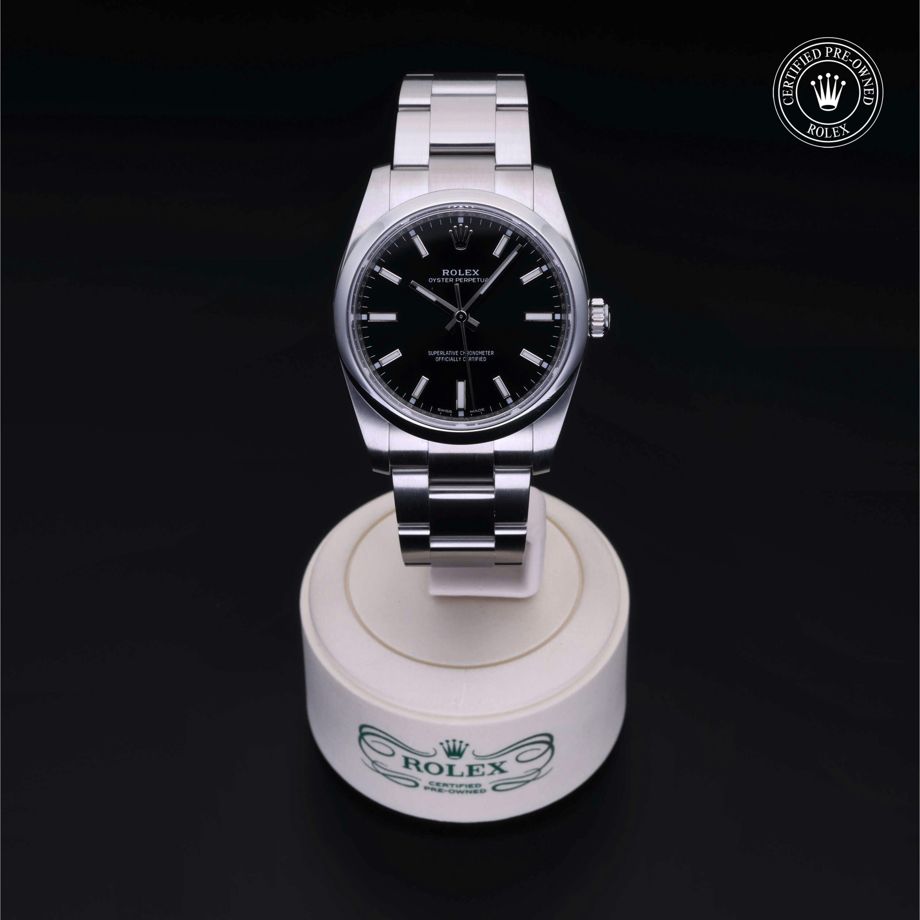 Rolex Certified Pre-Owned Oyster Perpetual (114200) self - winding automatic watch, features a 34mm stainless steel case and domed bezel surrounding a black dial on a stainless steel oyster bracelet. Functions include hours, minutes and seconds. This watch has received Rolex-authorized service and certification. It does not come with the original box or papers, but includes a custom Rolex Certified Pre-Owned hang tag, travel pouch and RCPO international warranty card.
