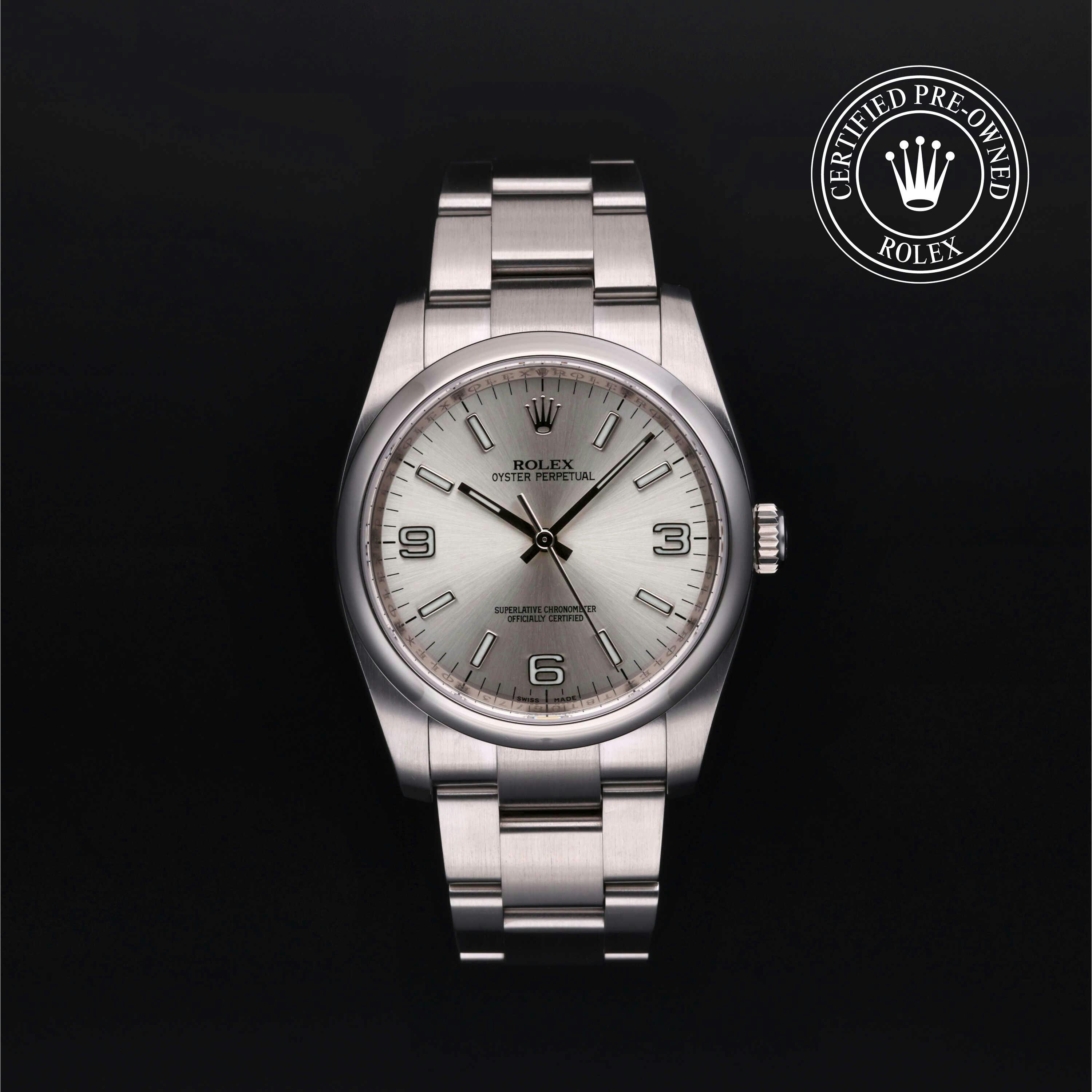 Rolex Certified Pre-Owned Oyster Perpetual (116000) self - winding automatic watch, features a 36mm stainless steel case and domed bezel surrounding a silver dial on a stainless steel oyster bracelet. Functions include hours, minutes and seconds. This watch has received Rolex-authorized service and certification. It does not come with the original box or papers, but includes a custom Rolex Certified Pre-Owned hang tag, travel pouch and RCPO international warranty card.