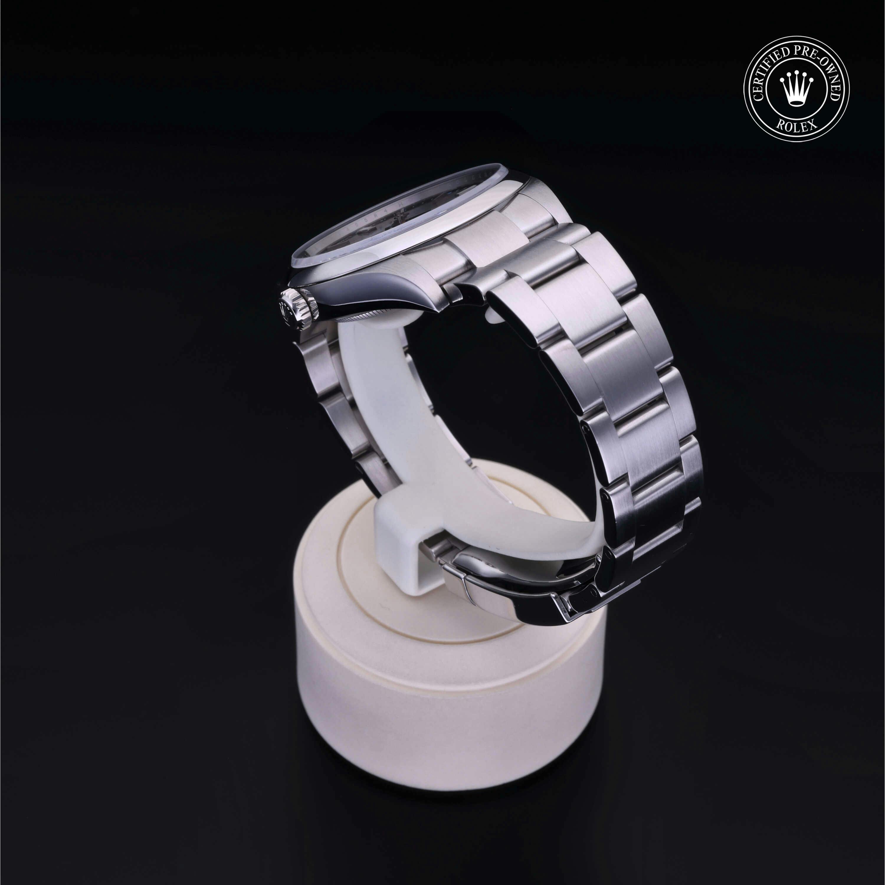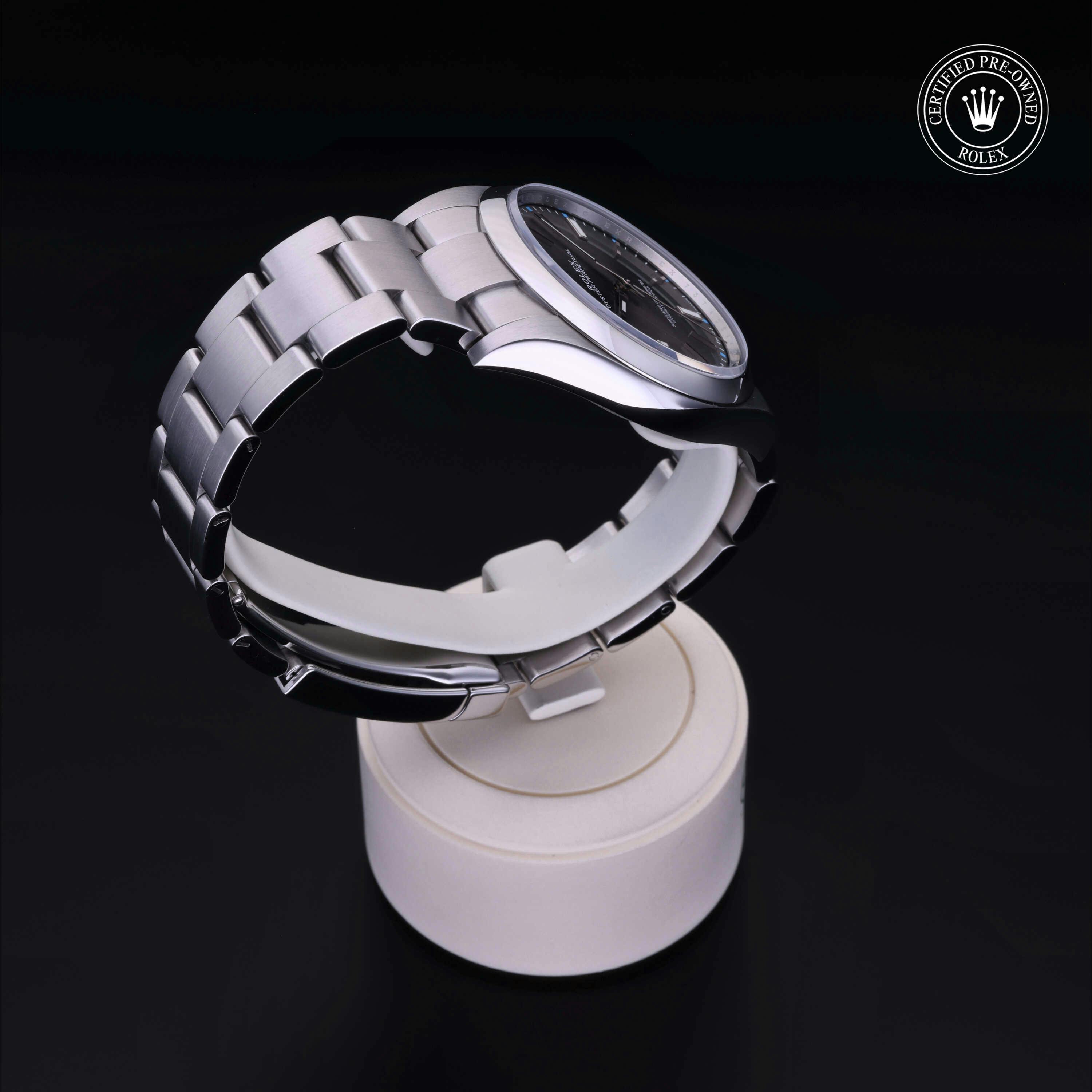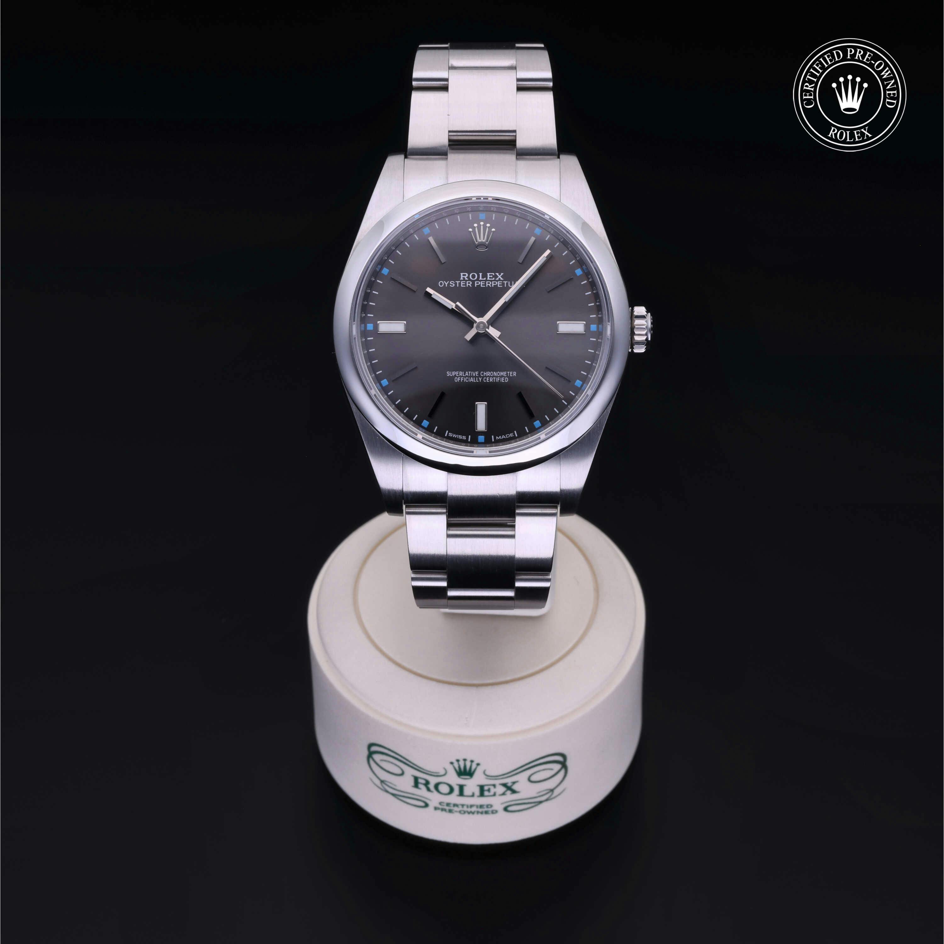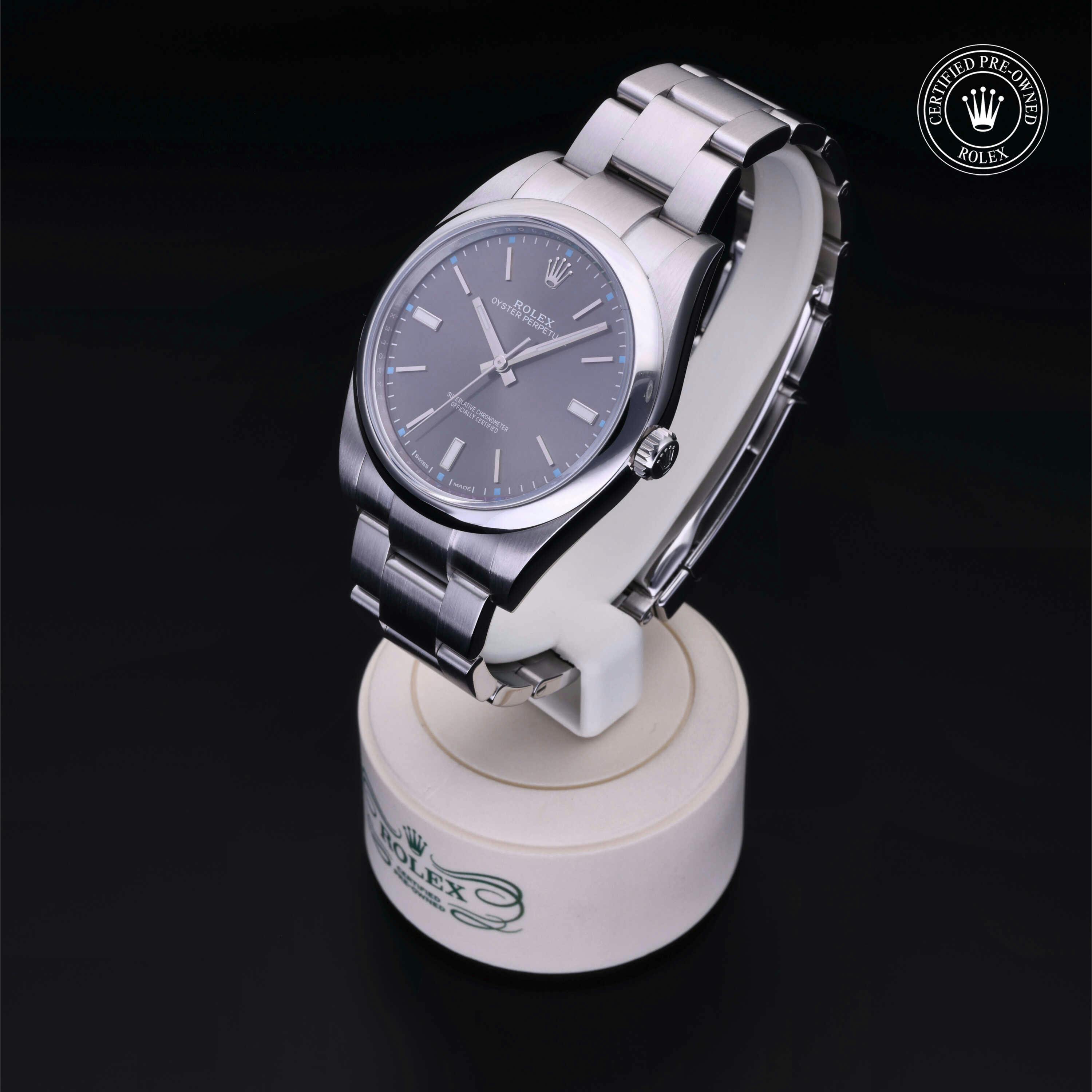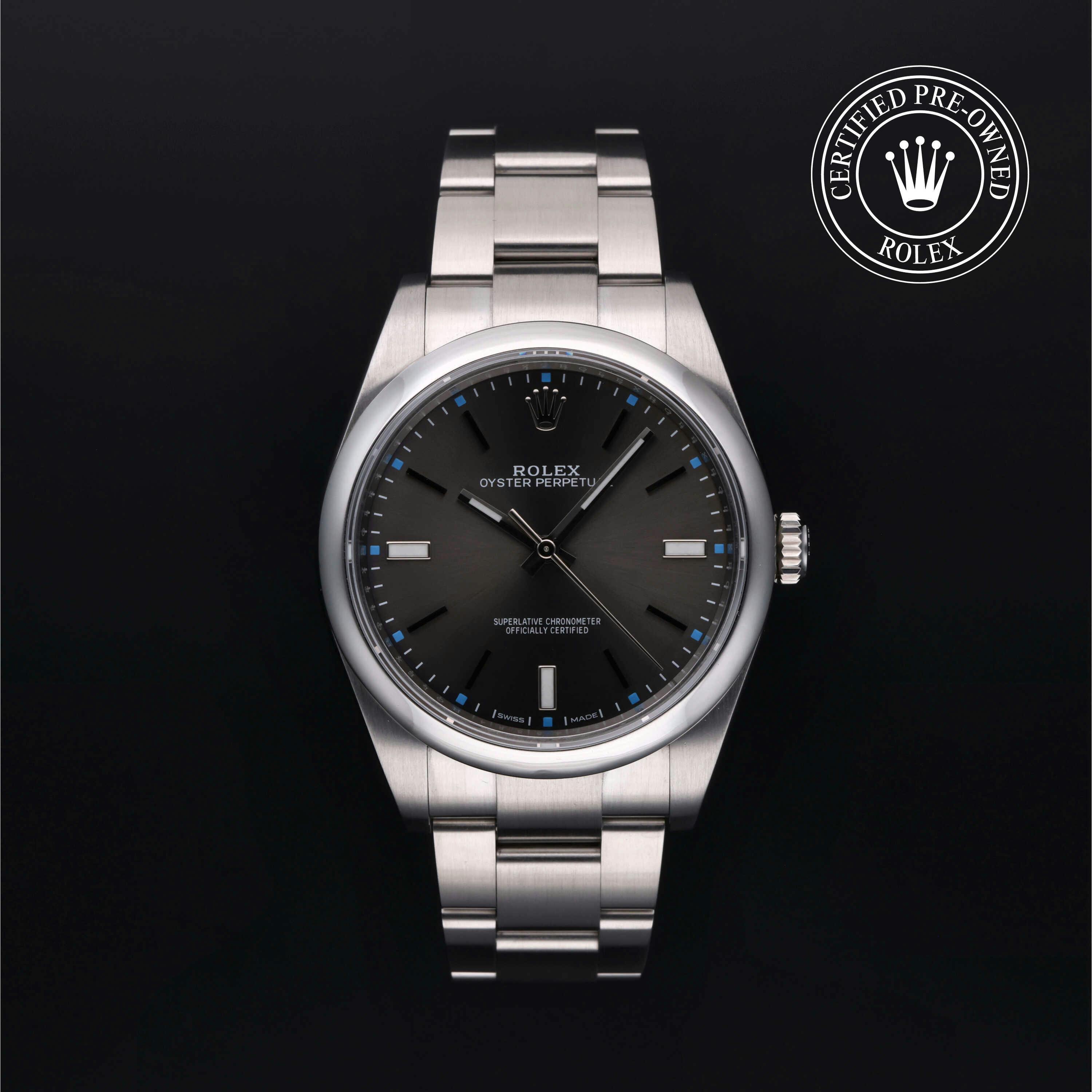Rolex Certified Pre-Owned Oyster Perpetual (114300) self - winding automatic watch, features a 39mm stainless steel case and domed bezel surrounding a dark rhodium dial on a stainless steel oyster bracelet. Functions include hours, minutes and seconds. This watch has received Rolex-authorized service and certification. It does not come with the original box or papers, but includes a custom Rolex Certified Pre-Owned hang tag, travel pouch and RCPO international warranty card.