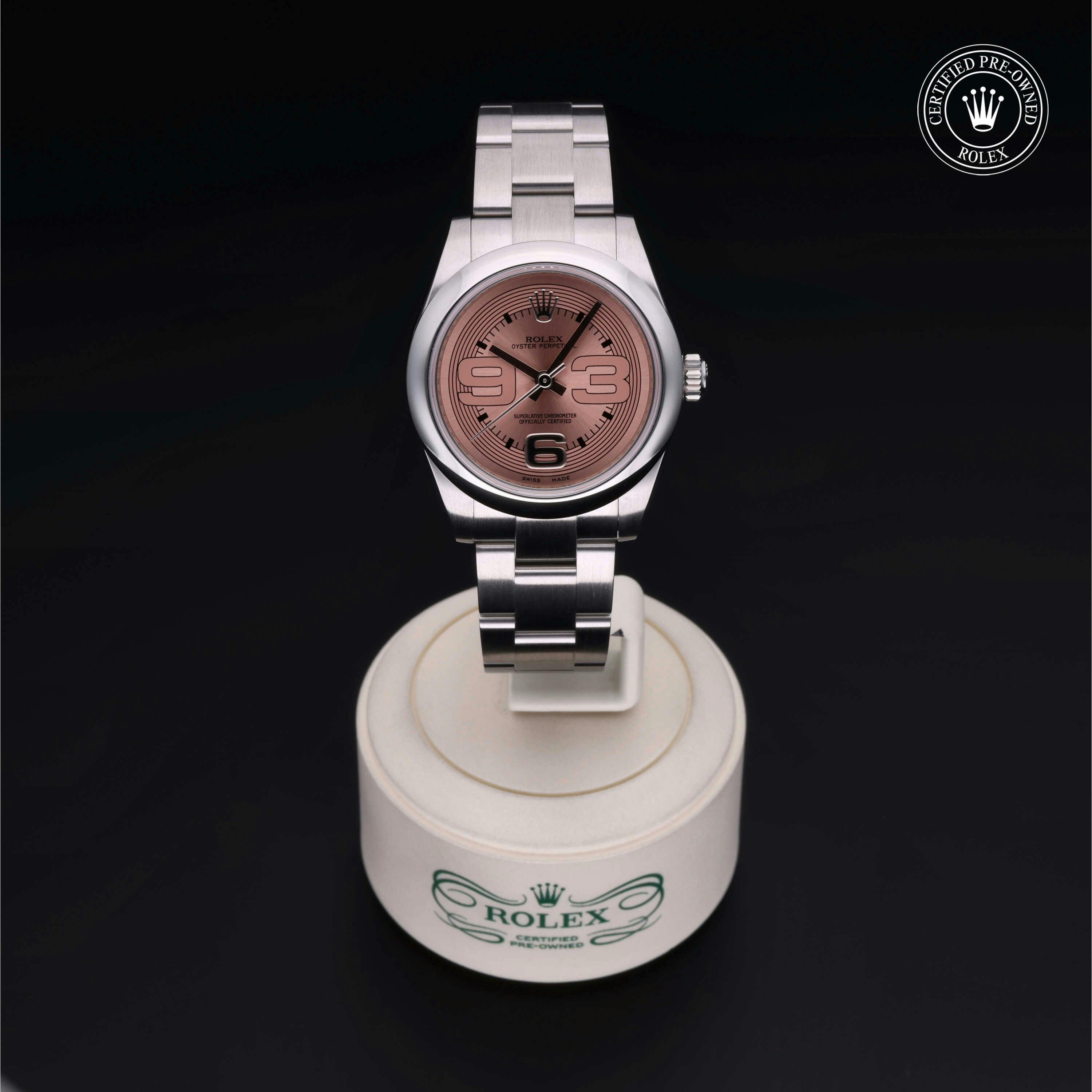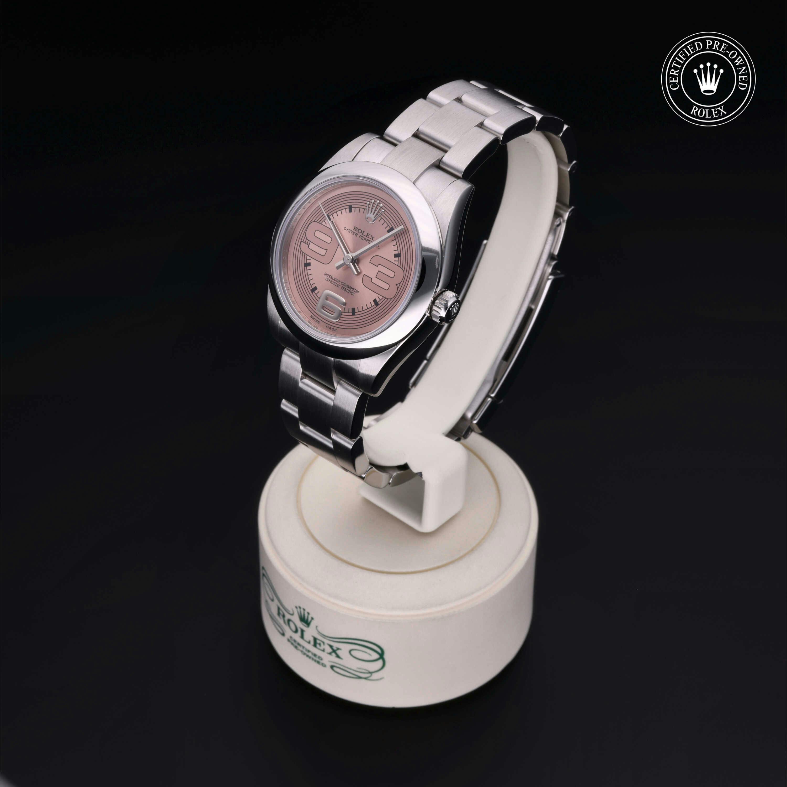 Rolex Certified Pre-Owned Oyster Perpetual (177200) self - winding automatic watch, features a 31mm stainless steel case with a domed bezel surrounding a pink index and bold number dial. The watch is secured on a stainless steel Oyster bracelet complete with a folding buckle. Functions include hours, minutes and seconds. This watch has been serviced by an authorized service center and certified by Rolex. It comes with the original papers and includes a custom Rolex Certified Pre-Owned hang tag, travel pouch and international warranty card.