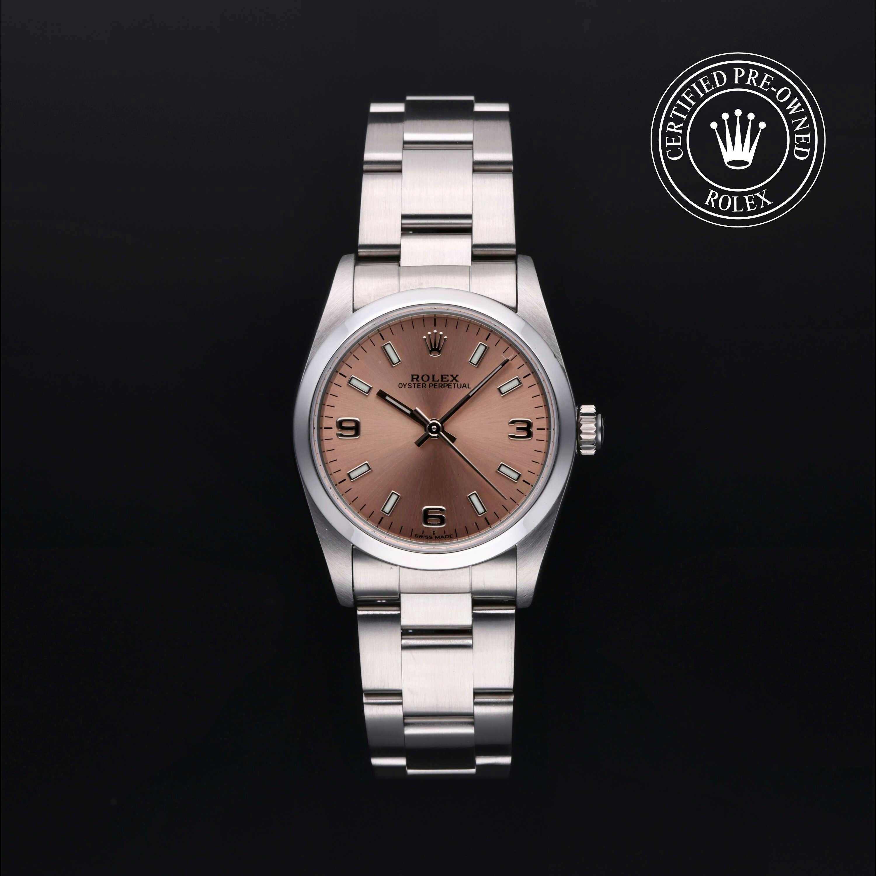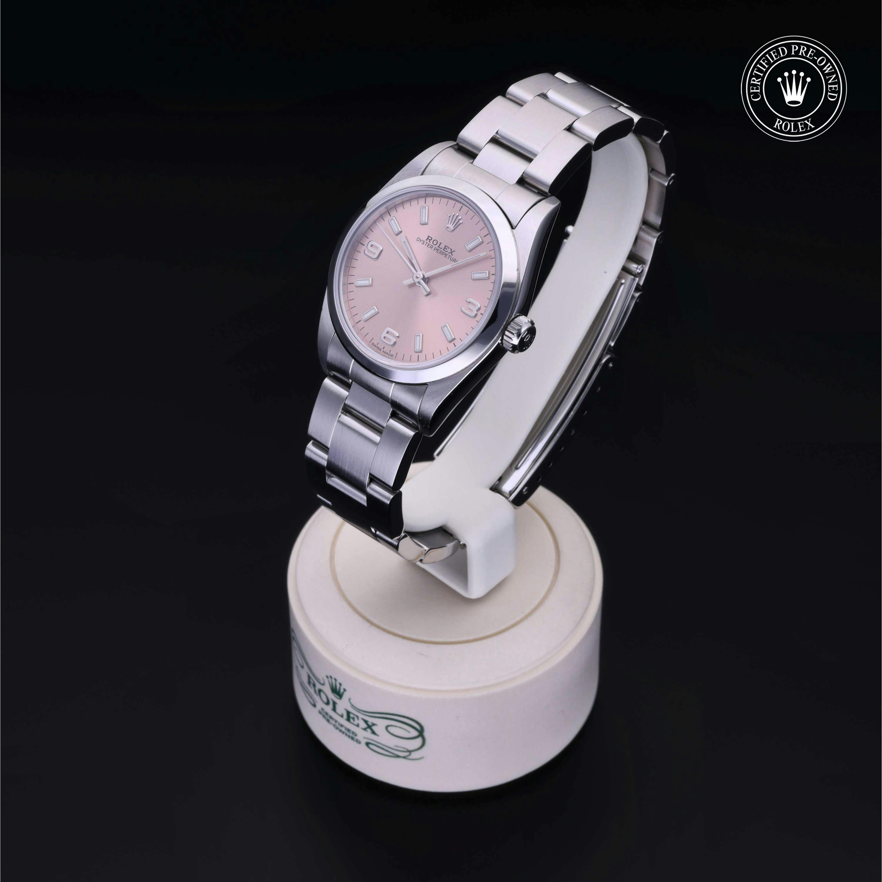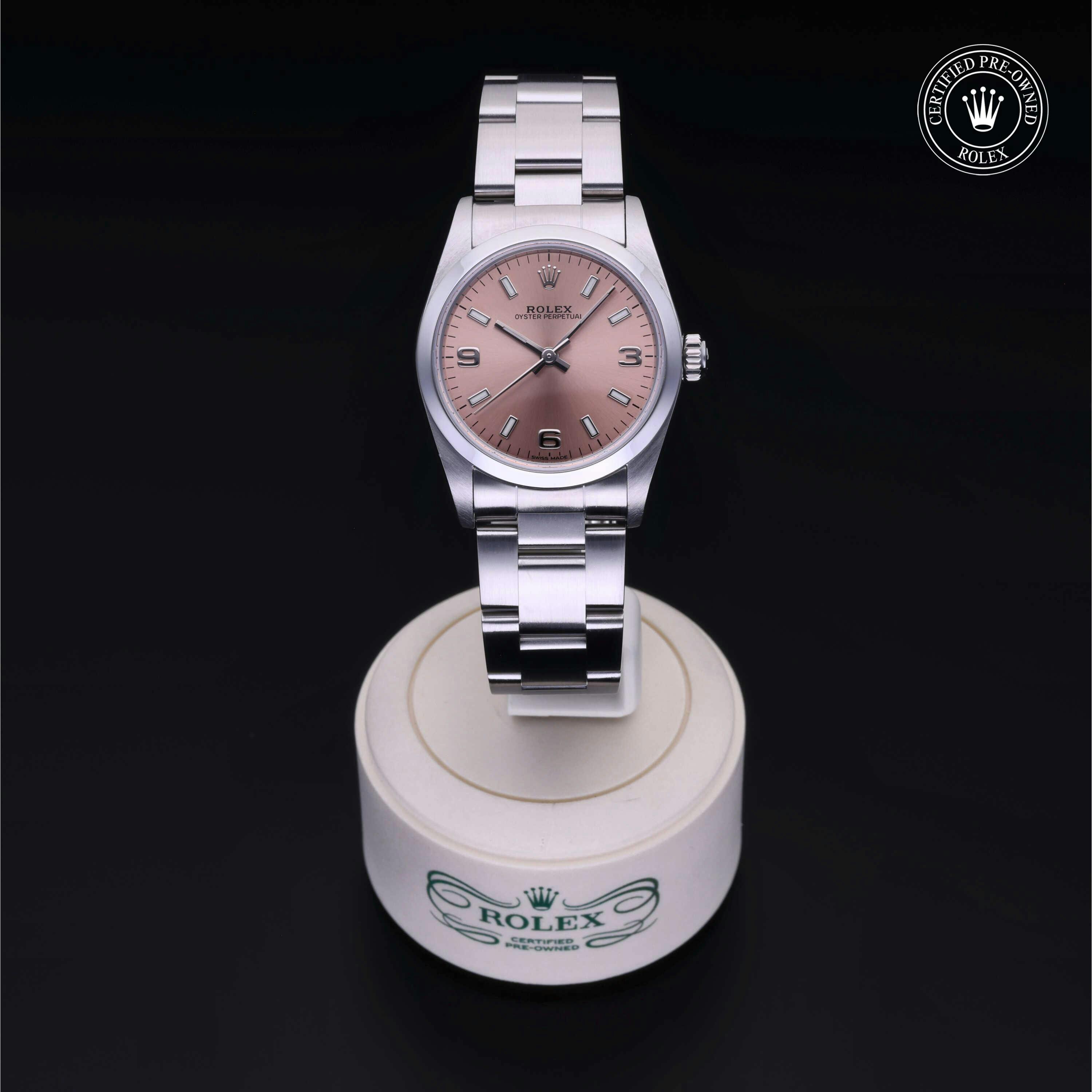 Rolex Certified Pre-Owned Oyster Perpetual (77080) self - winding automatic watch, features a 31mm stainless steel case and smooth bezel surrounding a pink dial on a stainless steel oyster bracelet. Functions include hours, minutes and seconds. This watch has received Rolex-authorized service and certification. It does not come with the original box or papers, but includes a custom Rolex Certified Pre-Owned hang tag, travel pouch and RCPO international warranty card.