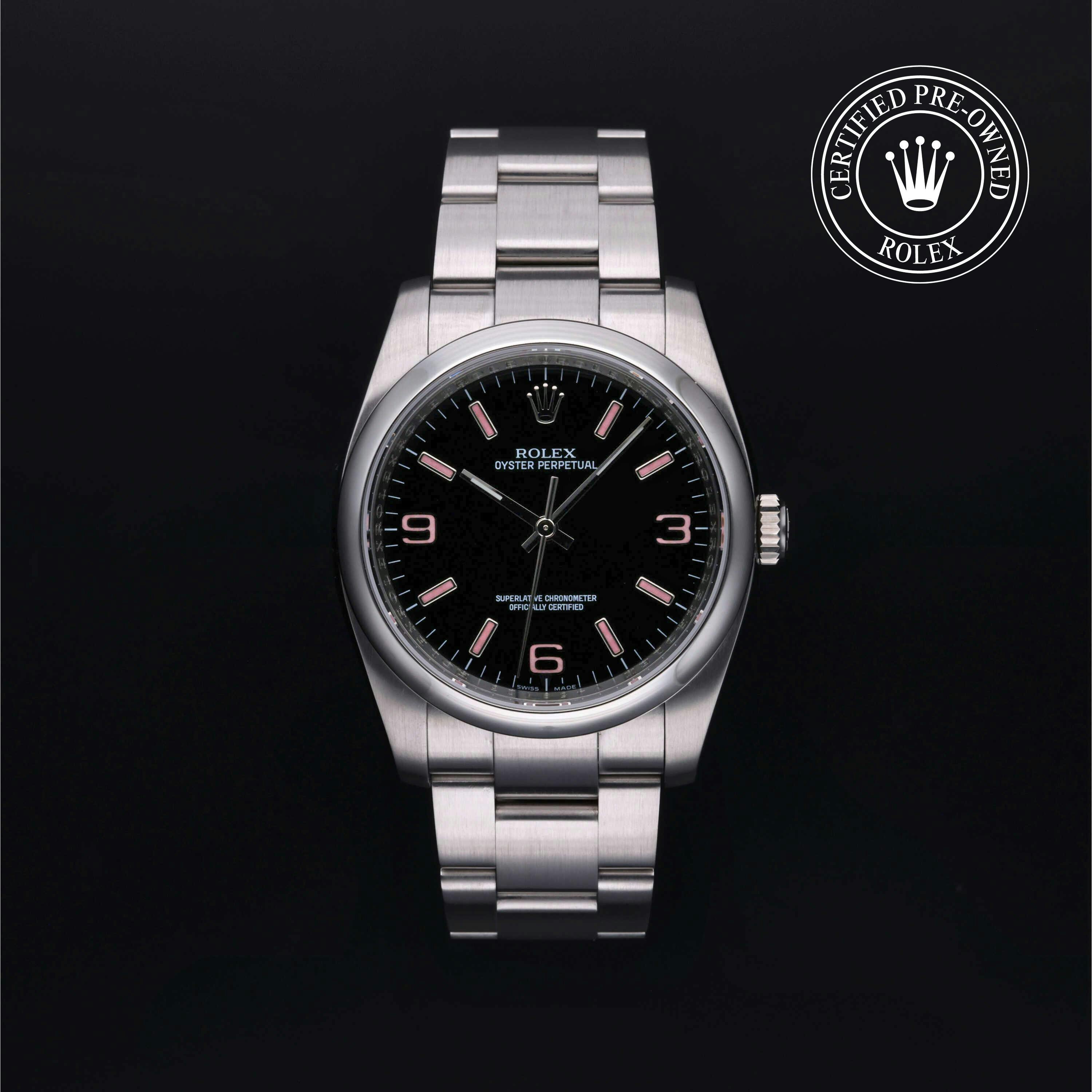 Rolex Certified Pre-Owned Oyster Perpetual (116000) self - winding automatic watch, features a 36mm stainless steel case and domed bezel surrounding a black dial on a stainless steel oyster bracelet. Functions include hours, minutes and seconds. This watch has received Rolex-authorized service and certification. It does not come with the original box or papers, but includes a custom Rolex Certified Pre-Owned hang tag, travel pouch and RCPO international warranty card.
