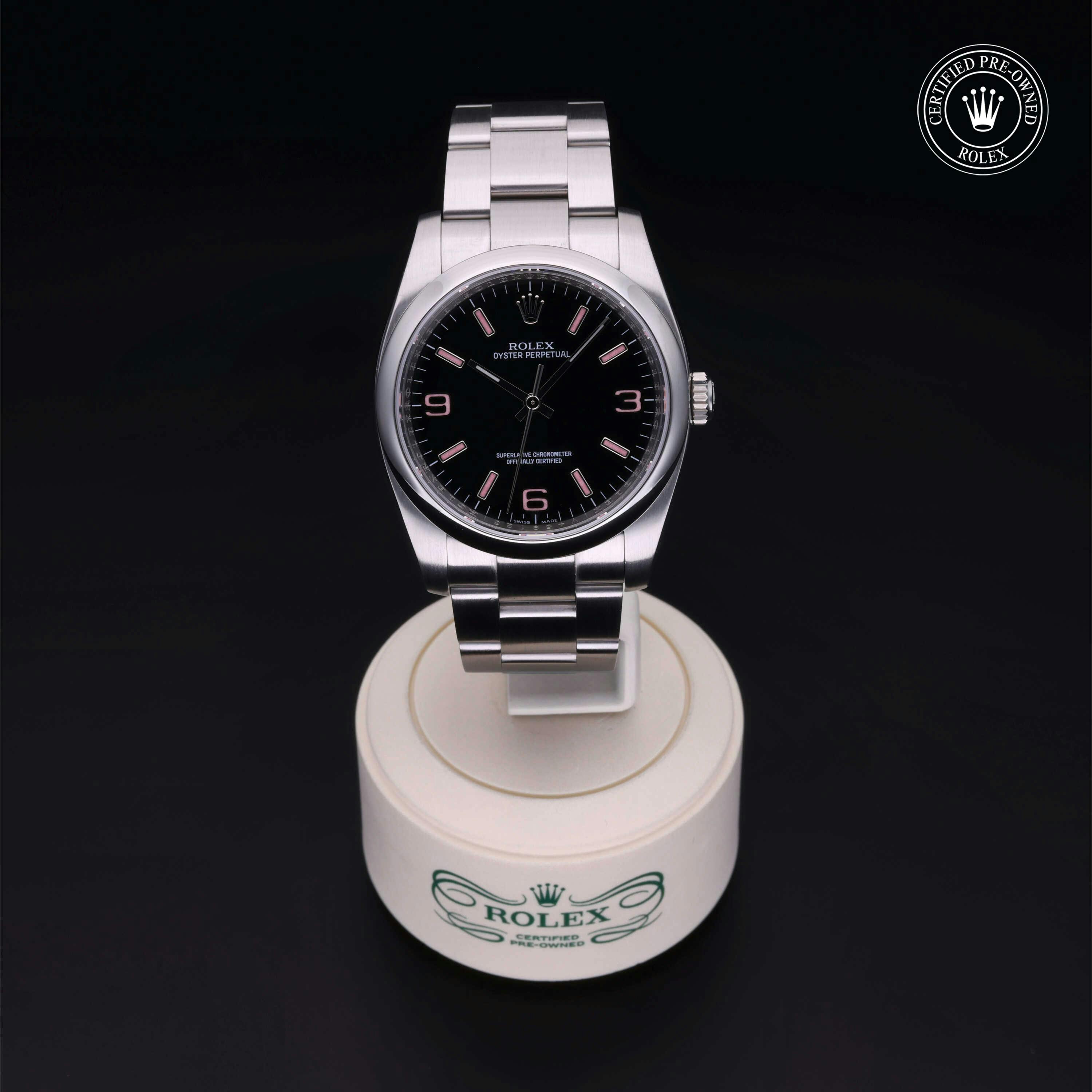Rolex Certified Pre-Owned Oyster Perpetual (116000) self - winding automatic watch, features a 36mm stainless steel case and domed bezel surrounding a black dial on a stainless steel oyster bracelet. Functions include hours, minutes and seconds. This watch has received Rolex-authorized service and certification. It does not come with the original box or papers, but includes a custom Rolex Certified Pre-Owned hang tag, travel pouch and RCPO international warranty card.