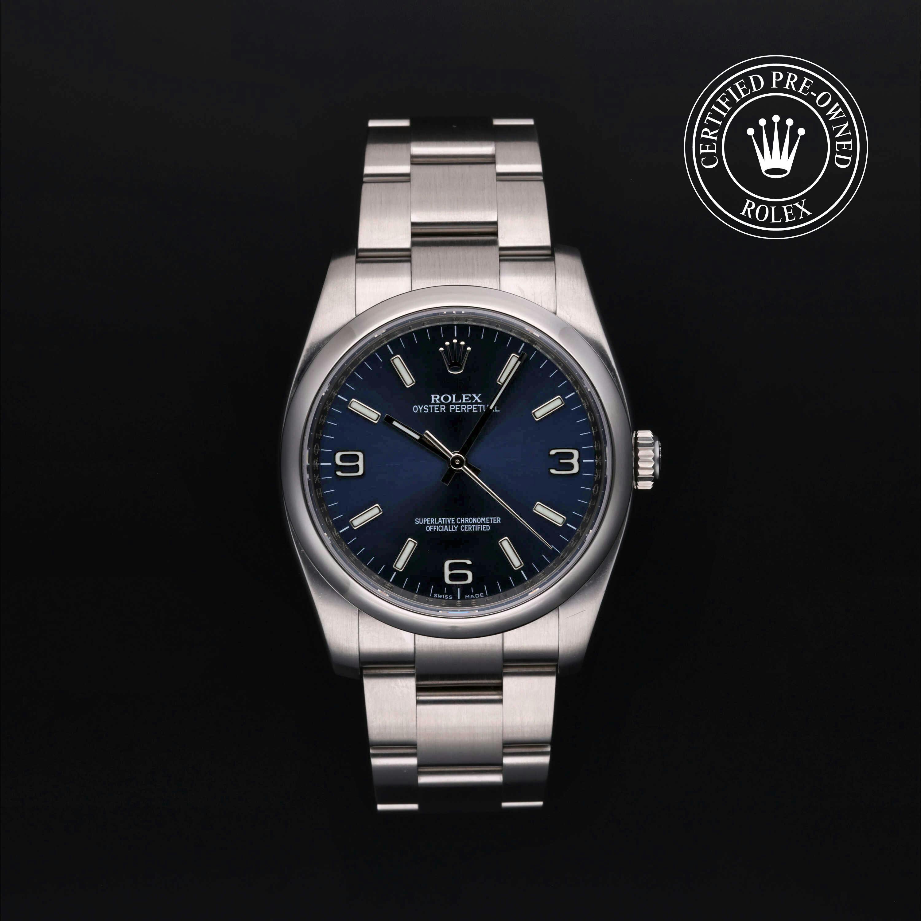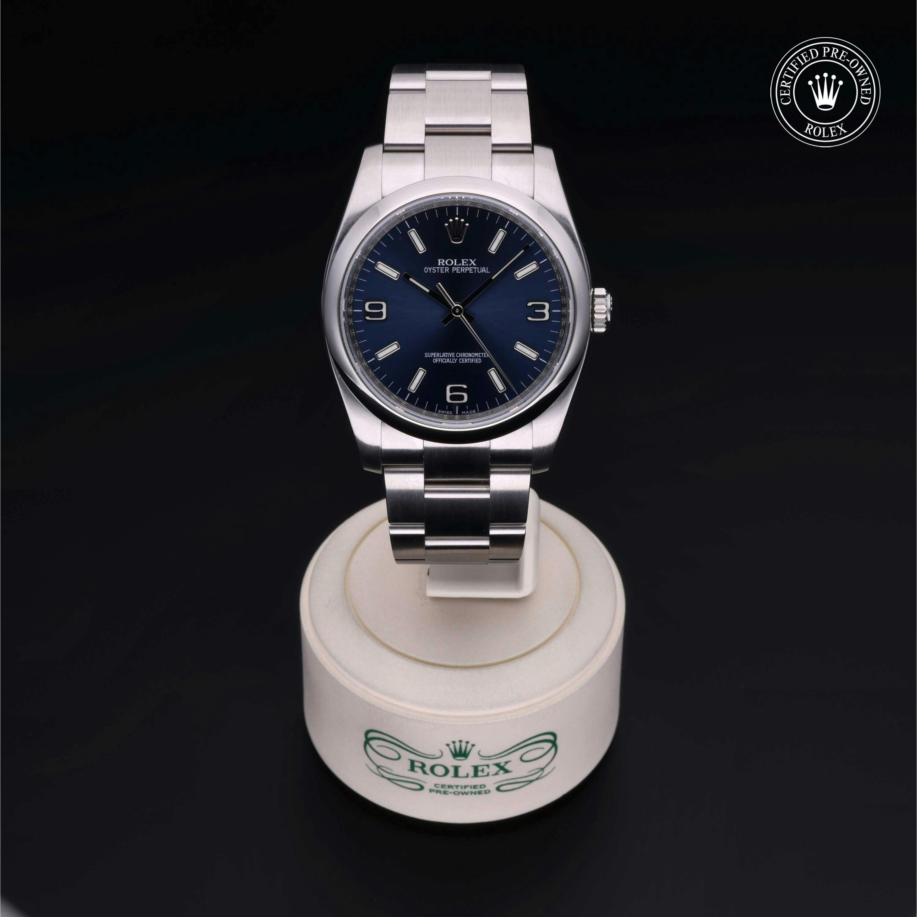 Rolex Certified Pre-Owned Oyster Perpetual (116000) self - winding automatic watch, features a 36mm stainless steel case and domed bezel surrounding a blue dial on a stainless steel oyster bracelet. Functions include hours, minutes and seconds. This watch has received Rolex-authorized service and certification. It does not come with the original box or papers, but includes a custom Rolex Certified Pre-Owned hang tag, travel pouch and RCPO international warranty card.