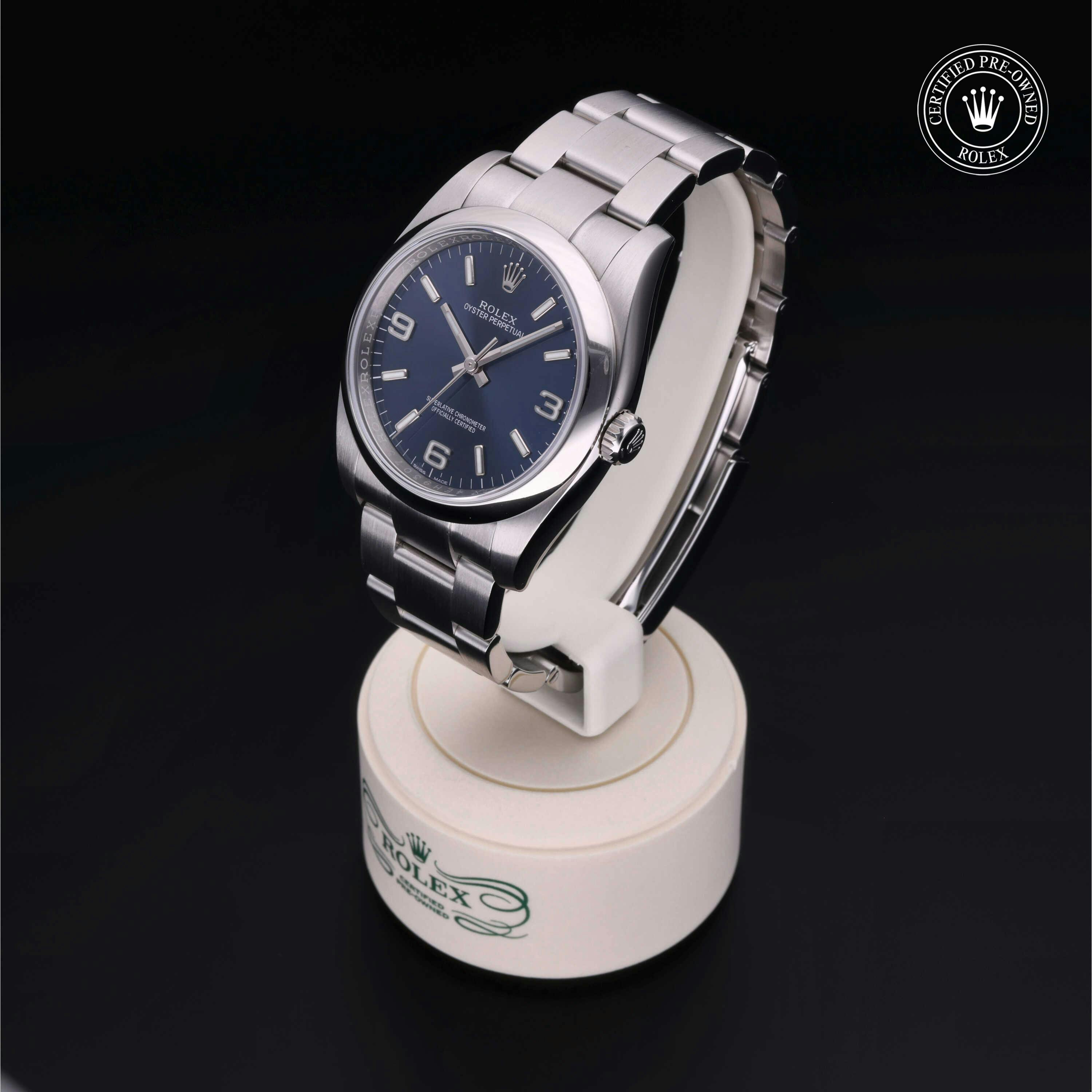 Rolex Certified Pre-Owned Oyster Perpetual (116000) self - winding automatic watch, features a 36mm stainless steel case and domed bezel surrounding a blue dial on a stainless steel oyster bracelet. Functions include hours, minutes and seconds. This watch has received Rolex-authorized service and certification. It does not come with the original box or papers, but includes a custom Rolex Certified Pre-Owned hang tag, travel pouch and RCPO international warranty card.