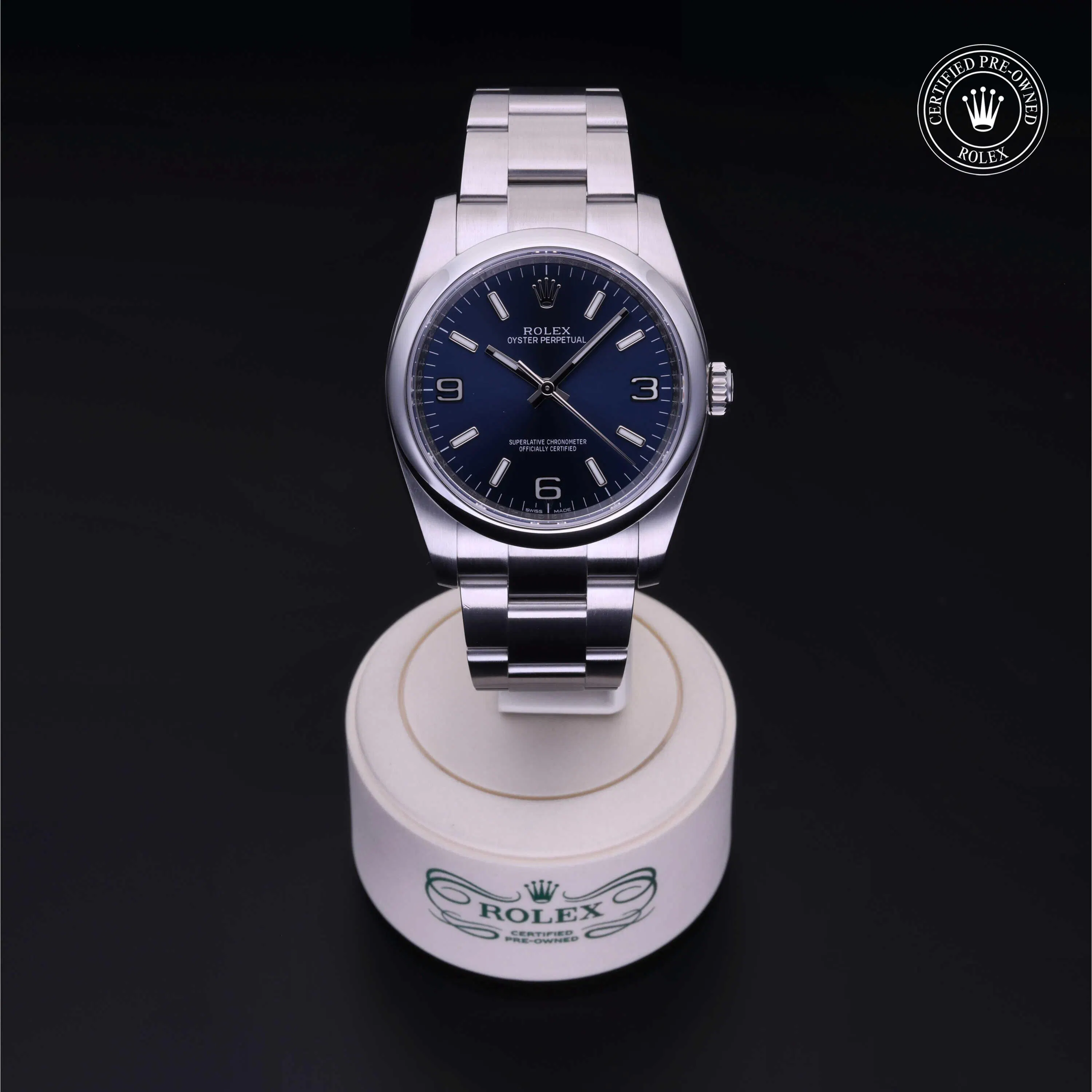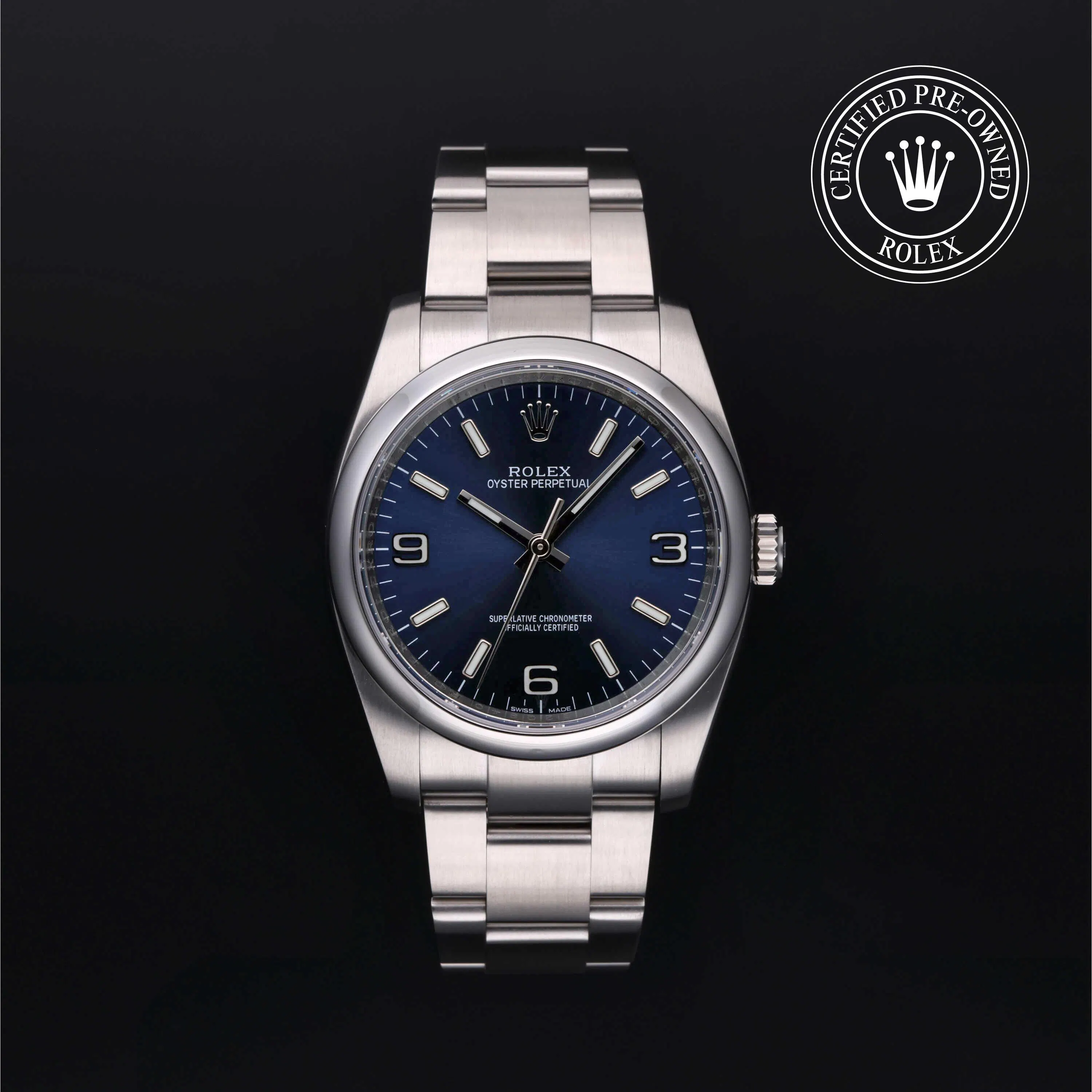 Rolex Certified Pre-Owned Oyster Perpetual (116000) self - winding automatic watch, features a 36mm stainless steel case and domed bezel surrounding a blue dial on a stainless steel oyster bracelet. Functions include hours, minutes and seconds. This watch has received Rolex-authorized service and certification. It does not come with the original box or papers, but includes a custom Rolex Certified Pre-Owned hang tag, travel pouch and RCPO international warranty card.