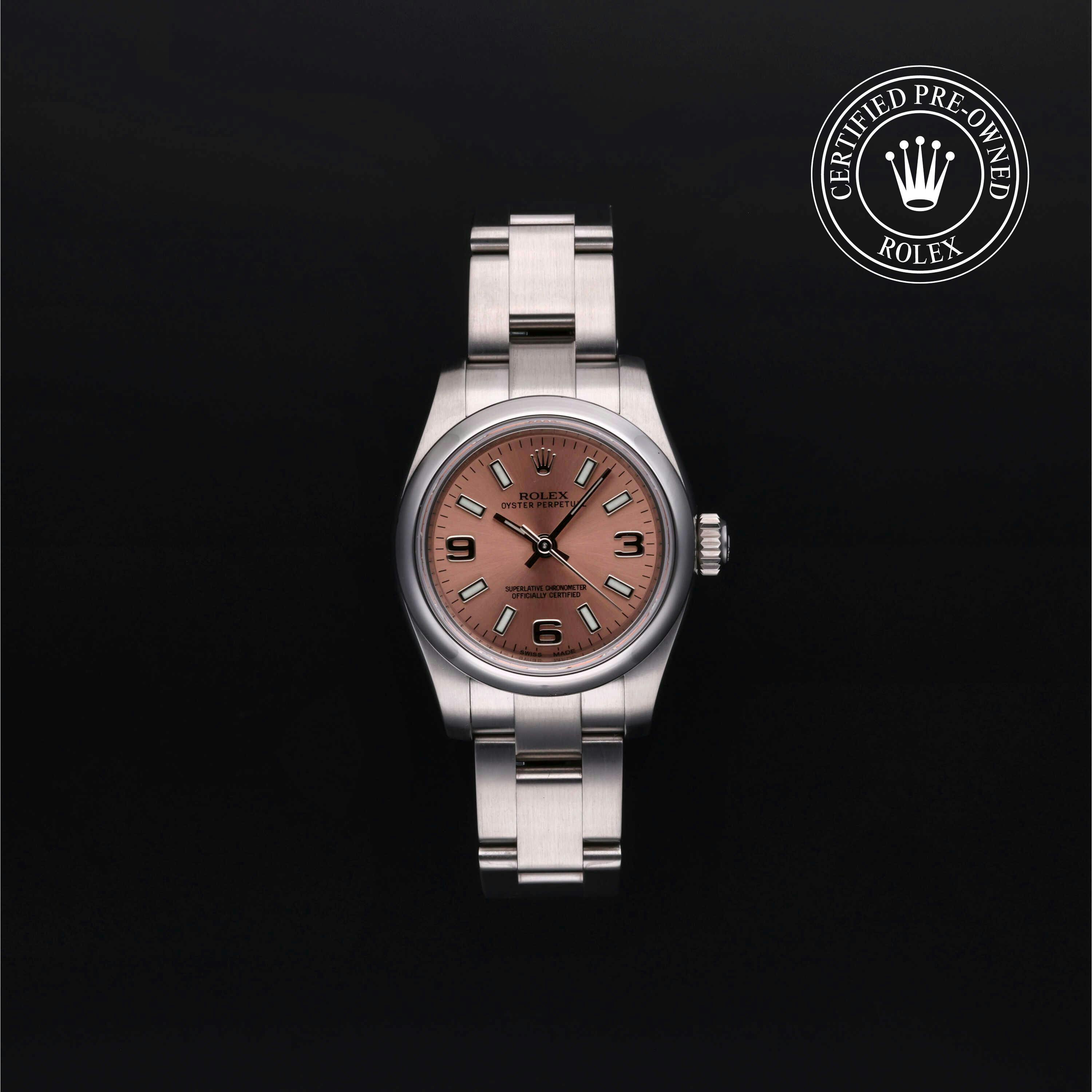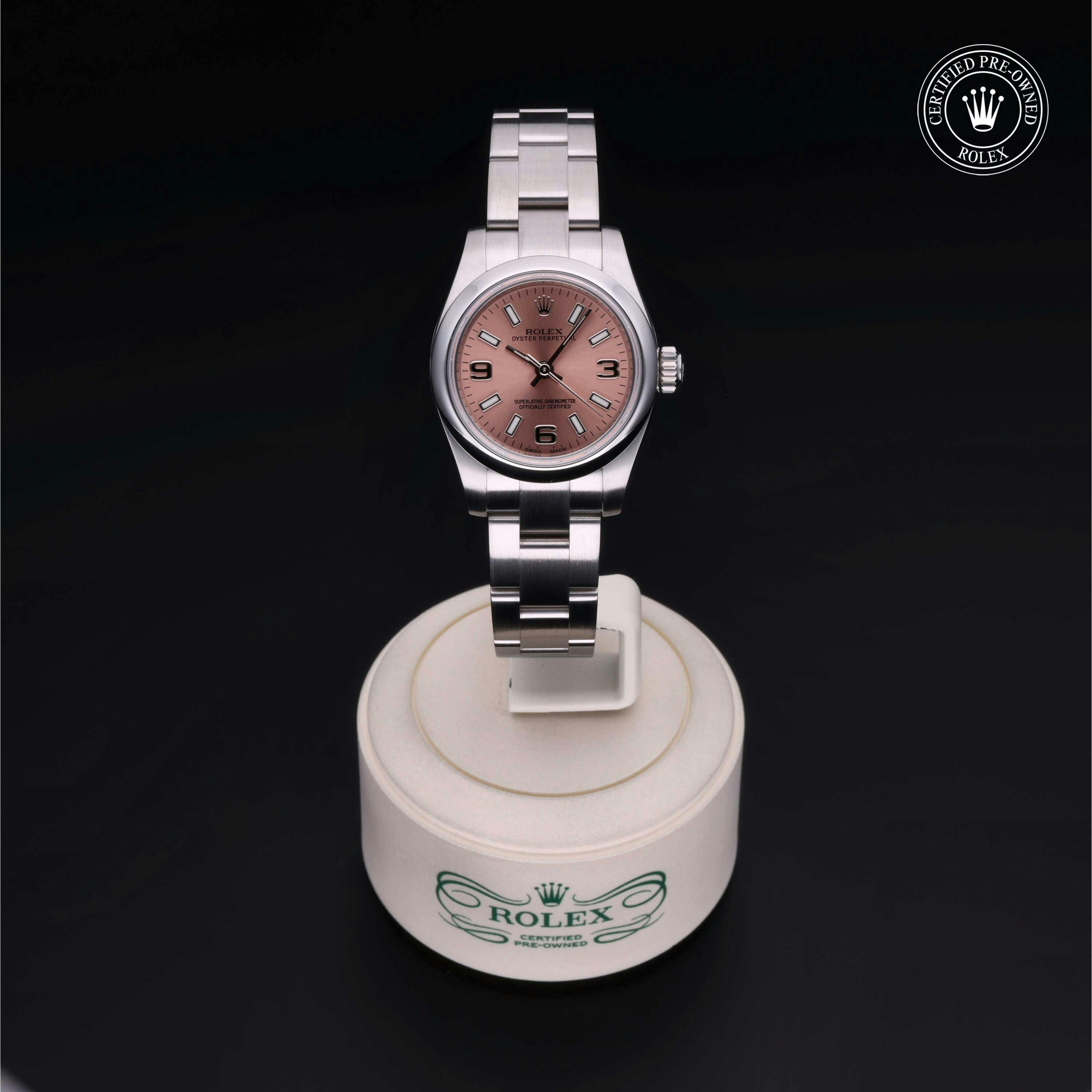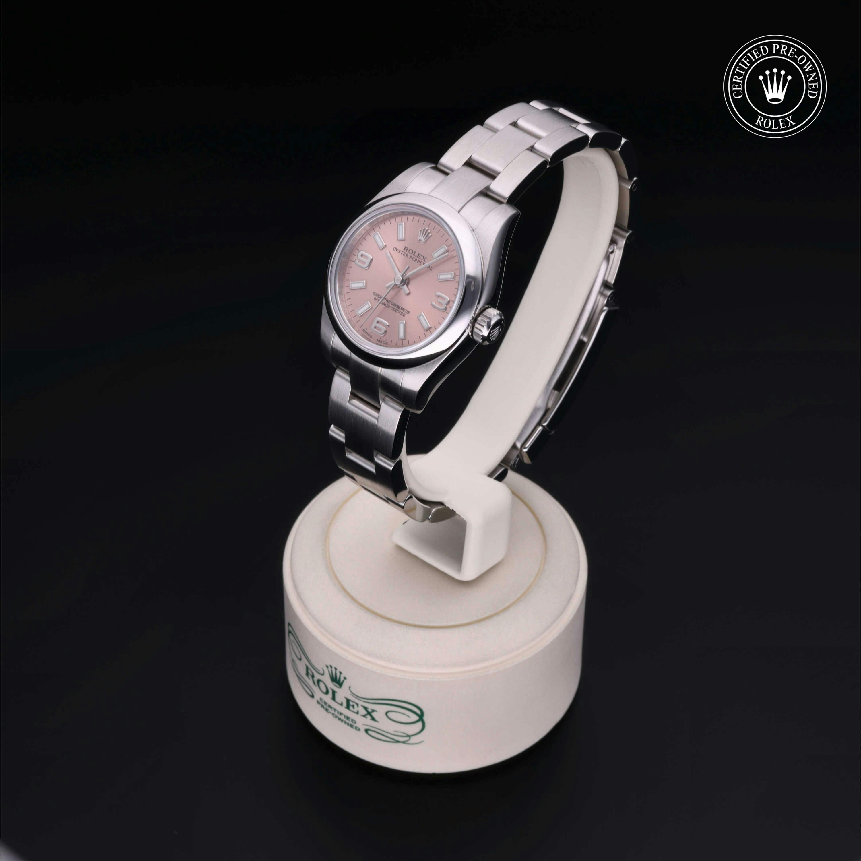 Rolex Certified Pre-Owned Oyster Perpetual (176200) self - winding automatic watch, features a 26mm stainless steel case and domed bezel surrounding a pink dial on a stainless steel oyster bracelet. Functions include hours, minutes and seconds. This watch has received Rolex-authorized service and certification. It does not come with the original box or papers, but includes a custom Rolex Certified Pre-Owned hang tag, travel pouch and RCPO international warranty card.