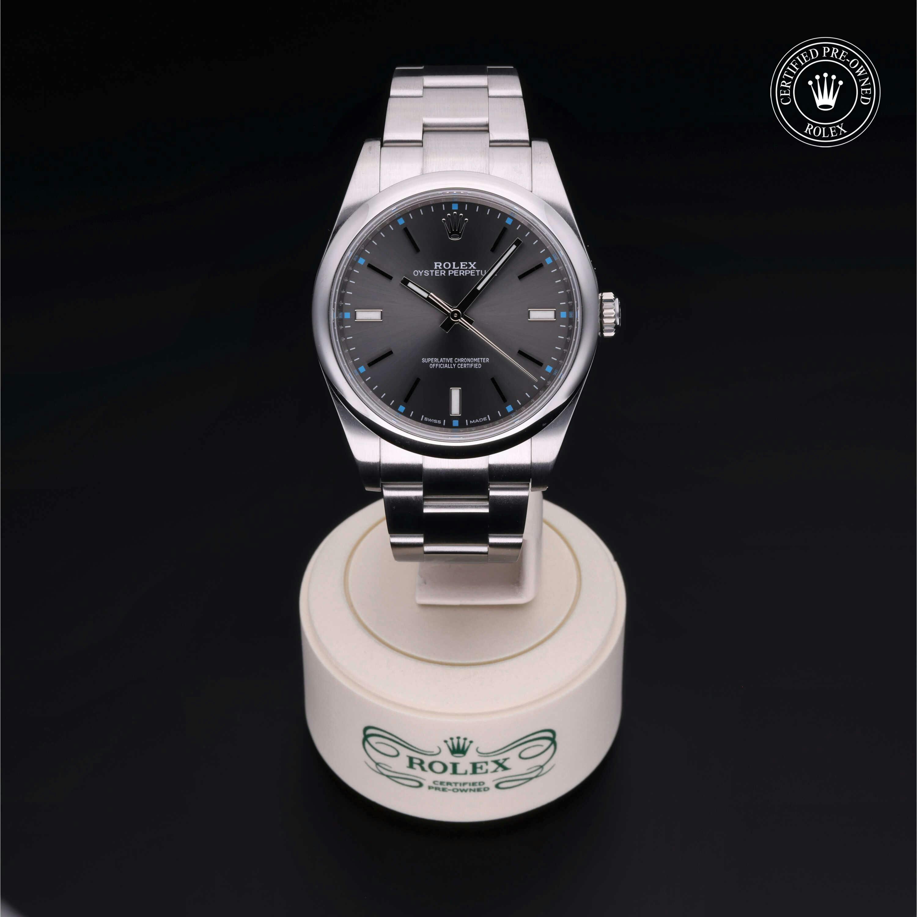 Rolex Certified Pre-Owned Oyster Perpetual (114300) self - winding automatic watch, features a 39mm stainless steel case and domed bezel surrounding a dark rhodium dial on a stainless steel oyster bracelet. Functions include hours, minutes and seconds. This watch has received Rolex-authorized service and certification. It does not come with the original box or papers, but includes a custom Rolex Certified Pre-Owned hang tag, travel pouch and RCPO international warranty card.