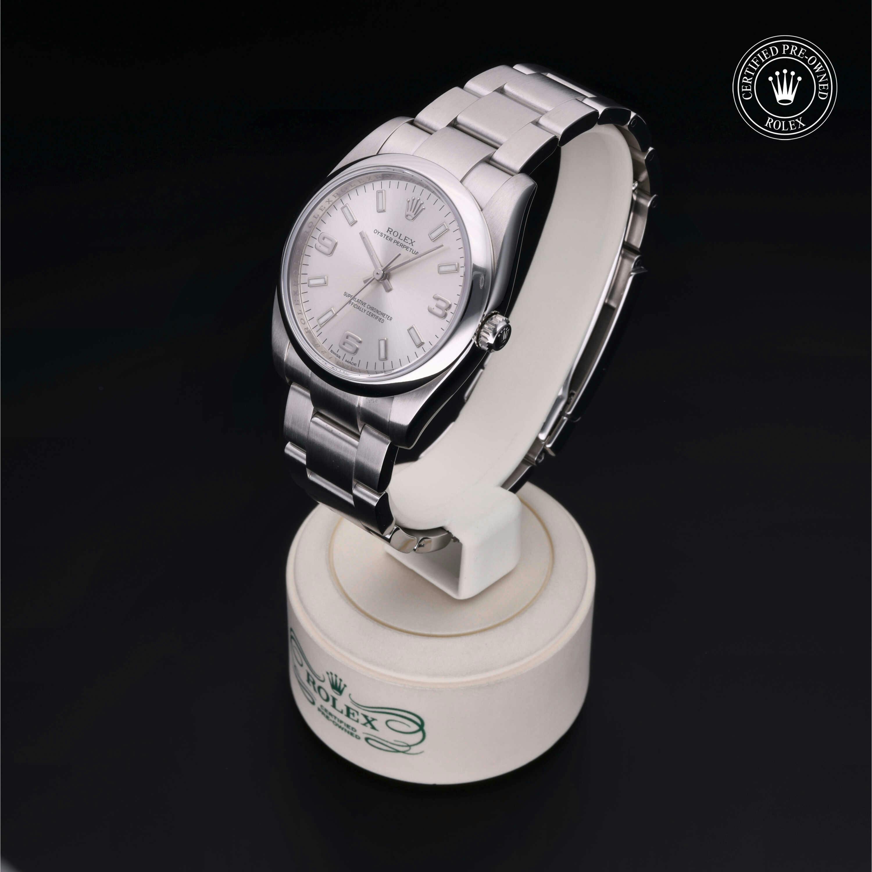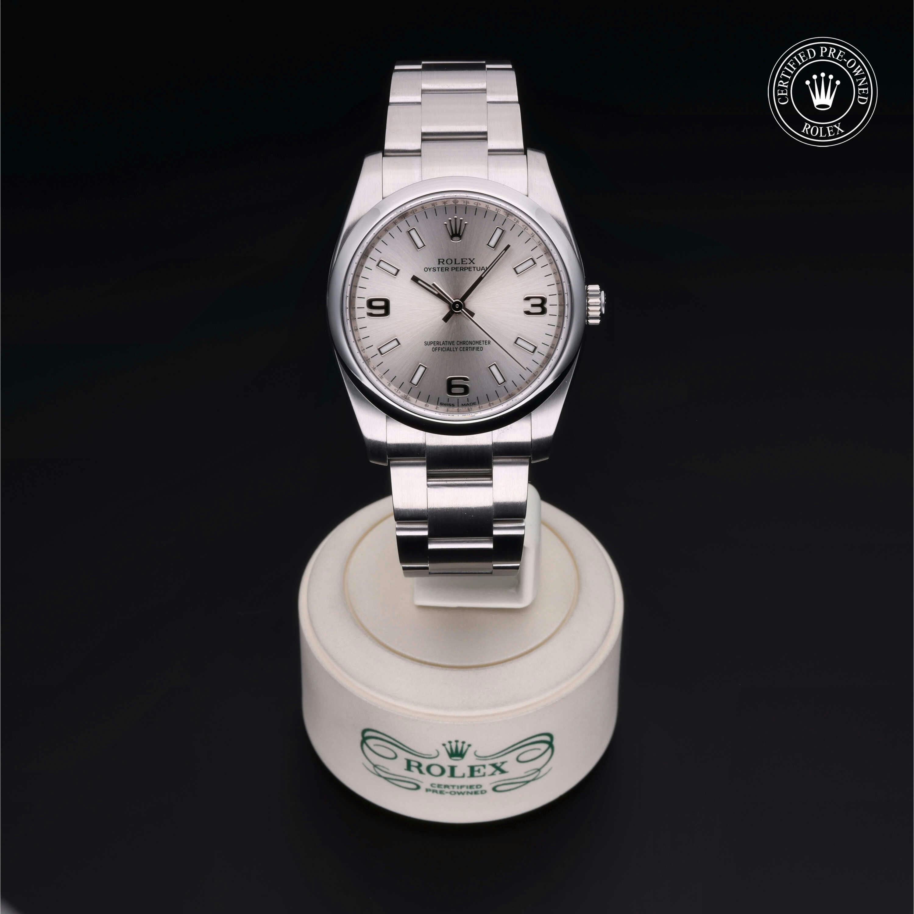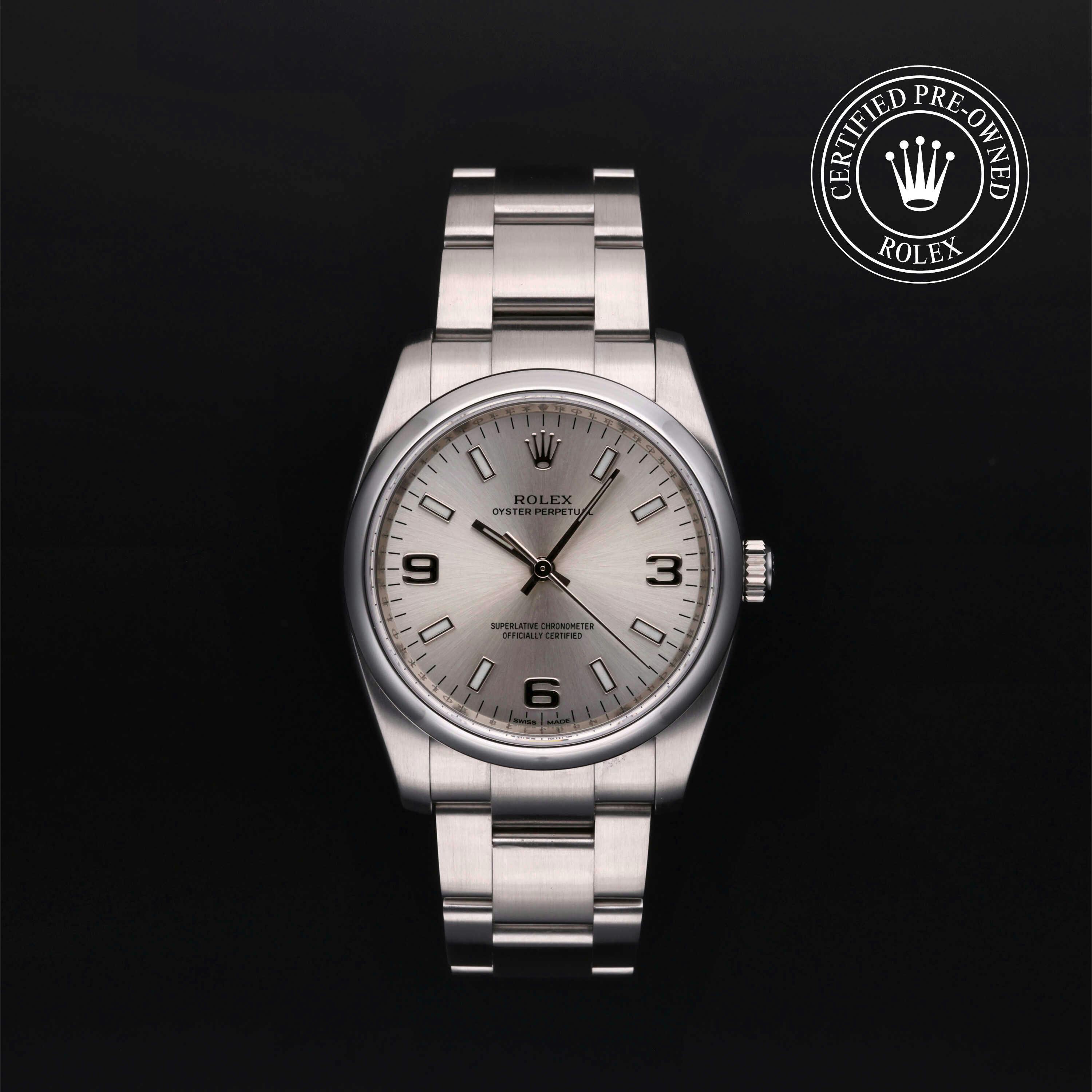 Rolex Certified Pre-Owned Oyster Perpetual (114200) self - winding automatic watch, features a 34mm stainless steel case and domed bezel surrounding a silver dial on a stainless steel oyster bracelet. Functions include hours, minutes and seconds. This watch has received Rolex-authorized service and certification. It does not come with the original box or papers, but includes a custom Rolex Certified Pre-Owned hang tag, travel pouch and RCPO international warranty card.