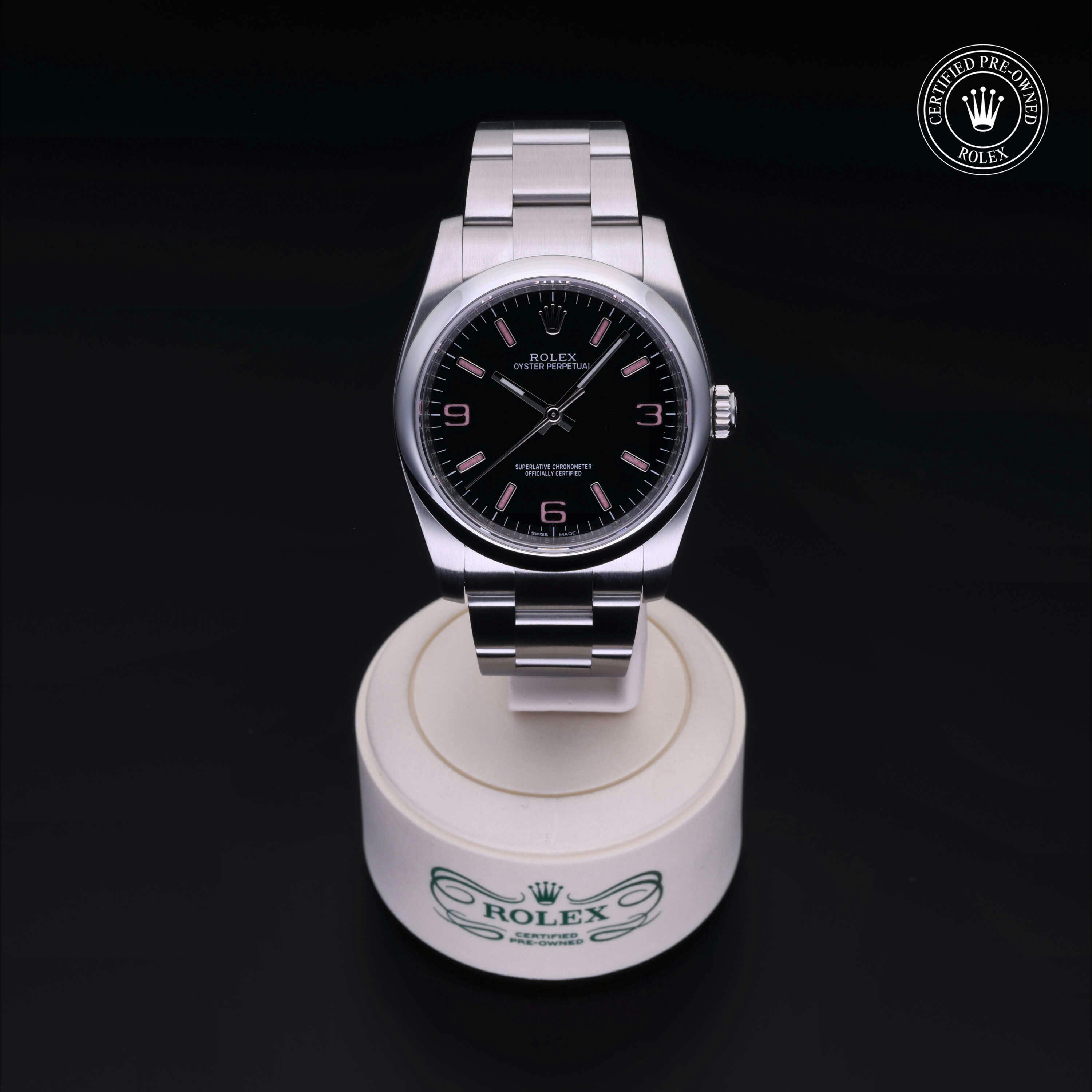 Rolex Certified Pre-Owned Oyster Perpetual (116000) self - winding automatic watch, features a 36mm stainless steel case and domed bezel surrounding a black dial on a stainless steel oyster bracelet. Functions include hours, minutes and seconds. This watch has received Rolex-authorized service and certification. It does not come with the original box or papers, but includes a custom Rolex Certified Pre-Owned hang tag, travel pouch and RCPO international warranty card.