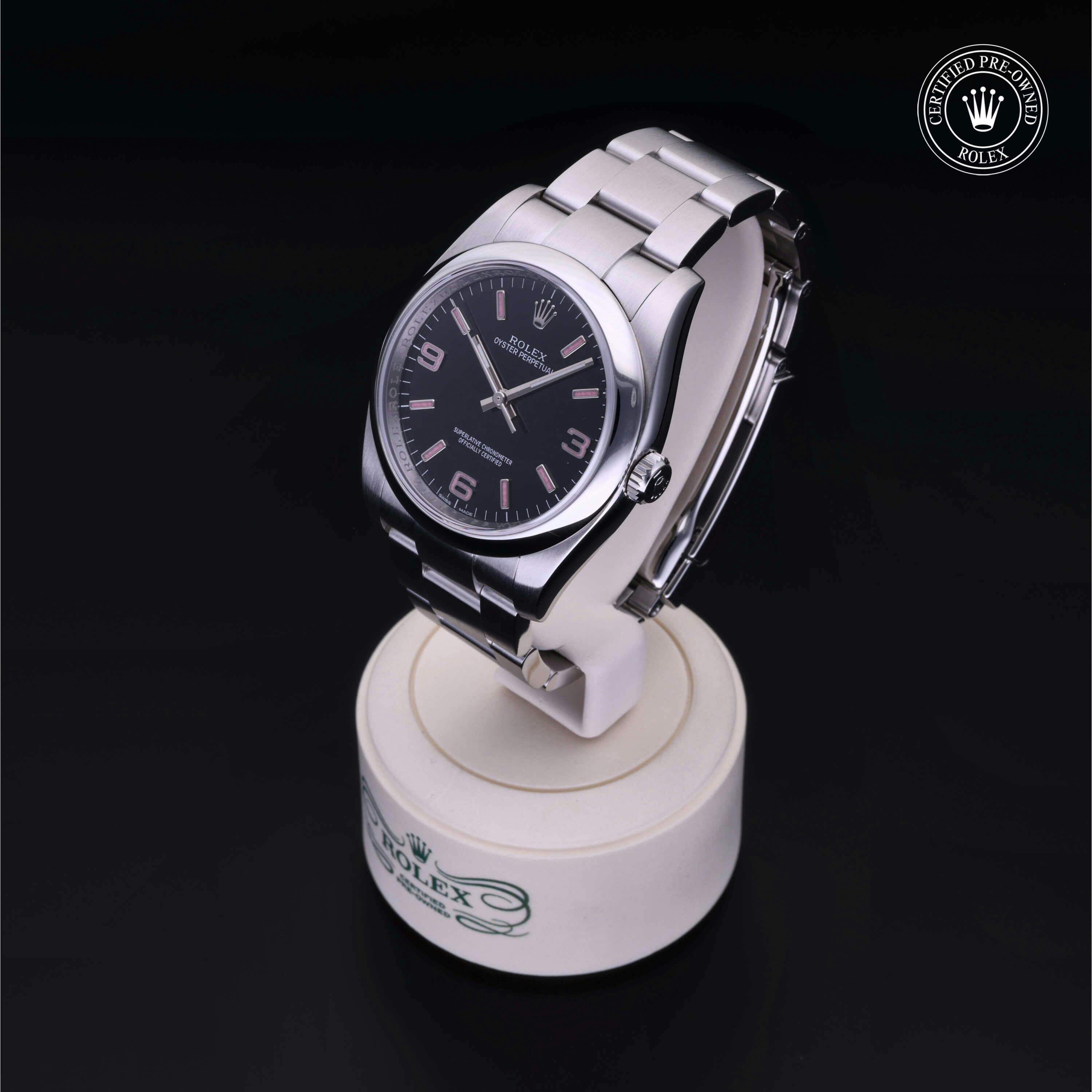 Rolex Certified Pre-Owned Oyster Perpetual (116000) self - winding automatic watch, features a 36mm stainless steel case and domed bezel surrounding a black dial on a stainless steel oyster bracelet. Functions include hours, minutes and seconds. This watch has received Rolex-authorized service and certification. It does not come with the original box or papers, but includes a custom Rolex Certified Pre-Owned hang tag, travel pouch and RCPO international warranty card.