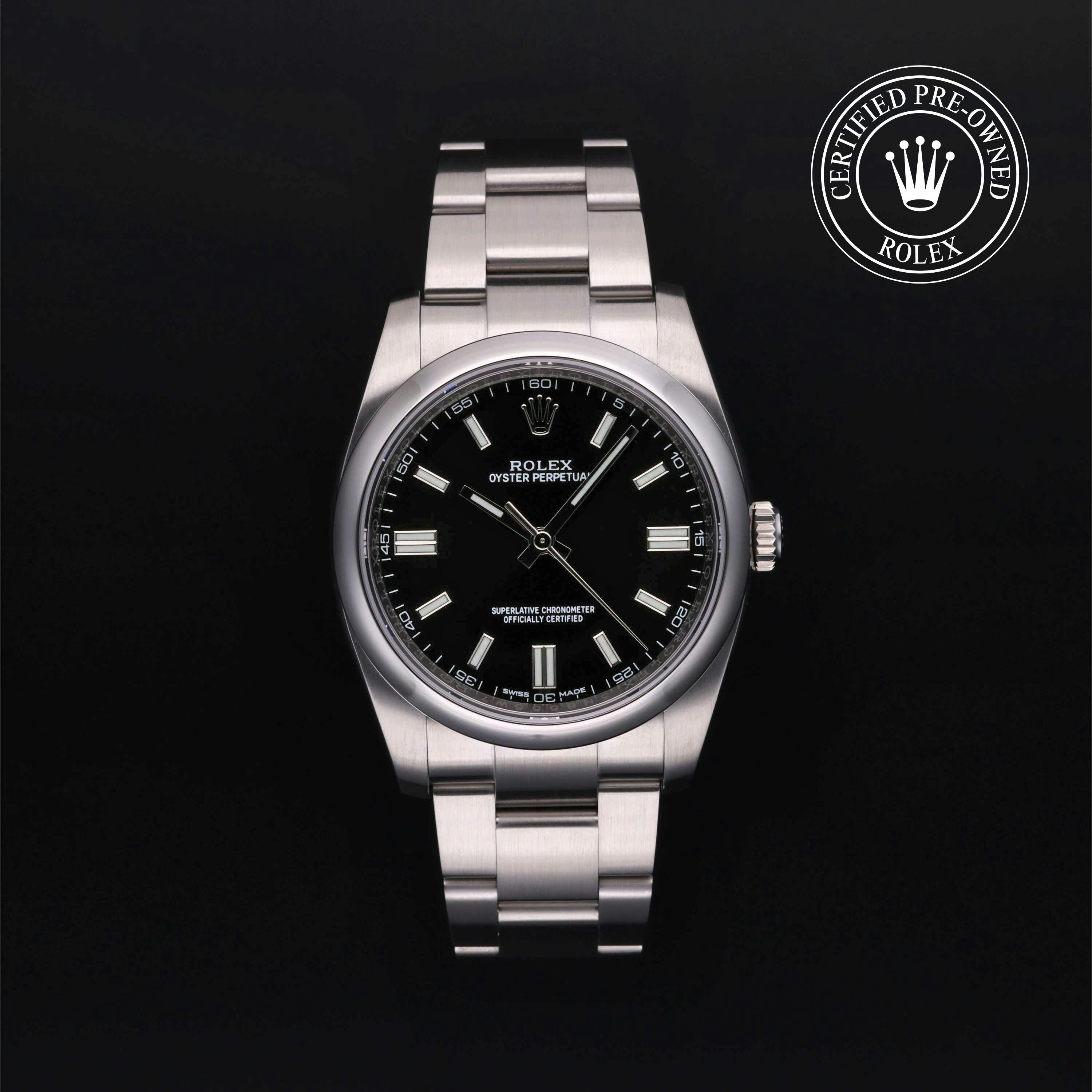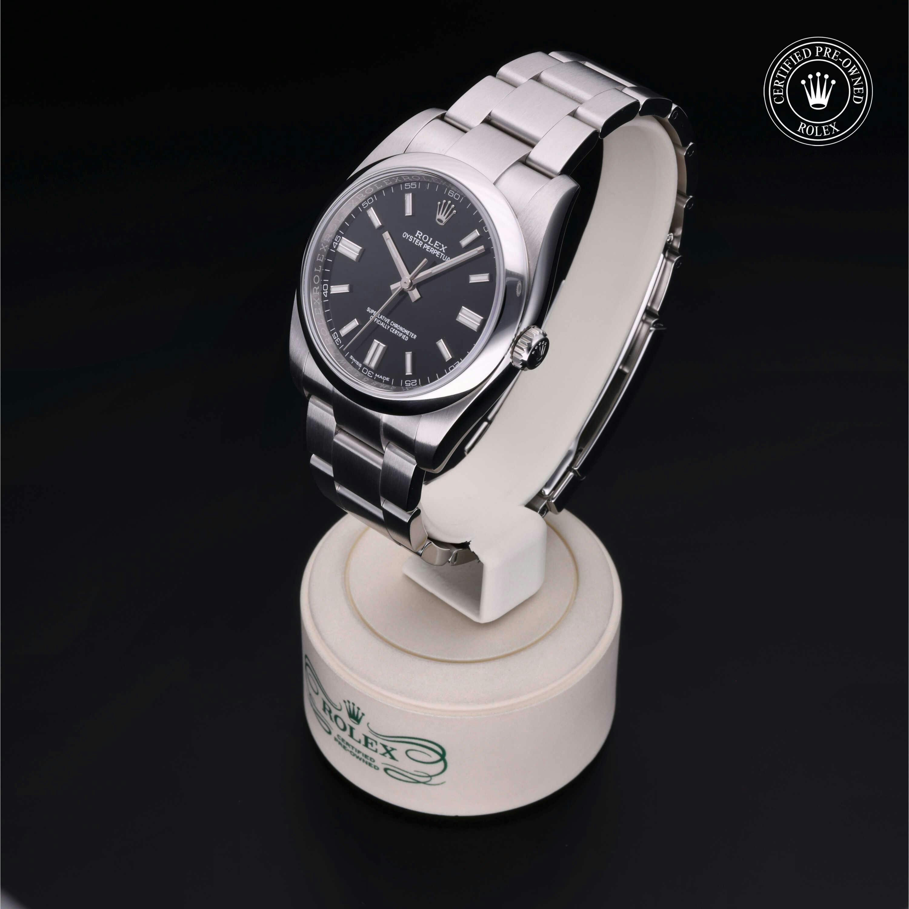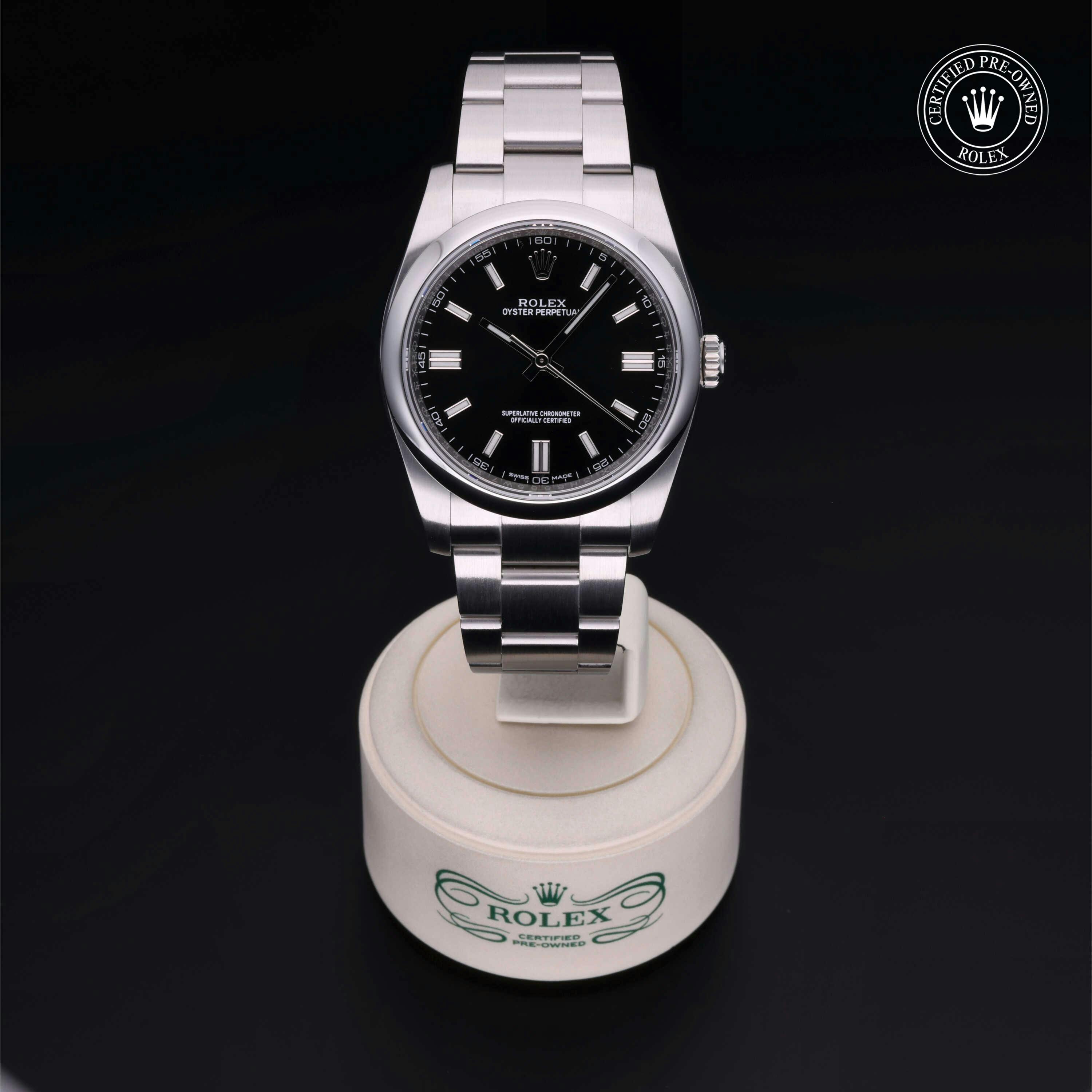 Rolex Certified Pre-Owned Oyster Perpetual (116000) self - winding automatic watch, features a 36mm stainless steel case and domed bezel surrounding a black dial on a stainless steel oyster bracelet. Functions include hours, minutes and seconds. This watch has received Rolex-authorized service and certification. It does not come with the original box or papers, but includes a custom Rolex Certified Pre-Owned hang tag, travel pouch and RCPO international warranty card.