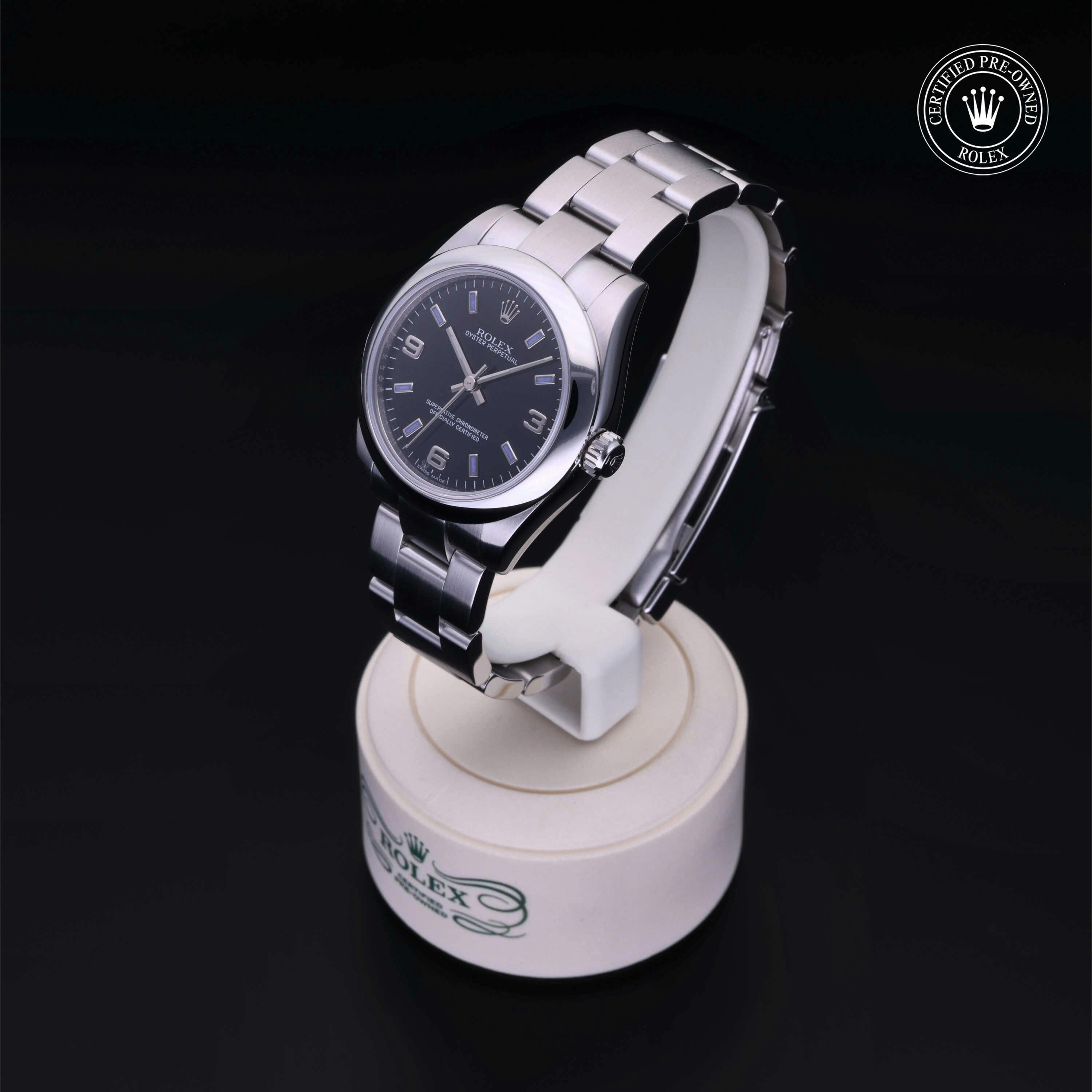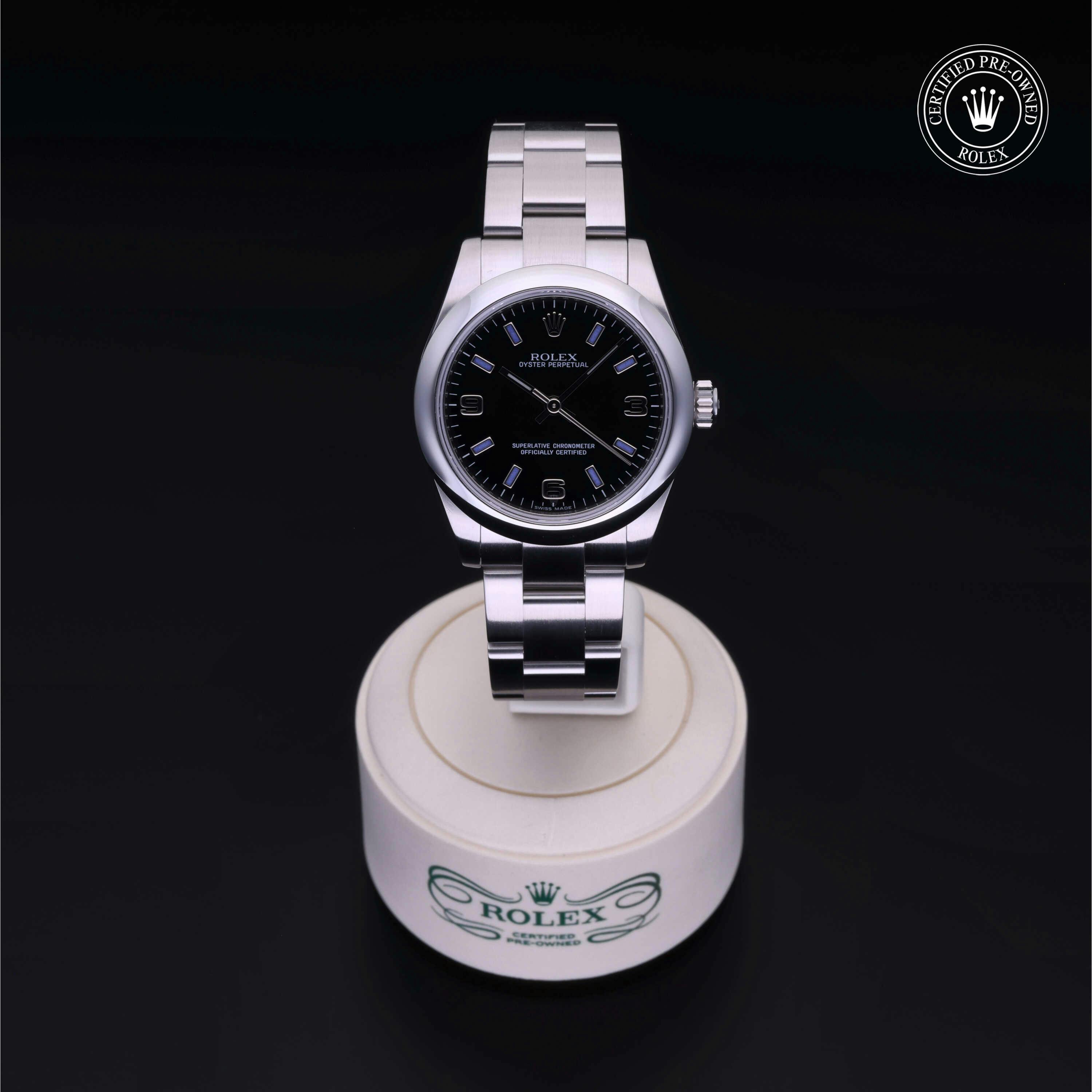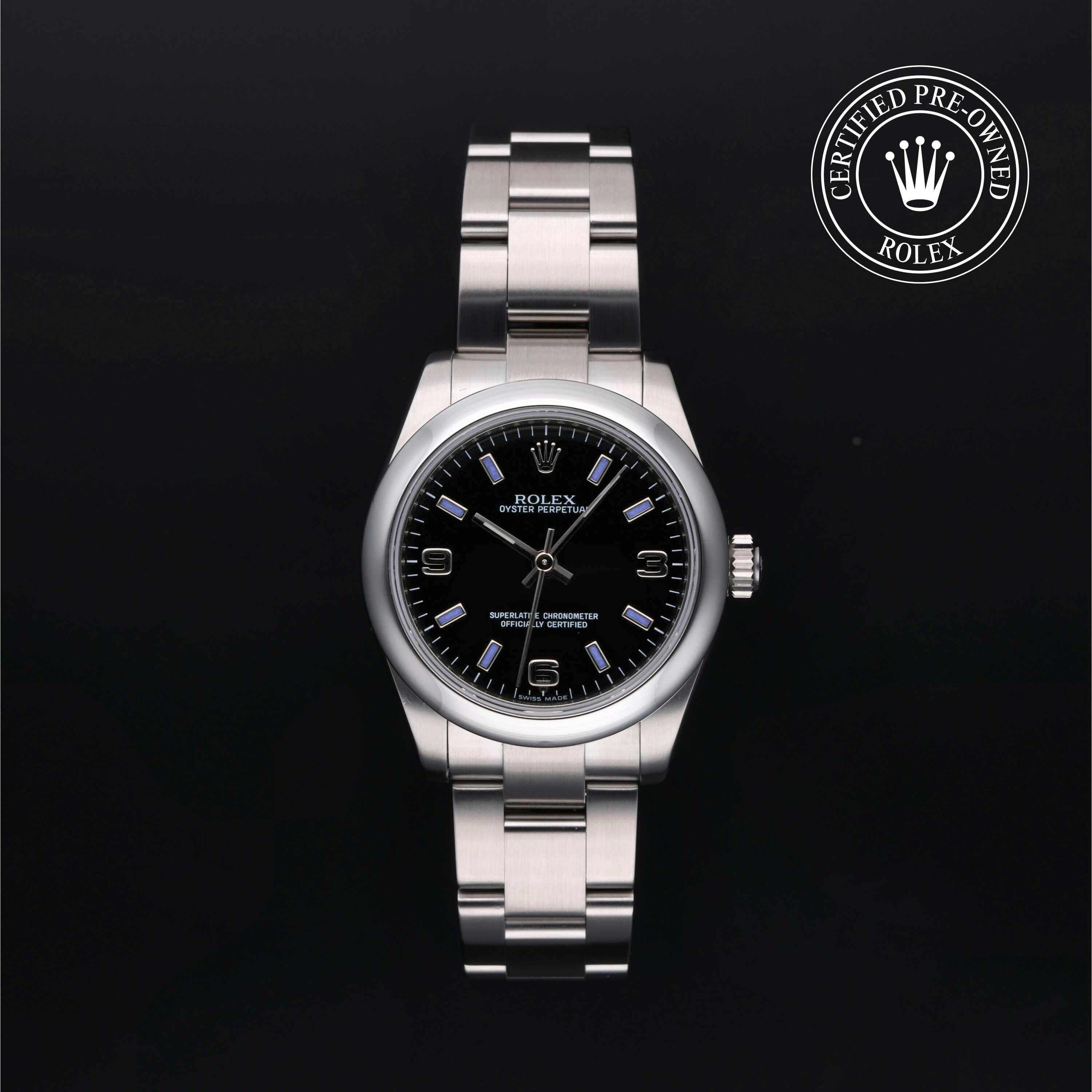 Rolex Certified Pre-owned Oyster Perpetual (177200) self - winding automatic watch, features a 31mm stainless steel case with a domed bezel surrounding a black dial. The watch is secured on a stainless steel Oyster bracelet complete with a folding buckle. Functions include hours, minutes and seconds. This watch has been serviced by an authorized service center and certified by Rolex. It does not come with the original box or papers, but includes a custom Rolex Certified Pre-Owned hang tag, travel pouch and international warranty card.
