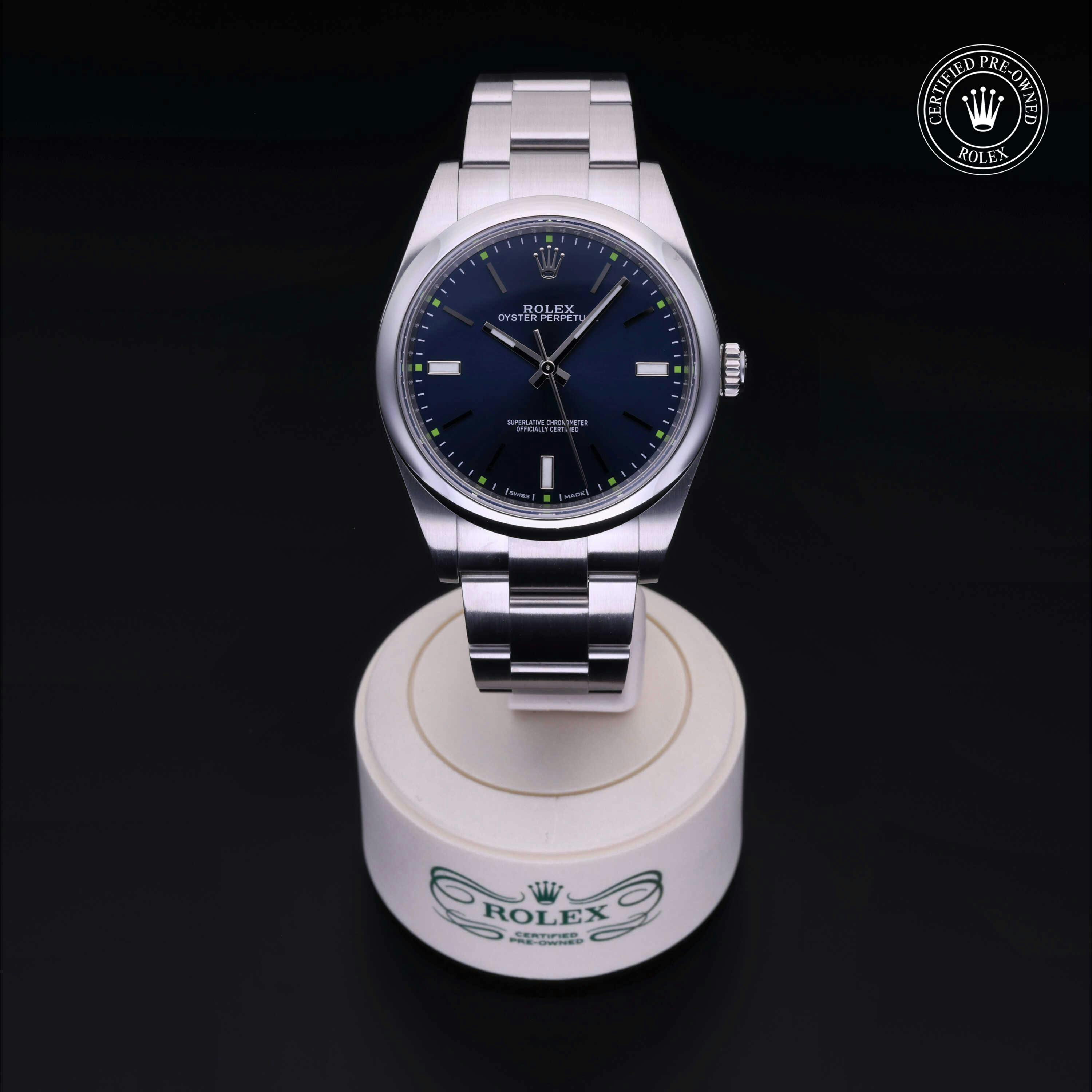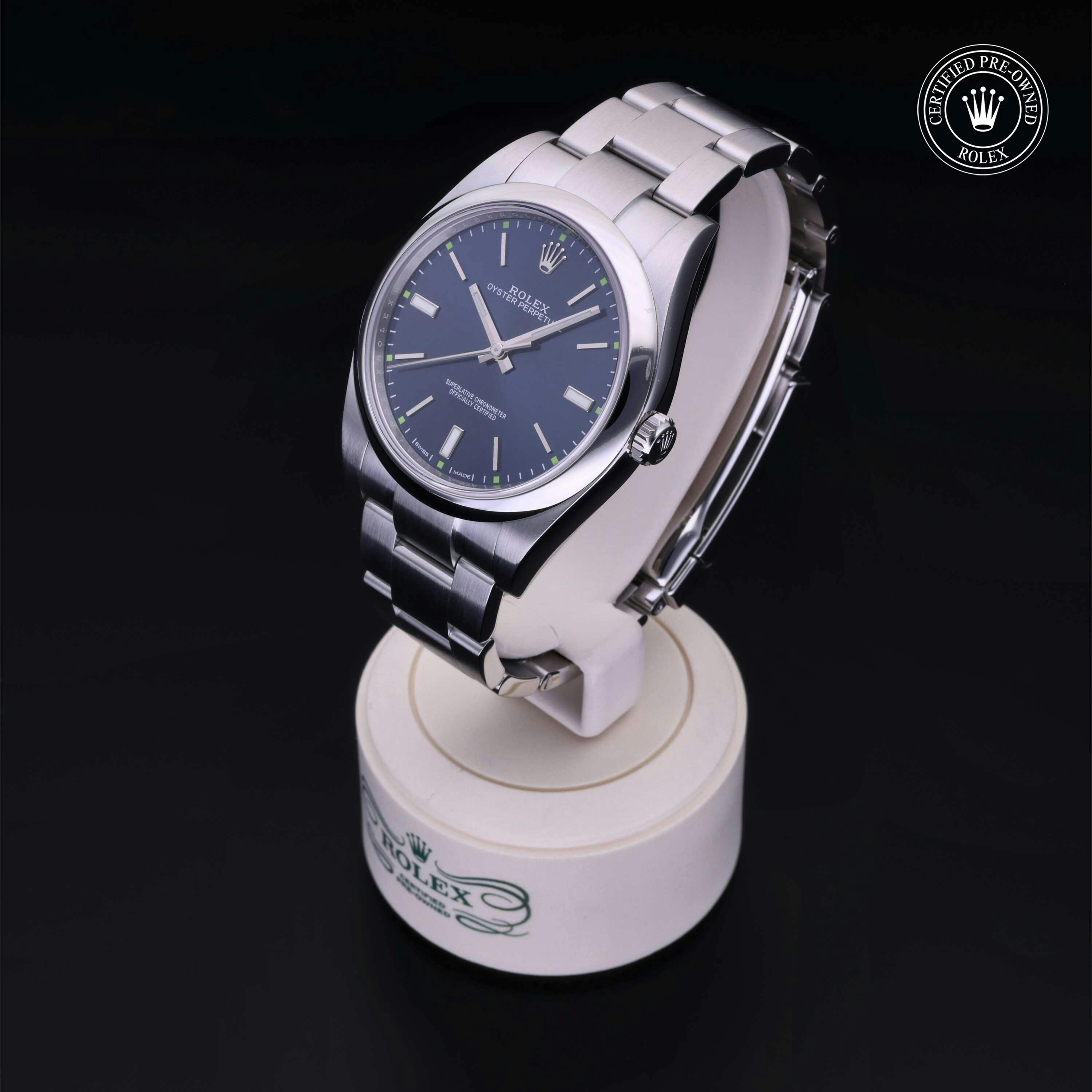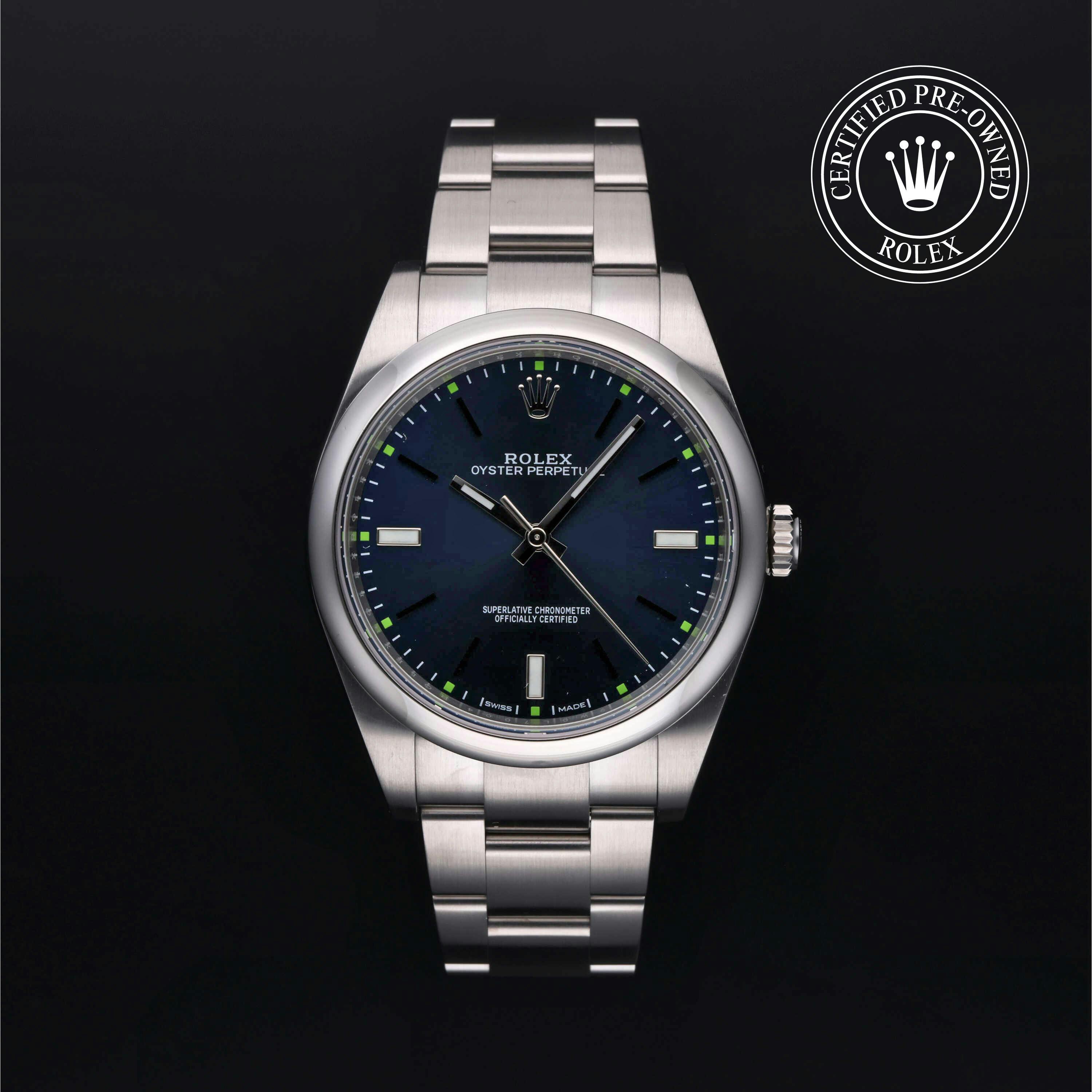 Rolex Certified Pre-Owned Oyster Perpetual (114300) self - winding automatic watch, features a 39mm stainless steel case and domed bezel surrounding a blue dial on a stainless steel oyster bracelet. Functions include hours, minutes and seconds. This watch has received Rolex-authorized service and certification. It comes with the original box, and includes a custom Rolex Certified Pre-Owned hang tag, travel pouch and RCPO international warranty card.