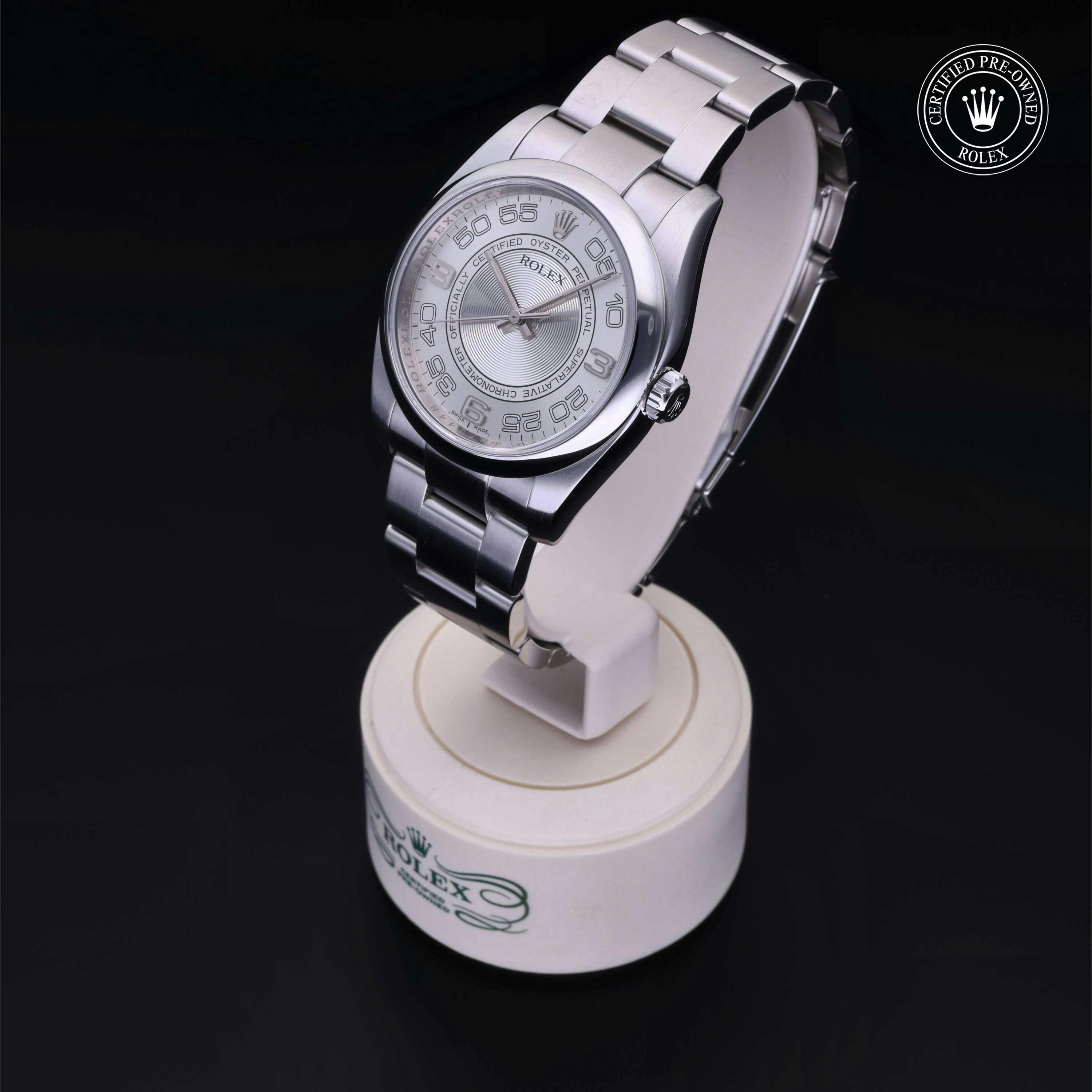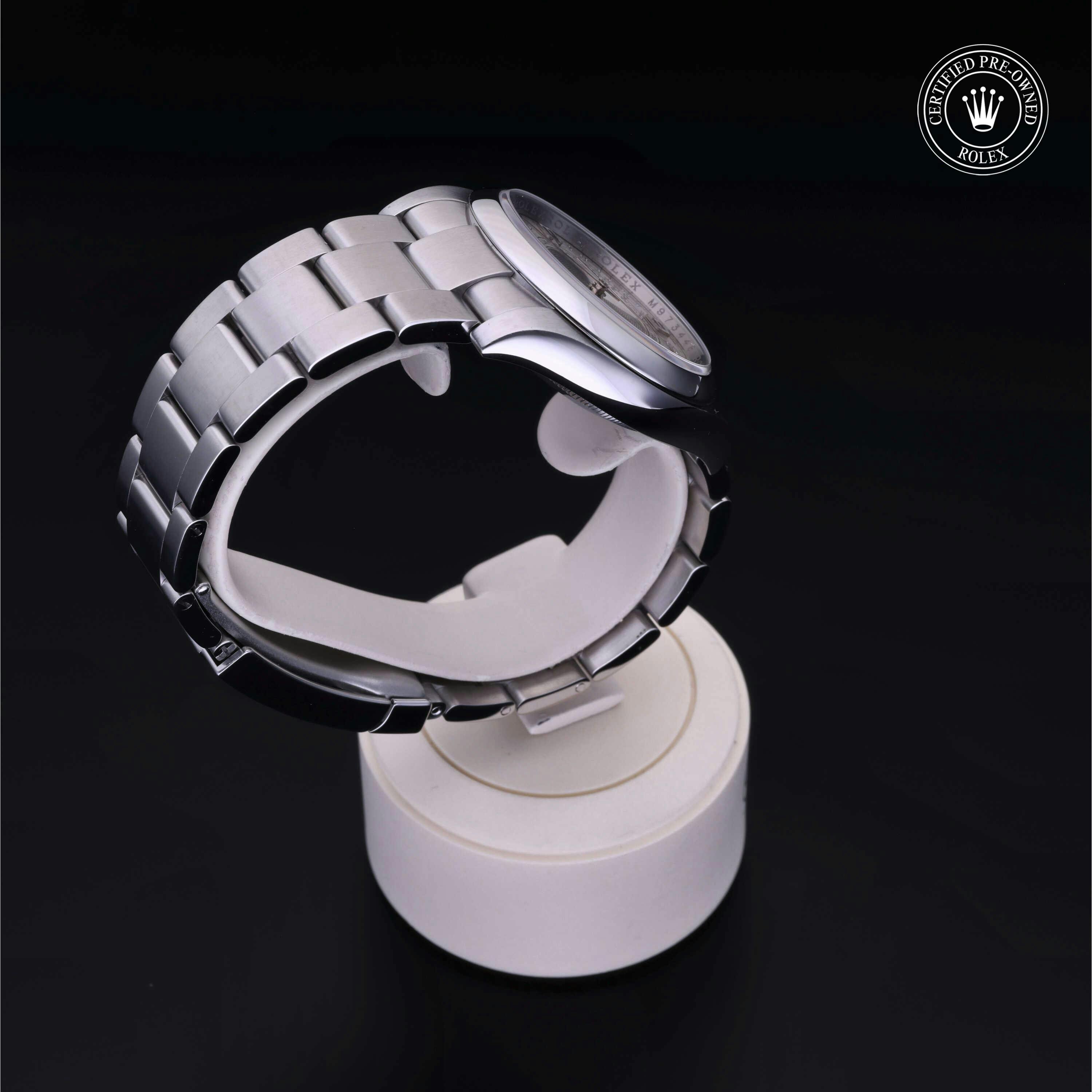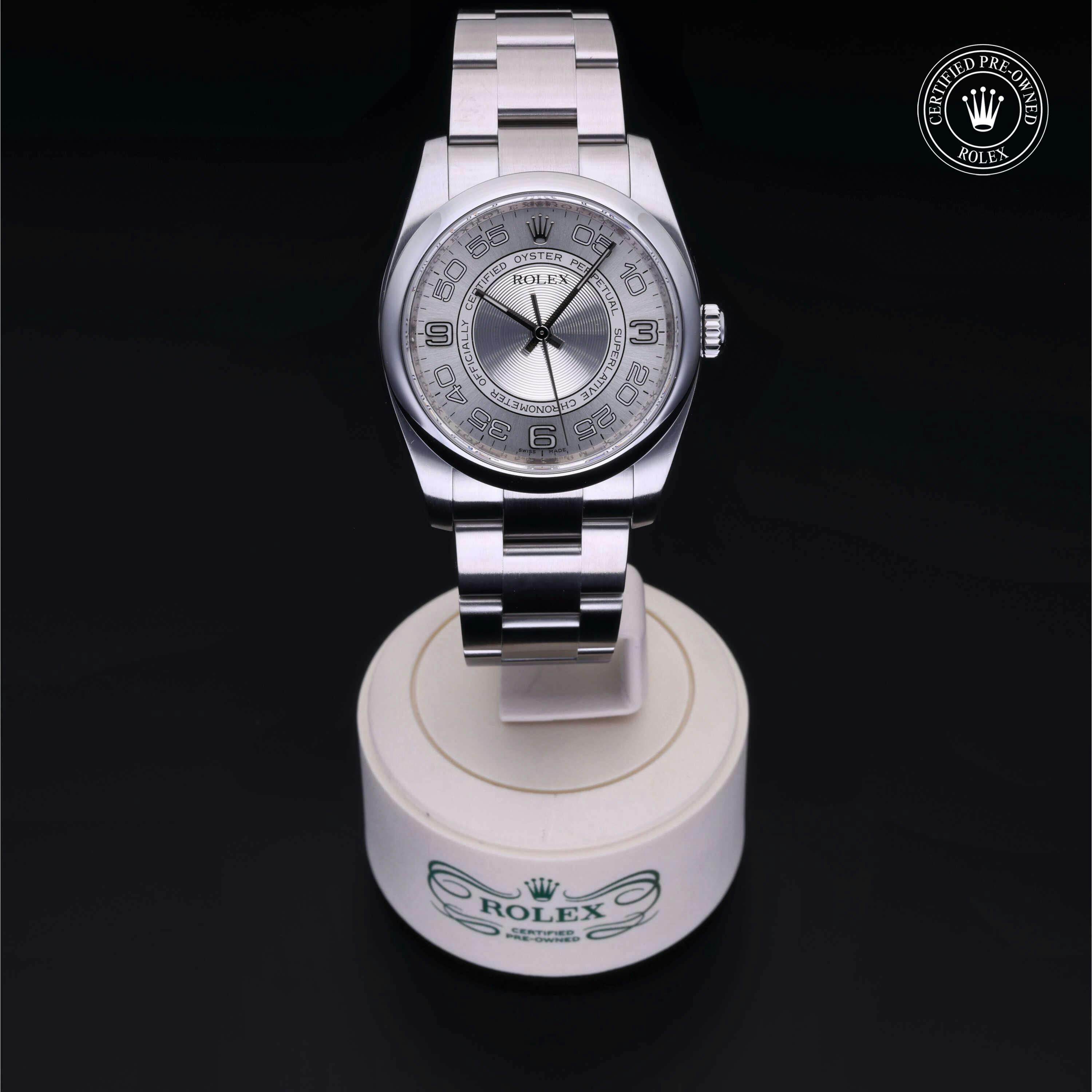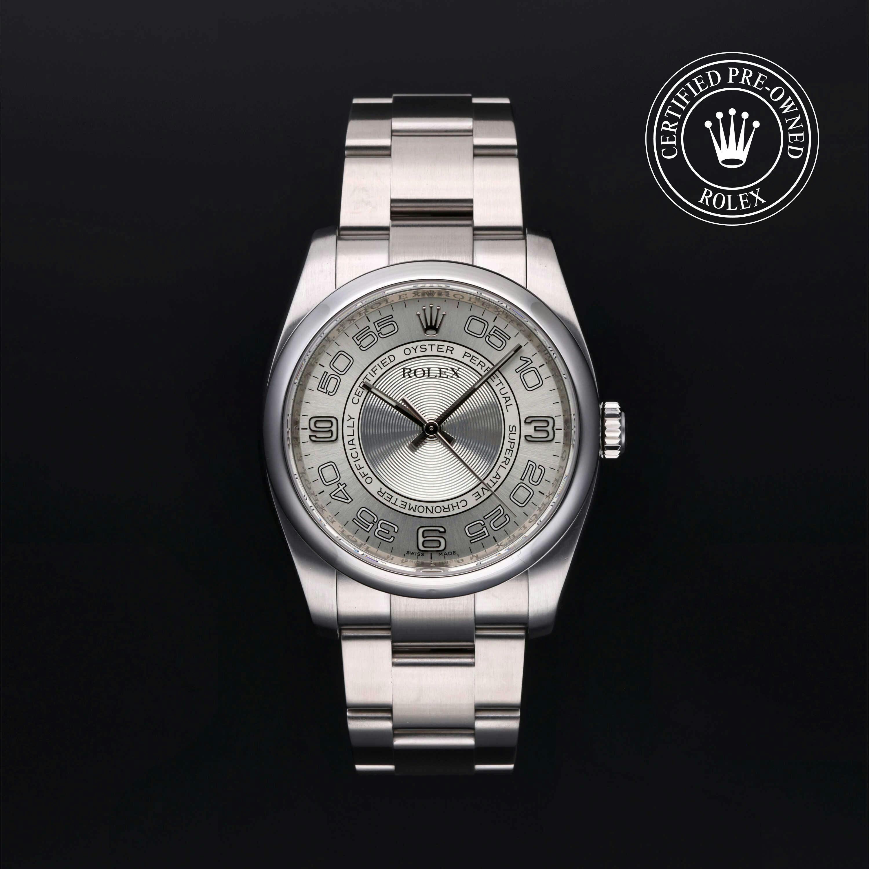 Rolex Certified Pre-Owned Oyster Perpetual (116000) self - winding automatic watch, features a 36mm stainless steel case and domed bezel surrounding a silver Concentric dial on a stainless steel oyster bracelet. Functions include hours, minutes and seconds. This watch has received Rolex-authorized service and certification. It comes with the original papers, and includes a custom Rolex Certified Pre-Owned hang tag, travel pouch and RCPO international warranty card.