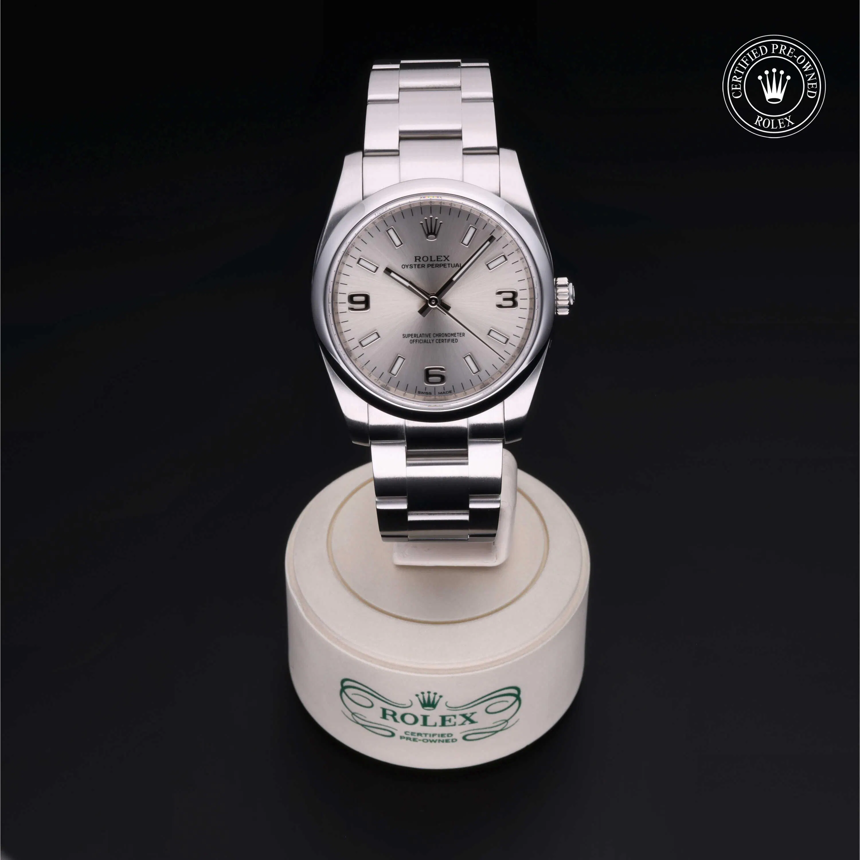 Rolex Certified Pre-Owned Oyster Perpetual (114200) self - winding automatic watch, features a 34mm stainless steel case and domed bezel surrounding a silver dial on a stainless steel oyster bracelet. Functions include hours, minutes and seconds. This watch has received Rolex-authorized service and certification. It does not come with the original box or papers, but includes a custom Rolex Certified Pre-Owned hang tag, travel pouch and RCPO international warranty card.