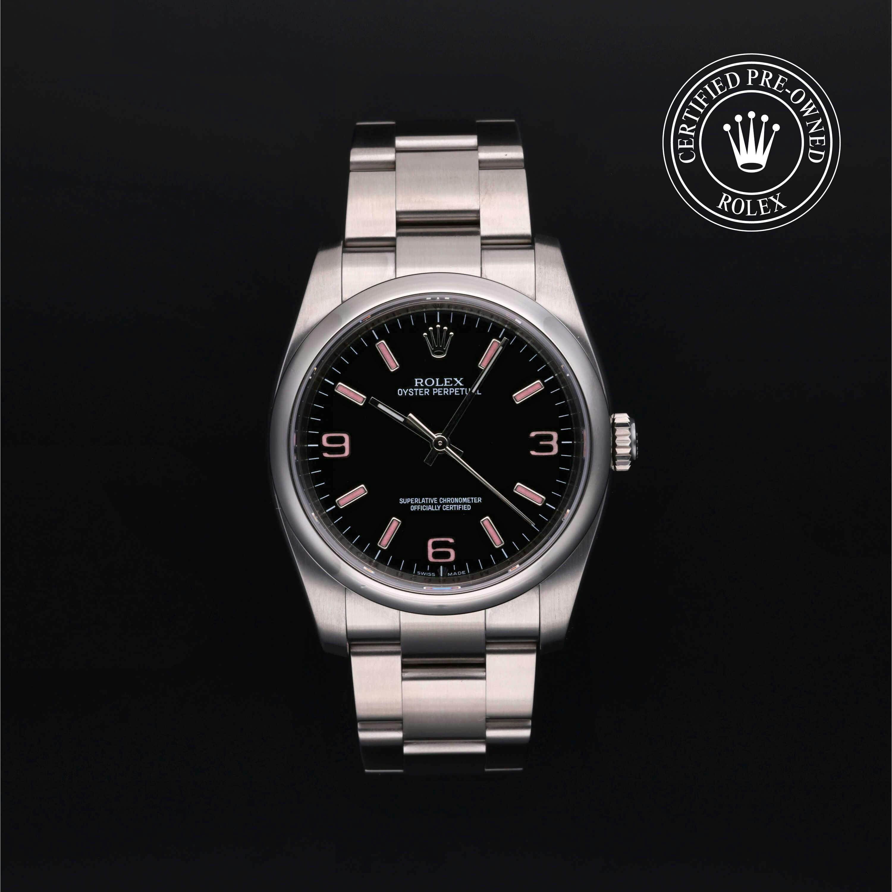 Rolex Certified Pre-Owned Oyster Perpetual (116000) self - winding automatic watch, features a 36mm stainless steel case and domed bezel surrounding a black dial on a stainless steel oyster bracelet. Functions include hours, minutes and seconds. This watch has received Rolex-authorized service and certification. It does not come with the original box or papers, but includes a custom Rolex Certified Pre-Owned hang tag, travel pouch and RCPO international warranty card.