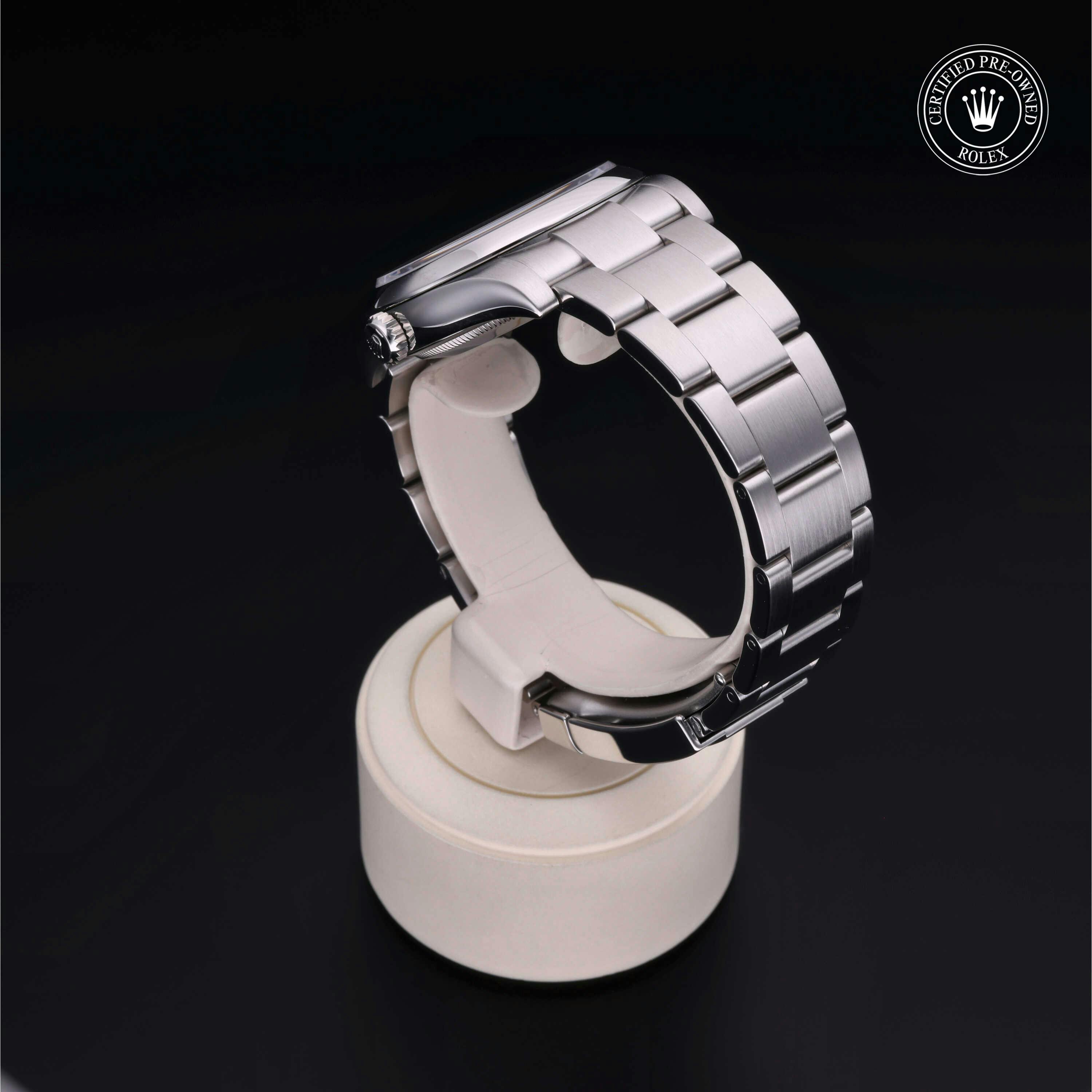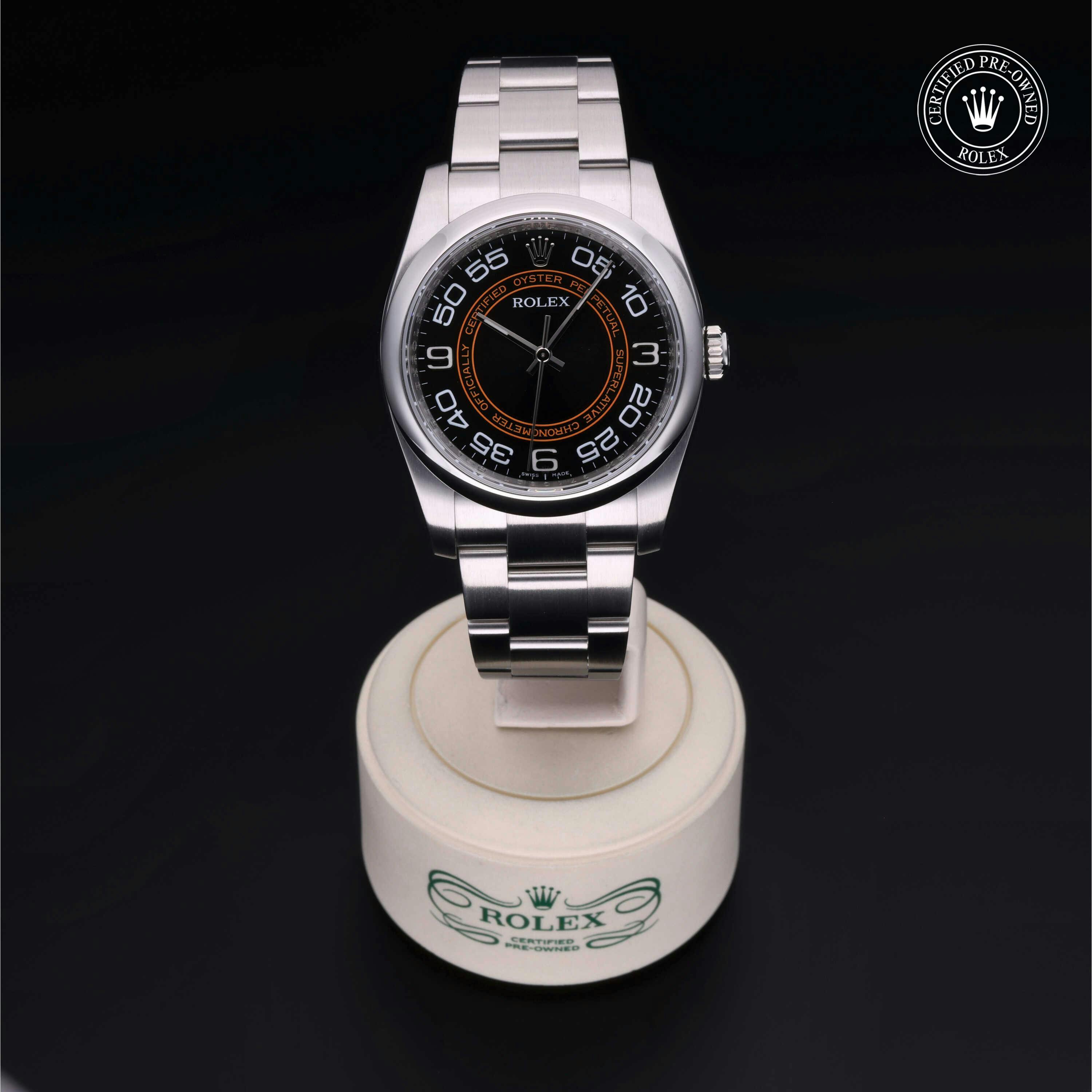 Rolex Certified Pre-Owned Oyster Perpetual (116000) self - winding automatic watch, features a 36mm stainless steel case and domed bezel surrounding a black dial on a stainless steel oyster bracelet. Functions include hours, minutes and seconds. This watch has received Rolex-authorized service and certification. It comes with the original papers, and includes a custom Rolex Certified Pre-Owned hang tag, travel pouch and RCPO international warranty card.