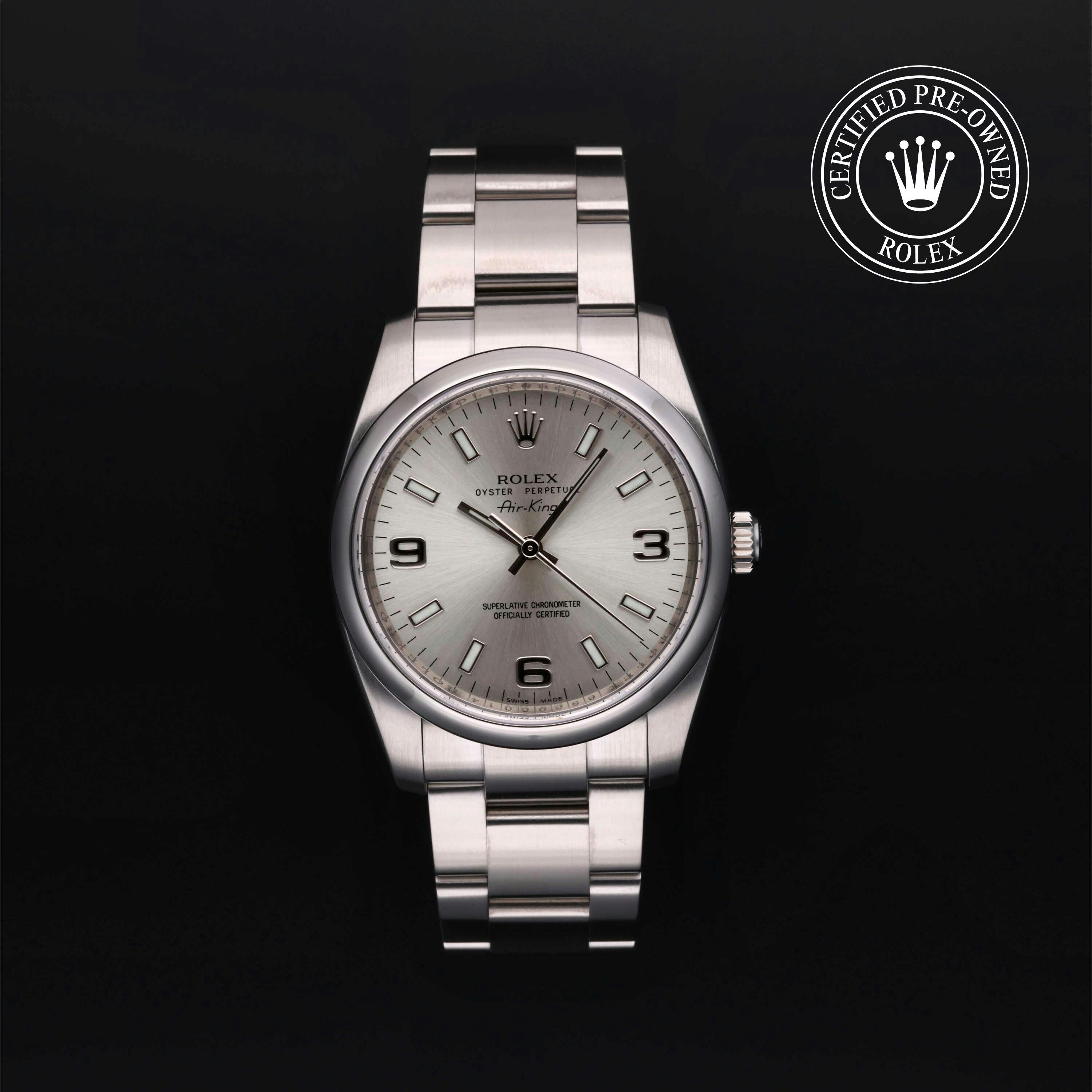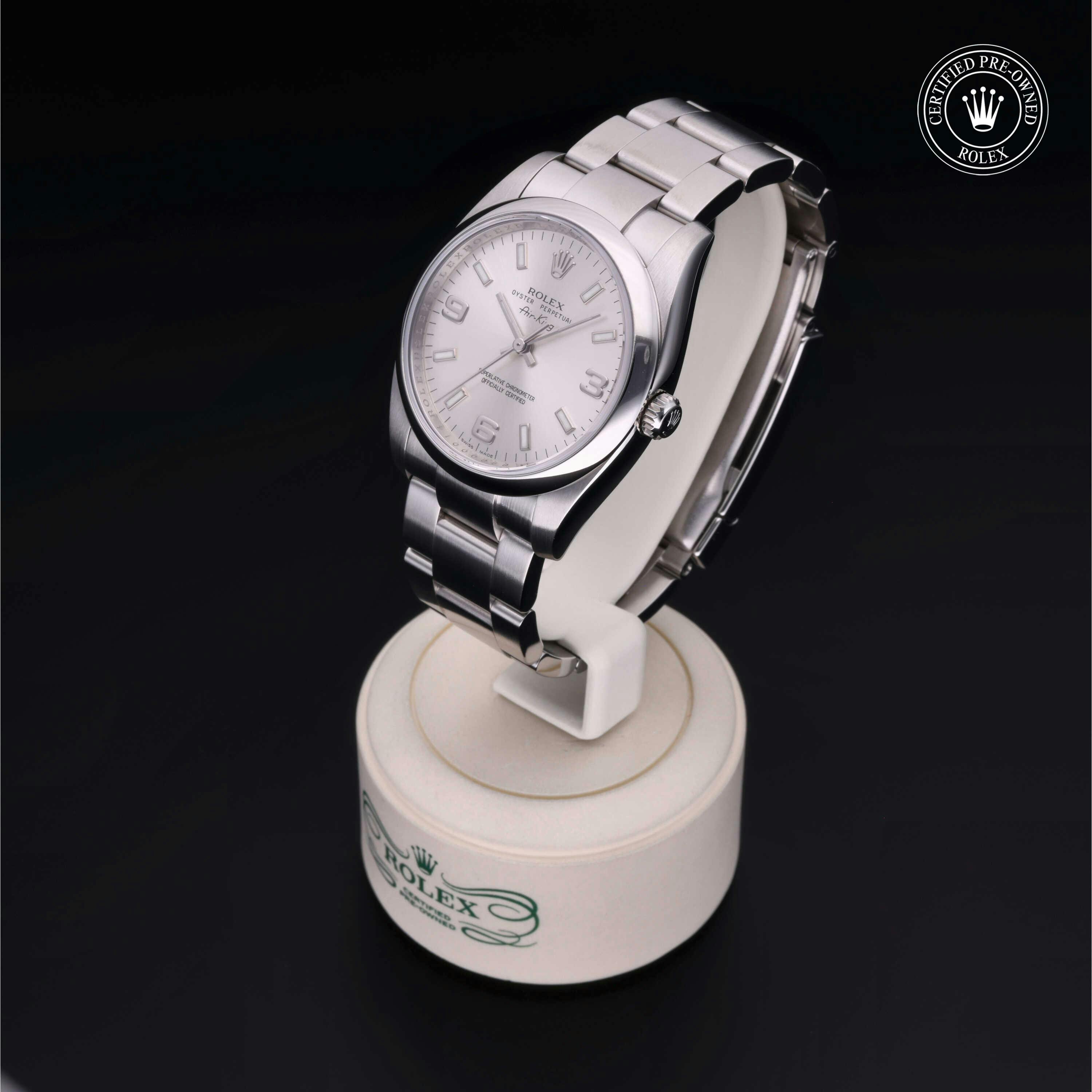 Rolex Certified Pre-Owned Oyster Perpetual (114200) self - winding automatic watch, features a 34mm stainless steel case and domed bezel surrounding a silver dial on a stainless steel oyster bracelet. Functions include hours, minutes and seconds. This watch has received Rolex-authorized service and certification. It does not come with the original box or papers, but includes a custom Rolex Certified Pre-Owned hang tag, travel pouch and RCPO international warranty card.