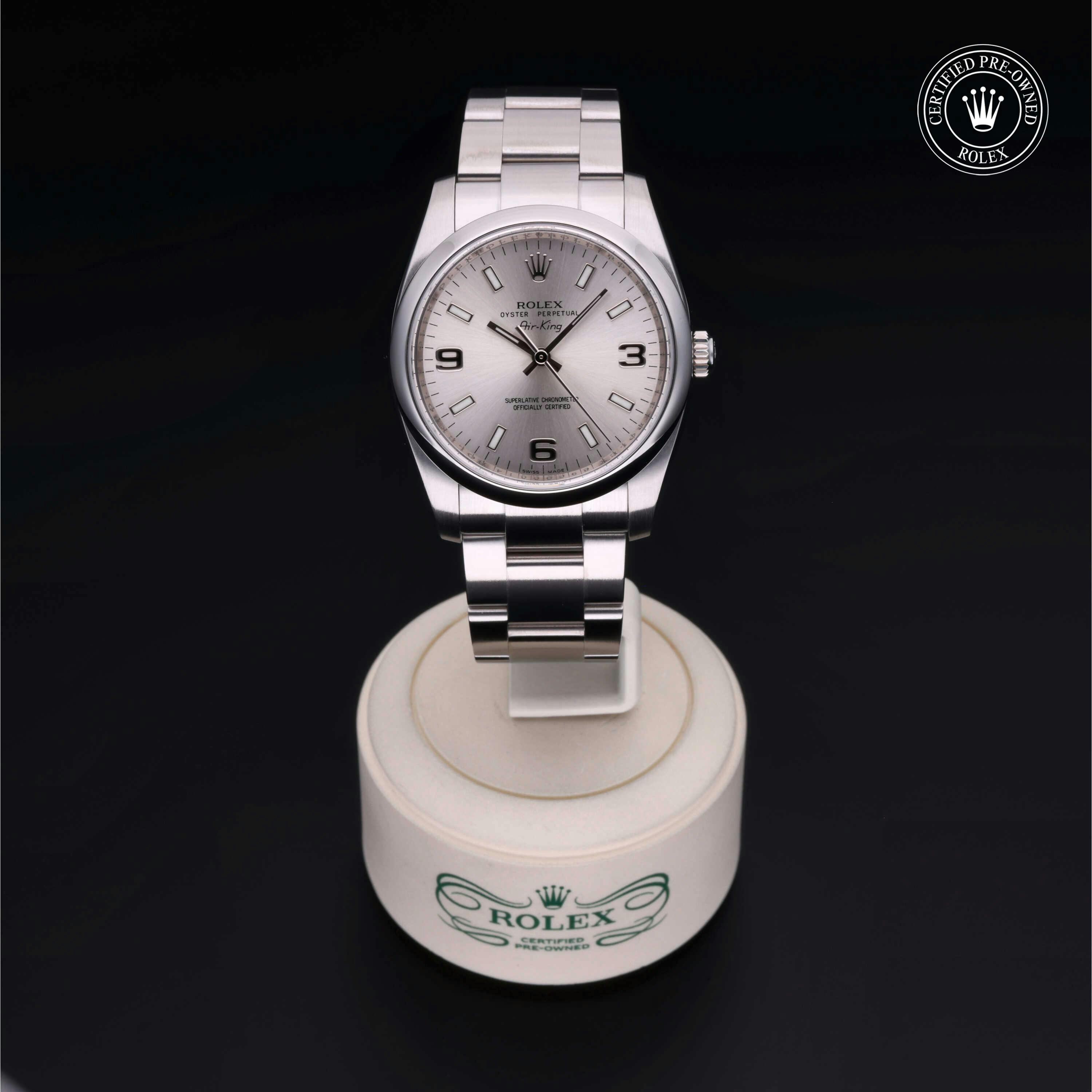 Rolex Certified Pre-Owned Oyster Perpetual (114200) self - winding automatic watch, features a 34mm stainless steel case and domed bezel surrounding a silver dial on a stainless steel oyster bracelet. Functions include hours, minutes and seconds. This watch has received Rolex-authorized service and certification. It does not come with the original box or papers, but includes a custom Rolex Certified Pre-Owned hang tag, travel pouch and RCPO international warranty card.