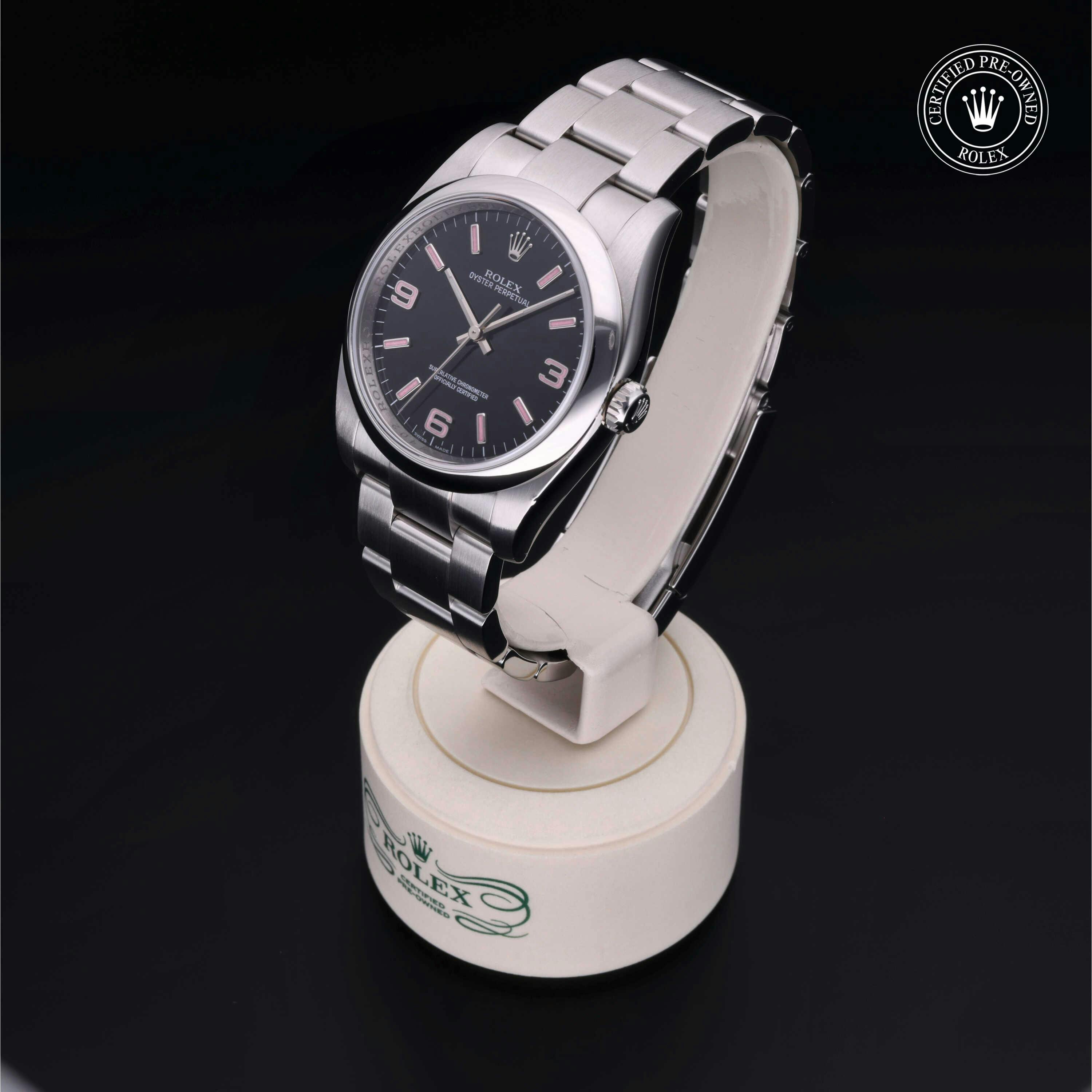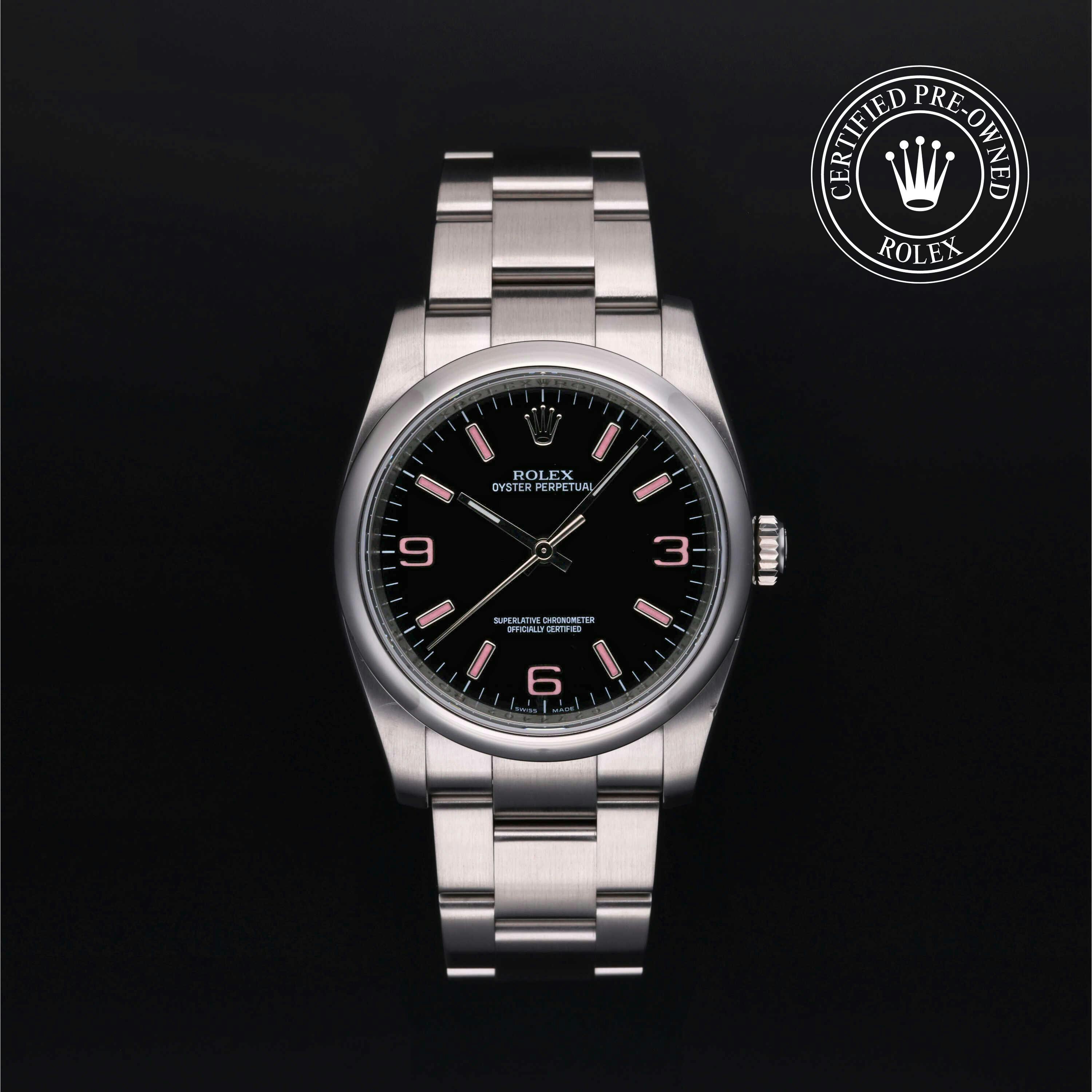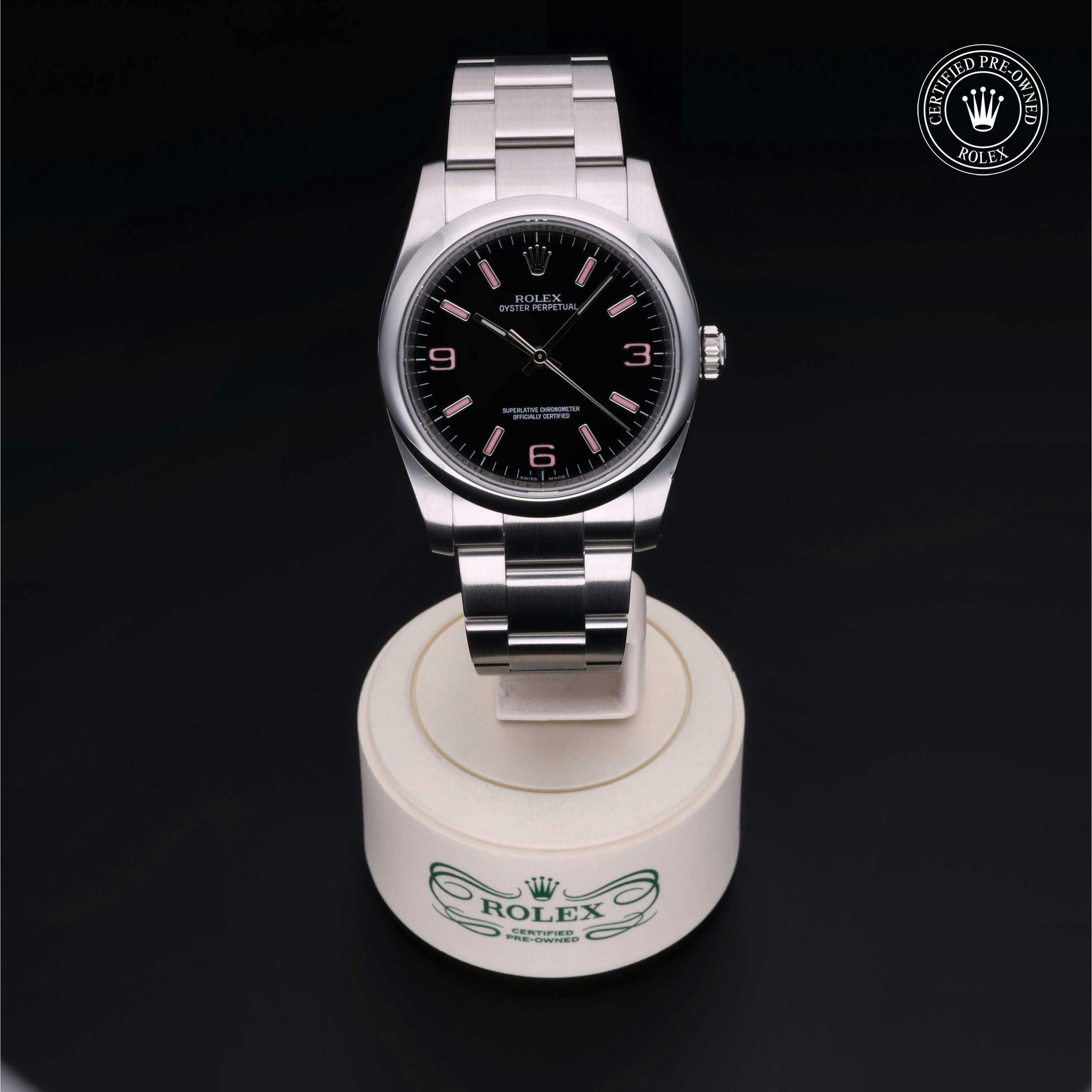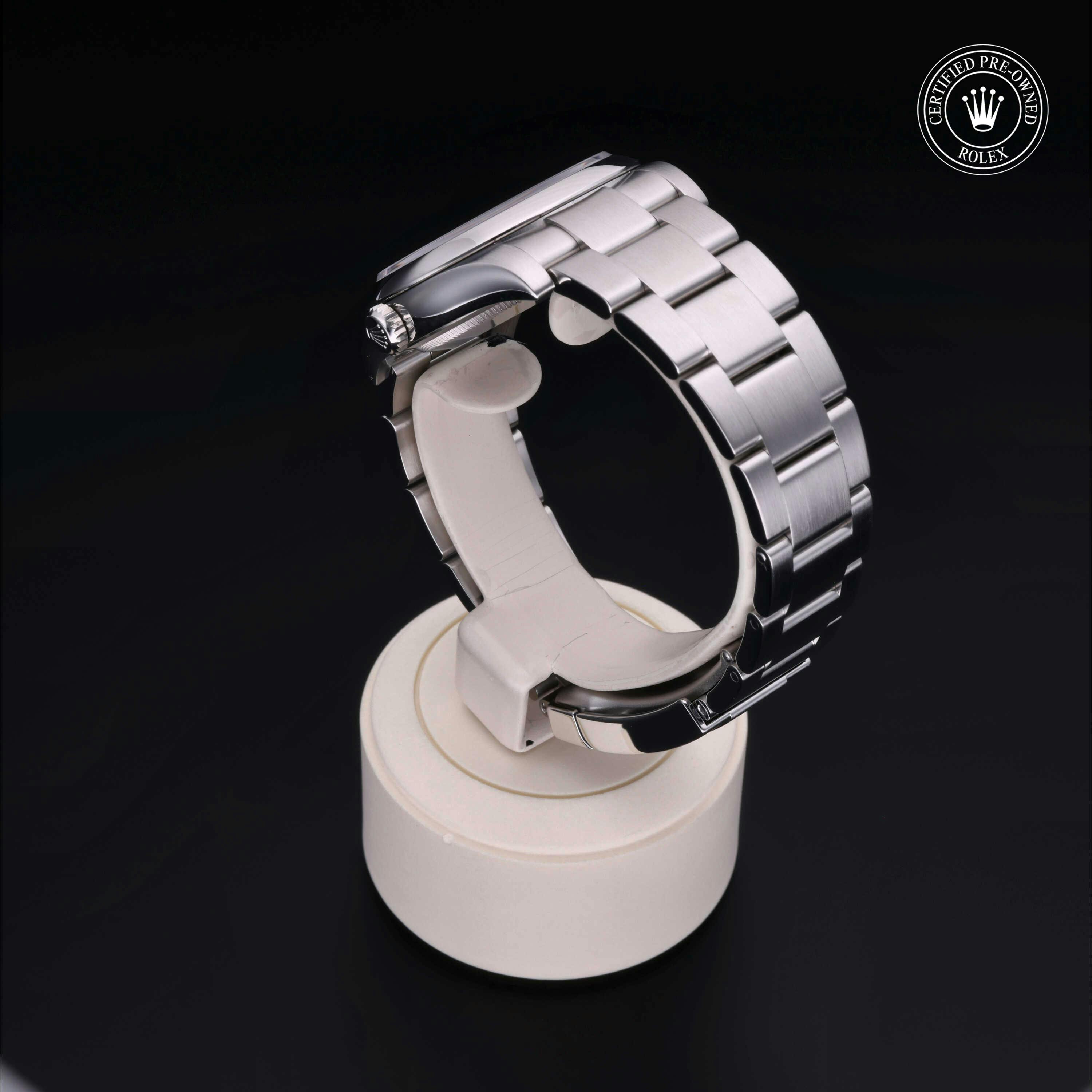 Rolex Certified Pre-Owned Oyster Perpetual (116000) self - winding automatic watch, features a 36mm stainless steel case and domed bezel surrounding a black dial on a stainless steel oyster bracelet. Functions include hours, minutes and seconds. This watch has received Rolex-authorized service and certification. It does not come with the original box or papers, but includes a custom Rolex Certified Pre-Owned hang tag, travel pouch and RCPO international warranty card.