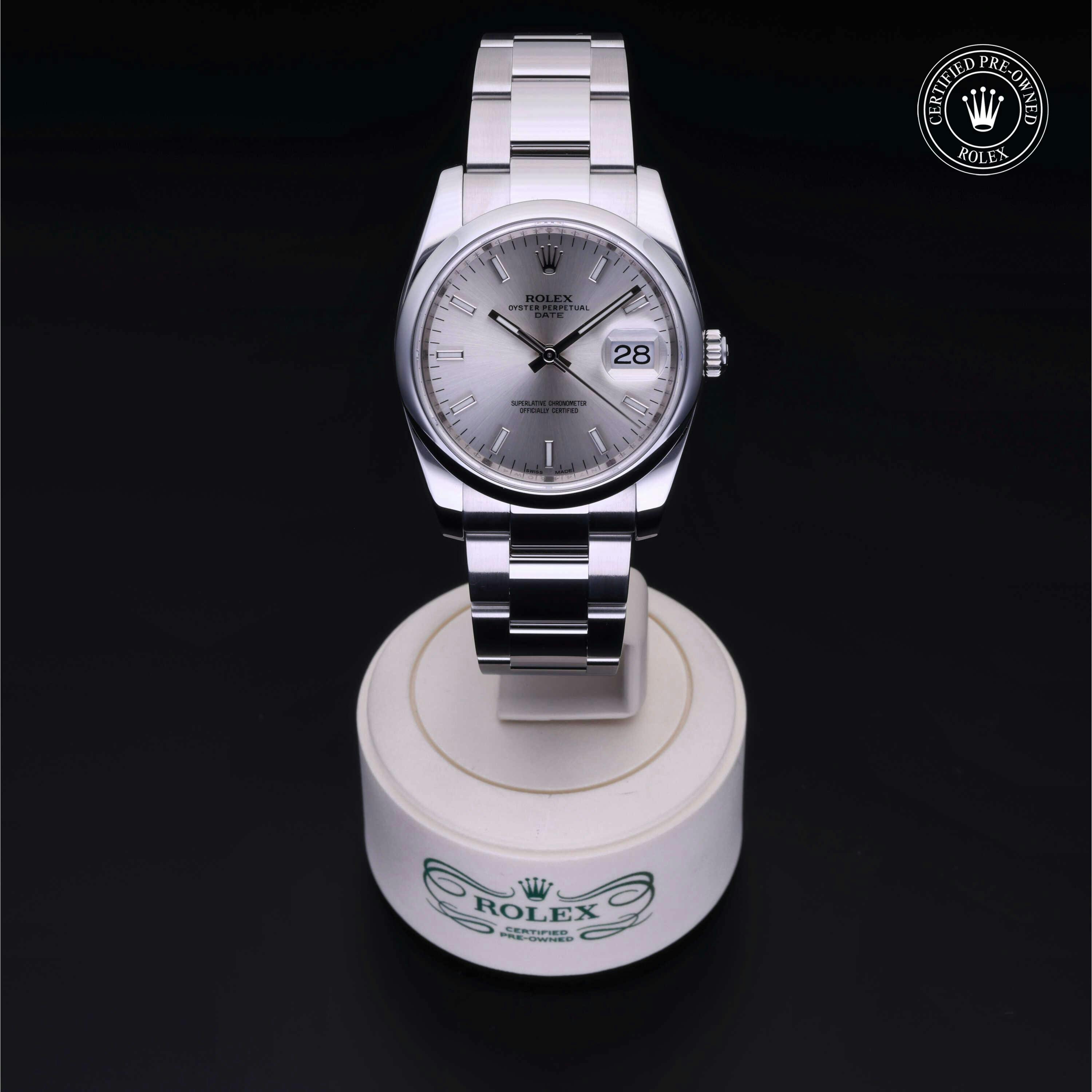 Rolex Certified Pre-Owned Oyster Perpetual Date 34 (115200) self - winding automatic watch, features a 34mm stainless steel case and domed bezel surrounding a silver dial on a stainless steel oyster bracelet. Functions include hours, minutes, seconds and date. This watch has received Rolex-authorized service and certification. It does not come with the original box or papers, but includes a custom Rolex Certified Pre-Owned hang tag, travel pouch and RCPO international warranty card.