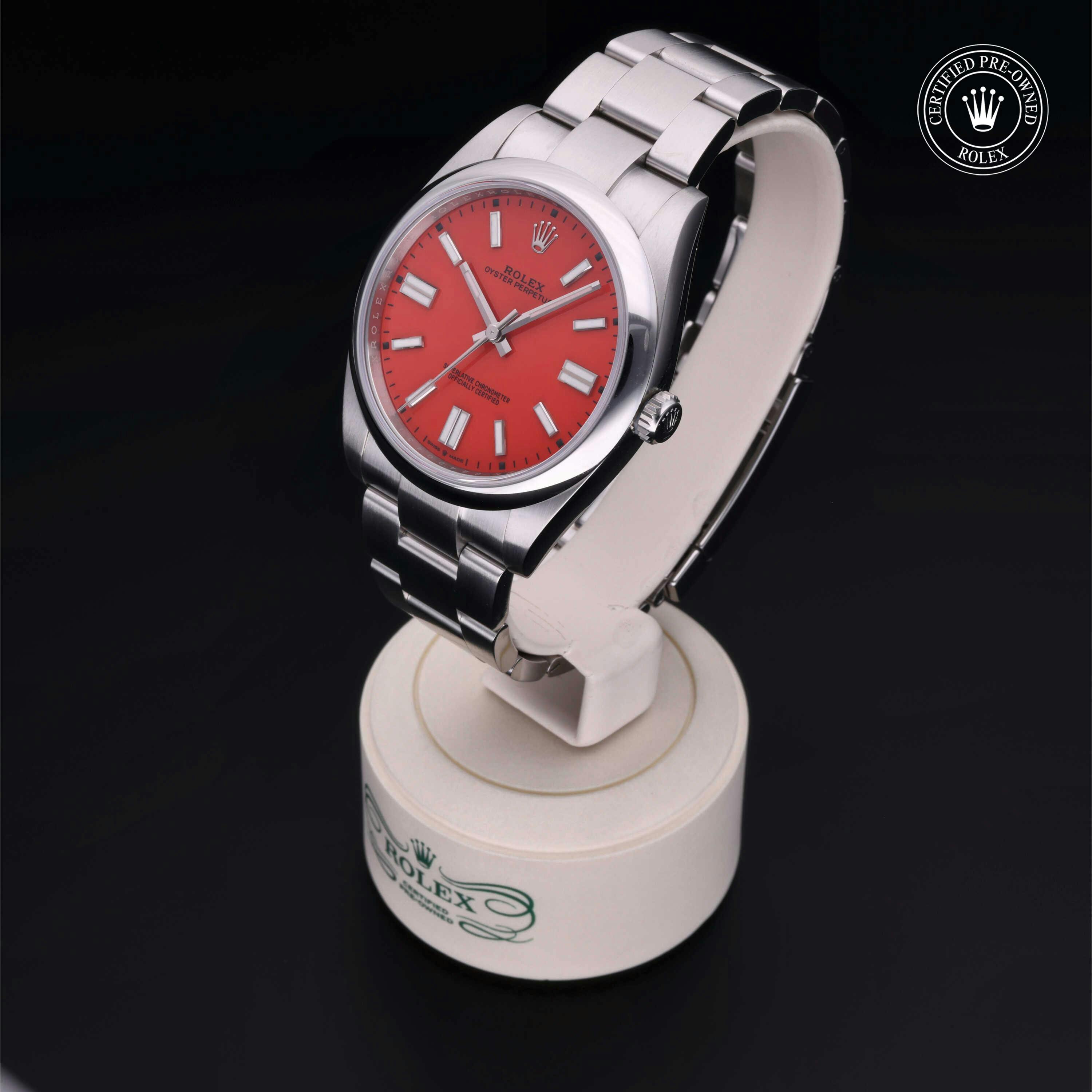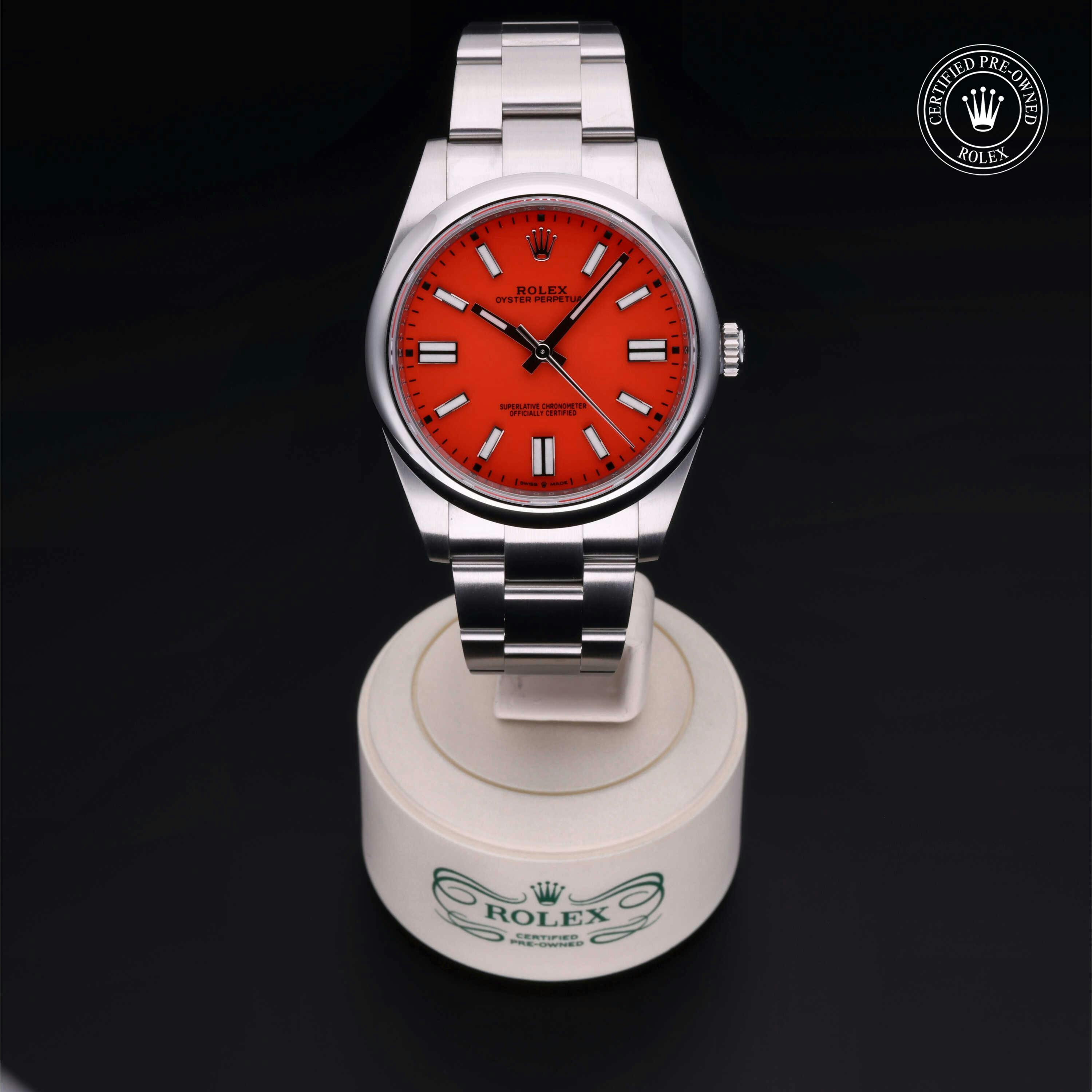 Rolex Certified Pre-Owned Oyster Perpetual (124300) self - winding automatic watch, features a 41mm stainless steel case and domed bezel surrounding a coral red dial on a stainless steel oyster bracelet. Functions include hours, minutes and seconds. This watch has received Rolex-authorized service and certification. It comes with the original papers, and includes a custom Rolex Certified Pre-Owned hang tag, travel pouch and RCPO international warranty card.