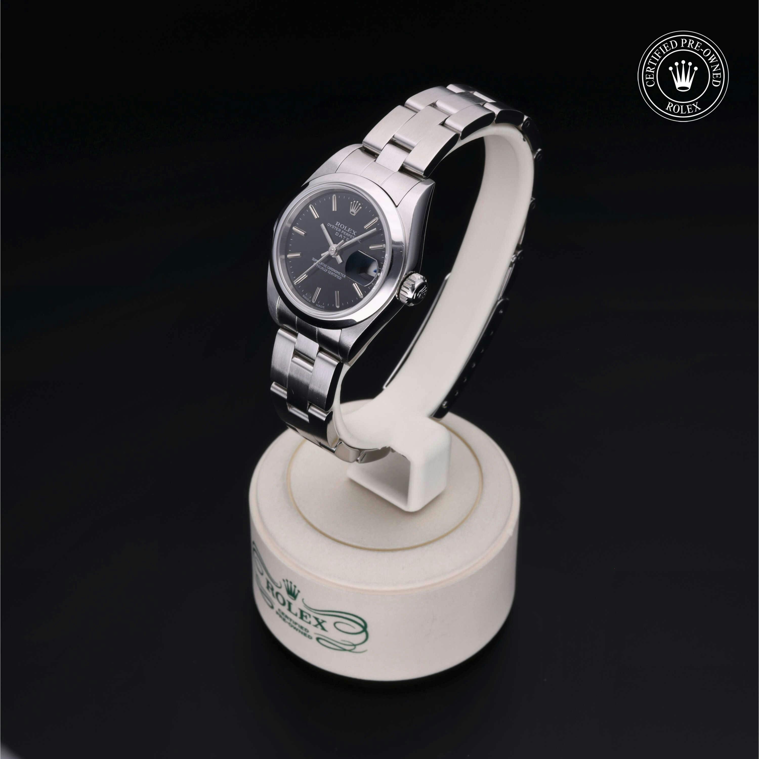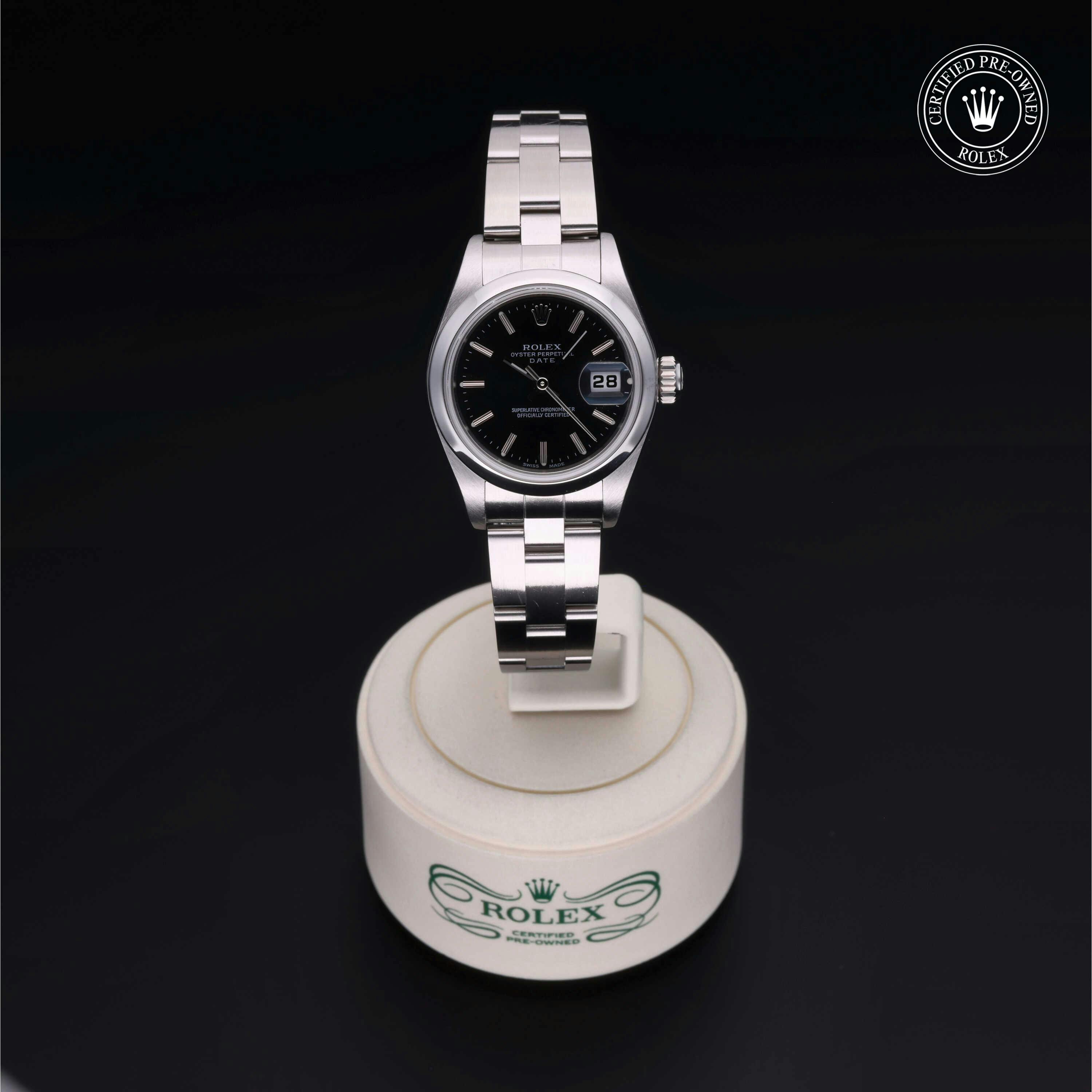 Rolex Certified Pre-Owned Oyster Perpetual Date (79160) self - winding automatic watch, features a 26mm stainless steel case with a domed bezel surrounding a black index dial. The watch is secured on a stainless steel Oyster bracelet complete with a folding buckle. Functions include hours, minutes, seconds and date. This watch has been serviced by an authorized service center and certified by Rolex. It comes with the original box and papers as well as a custom Rolex Certified Pre-Owned hang tag, travel pouch and international warranty card.
