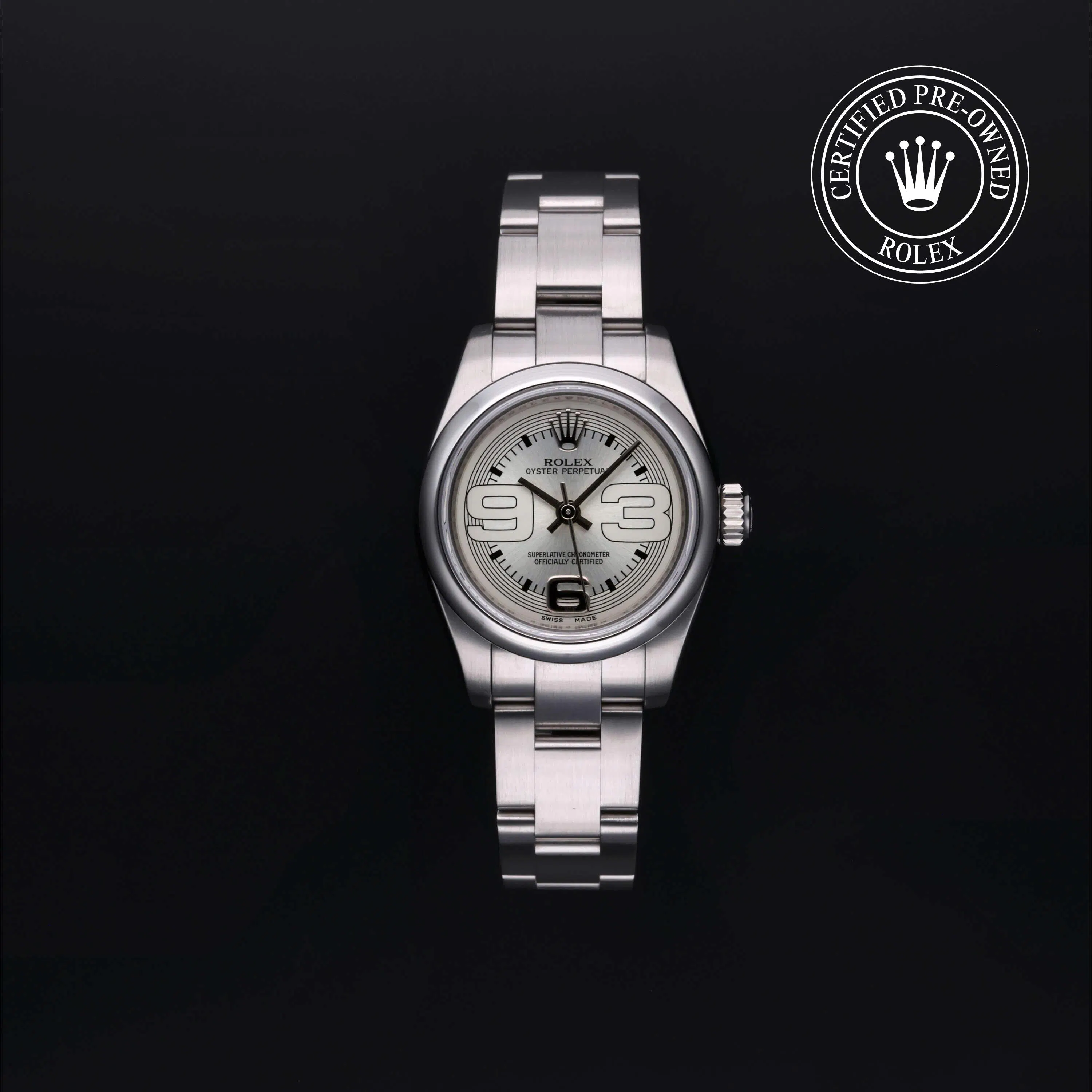 Rolex Certified Pre-Owned Oyster Perpetual (176200) self - winding automatic watch, features a 26mm stainless steel case and domed bezel surrounding a silver dial. The watch is secured on a stainless steel Oyster bracelet complete with a folding buckle. Functions include hours, minutes and seconds. This watch has received Rolex-authorized service and certification. It comes with the original box and papers, and includes a custom Rolex Certified Pre-Owned hang tag, travel pouch and RCPO international warranty card.