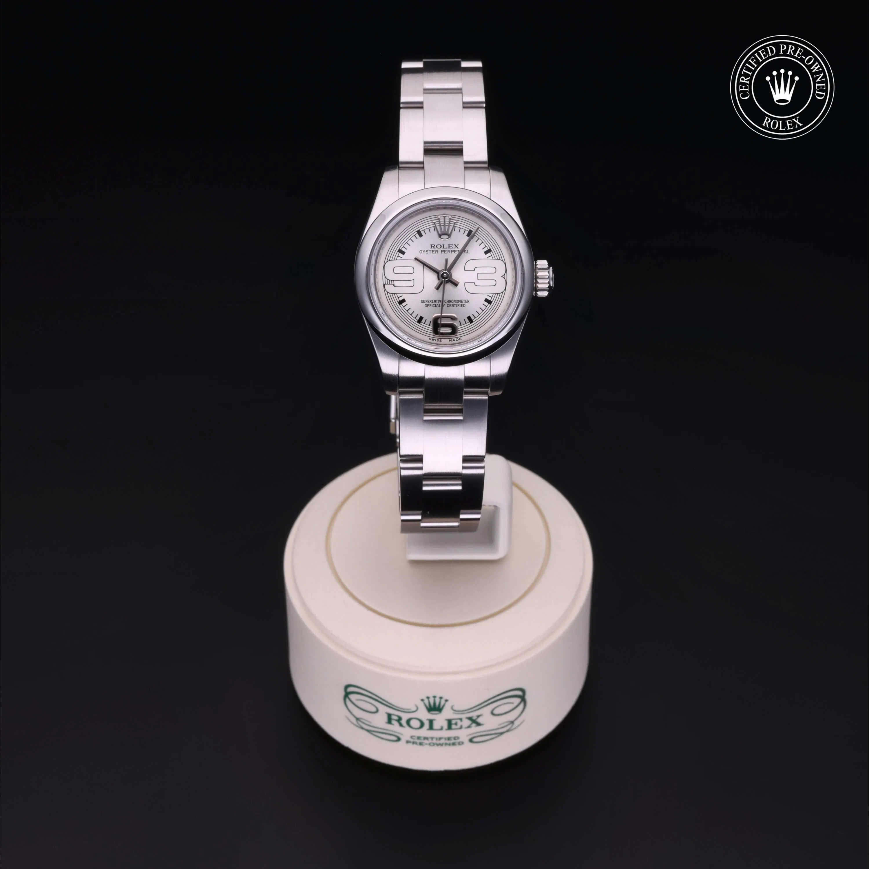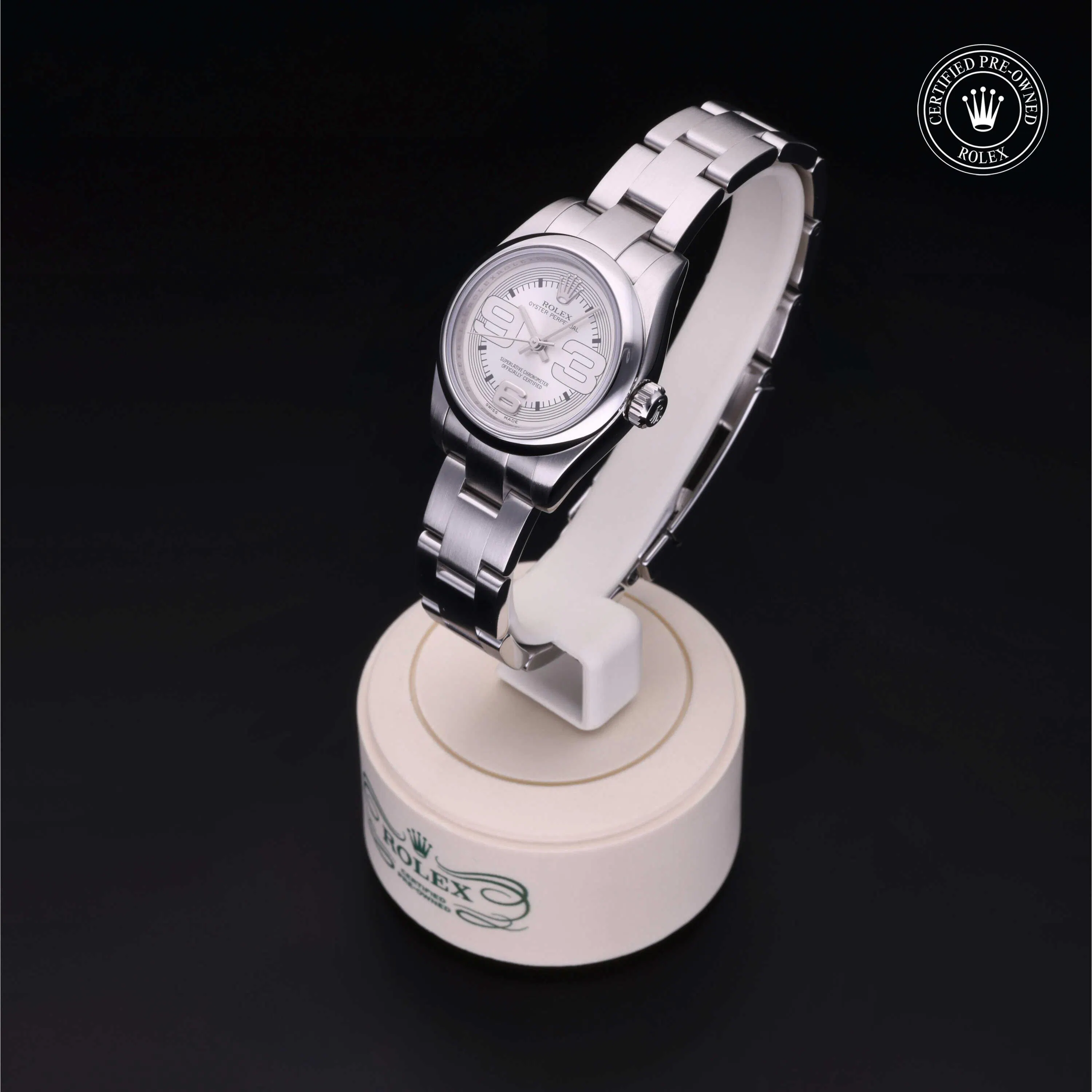 Rolex Certified Pre-Owned Oyster Perpetual (176200) self - winding automatic watch, features a 26mm stainless steel case and domed bezel surrounding a silver dial. The watch is secured on a stainless steel Oyster bracelet complete with a folding buckle. Functions include hours, minutes and seconds. This watch has received Rolex-authorized service and certification. It comes with the original box and papers, and includes a custom Rolex Certified Pre-Owned hang tag, travel pouch and RCPO international warranty card.