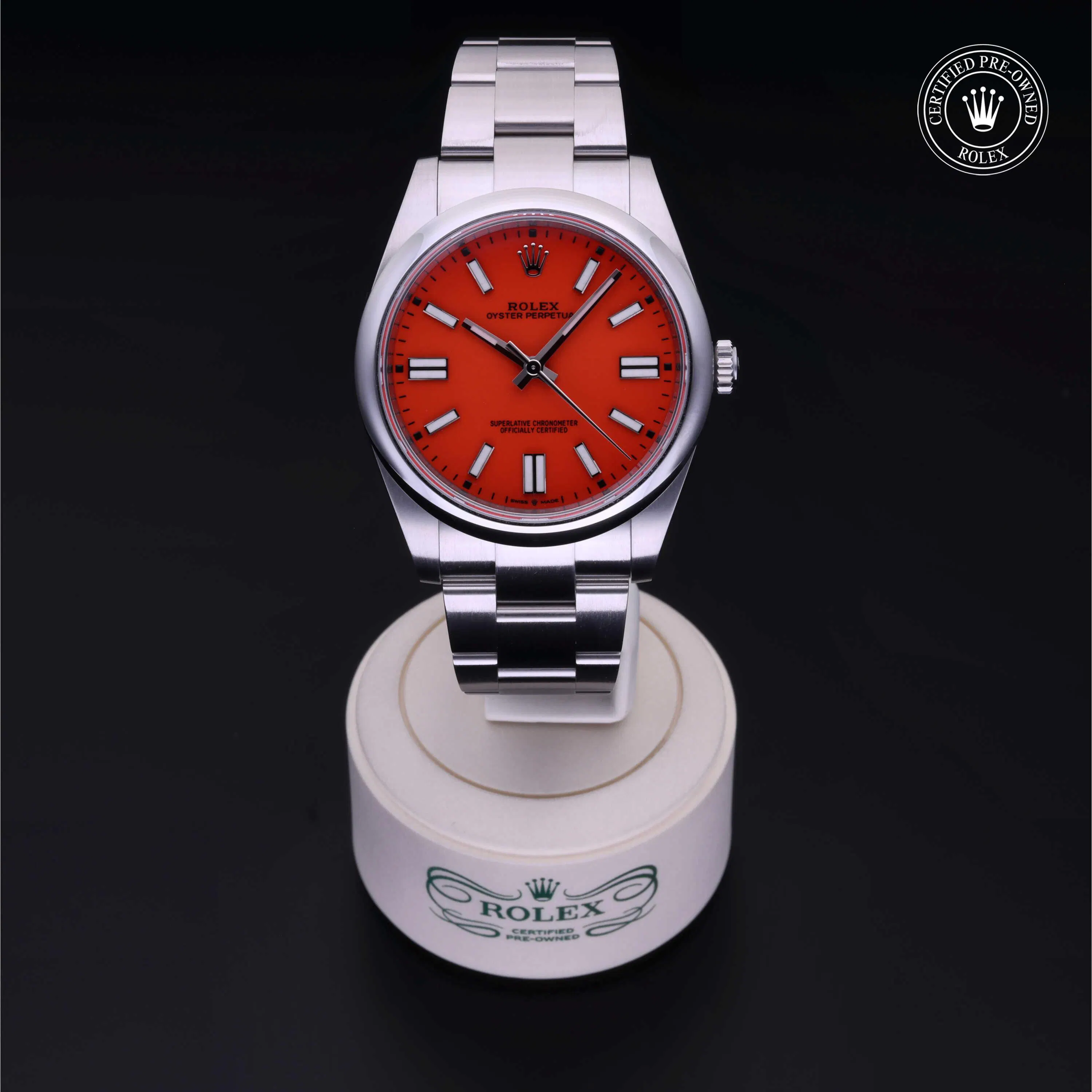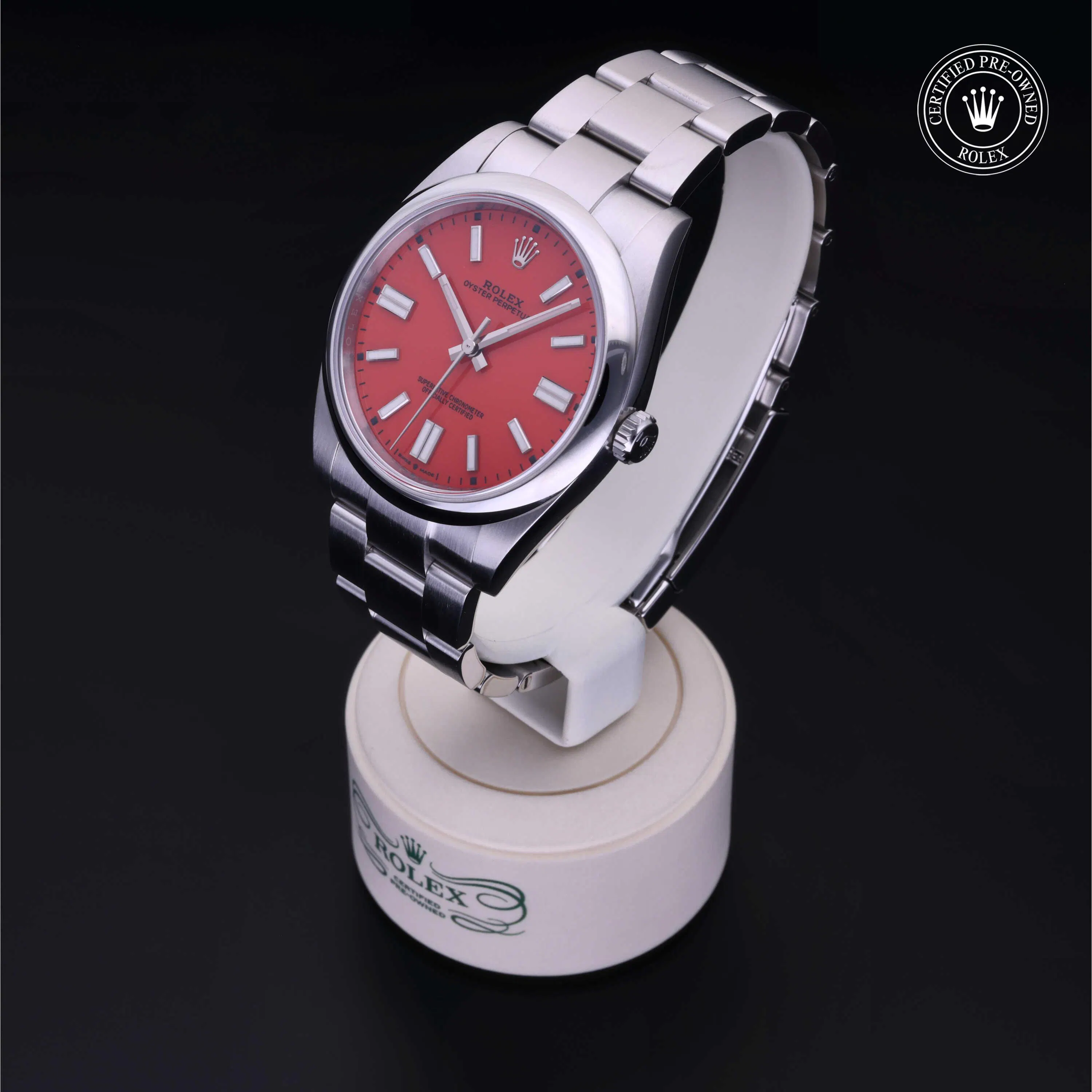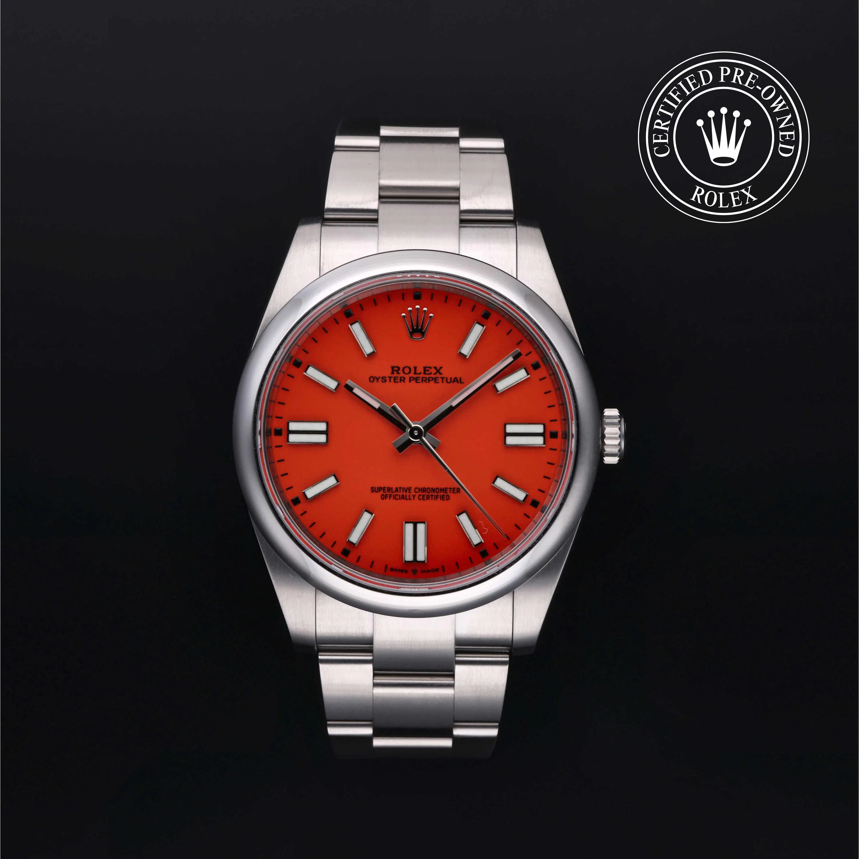 Rolex Certified Pre-Owned Oyster Perpetual (124300) self - winding automatic watch, features a 41mm stainless steel case and domed bezel surrounding a Coral red dial on a stainless steel oyster bracelet. Functions include hours, minutes and seconds. This watch has received Rolex-authorized service and certification. It comes with the original papers, and includes a custom Rolex Certified Pre-Owned hang tag, travel pouch and RCPO international warranty card.