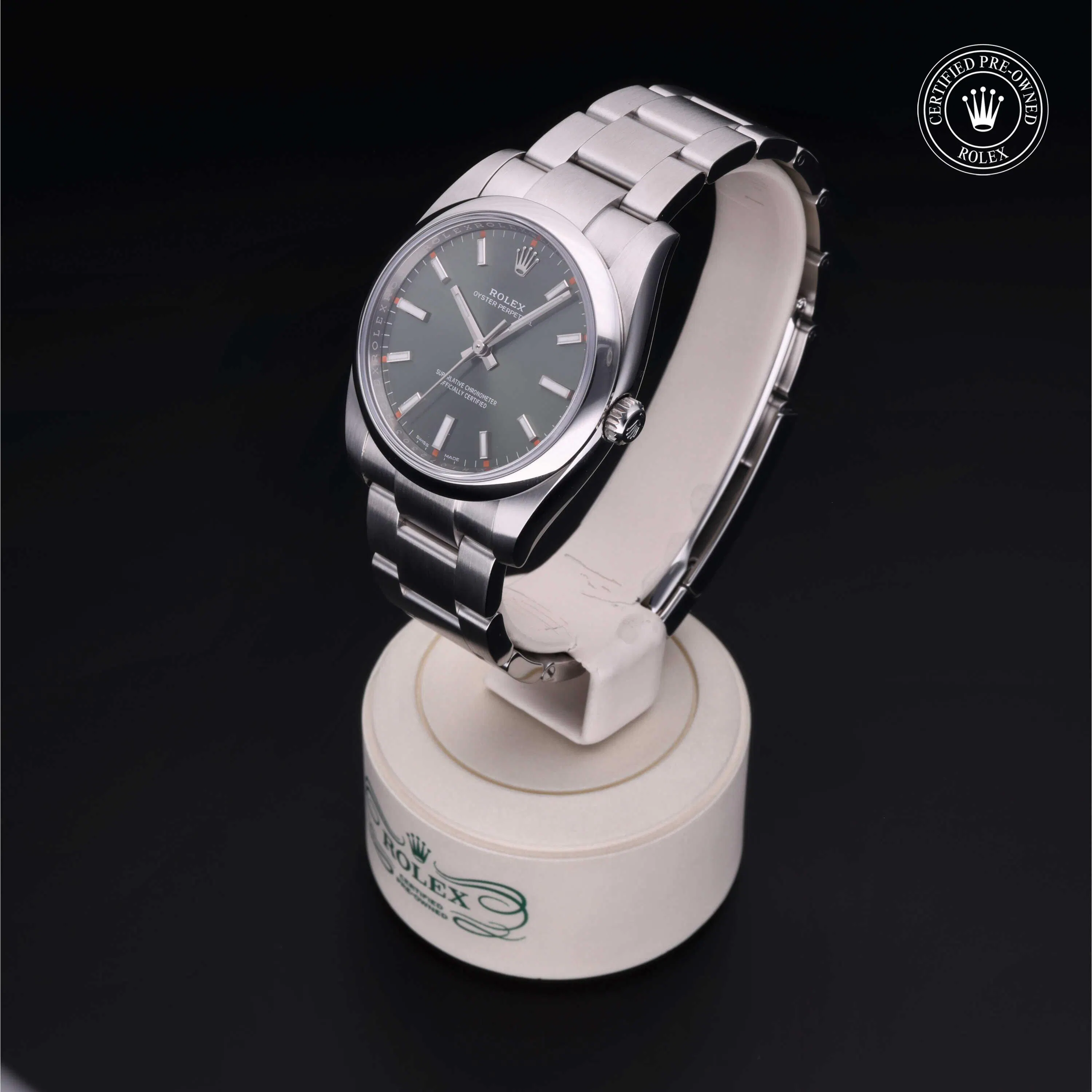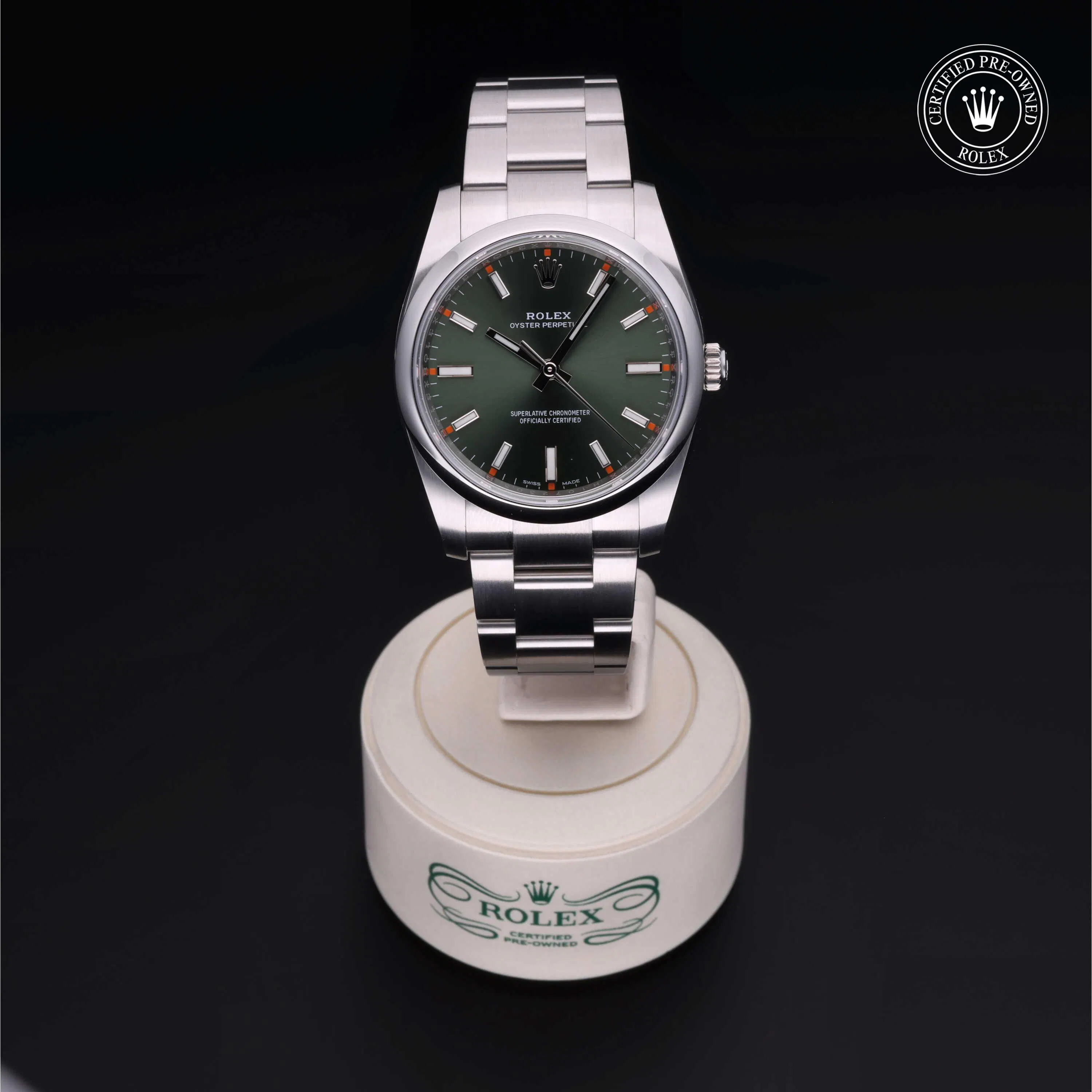 Rolex Certified Pre-Owned Oyster Perpetual (114200) self - winding automatic watch, features a 34mm stainless steel case and domed bezel surrounding an olive green dial on a stainless steel oyster bracelet. Functions include hours, minutes and seconds. This watch has received Rolex-authorized service and certification. It does not come with the original box or papers, but includes a custom Rolex Certified Pre-Owned hang tag, travel pouch and RCPO international warranty card.