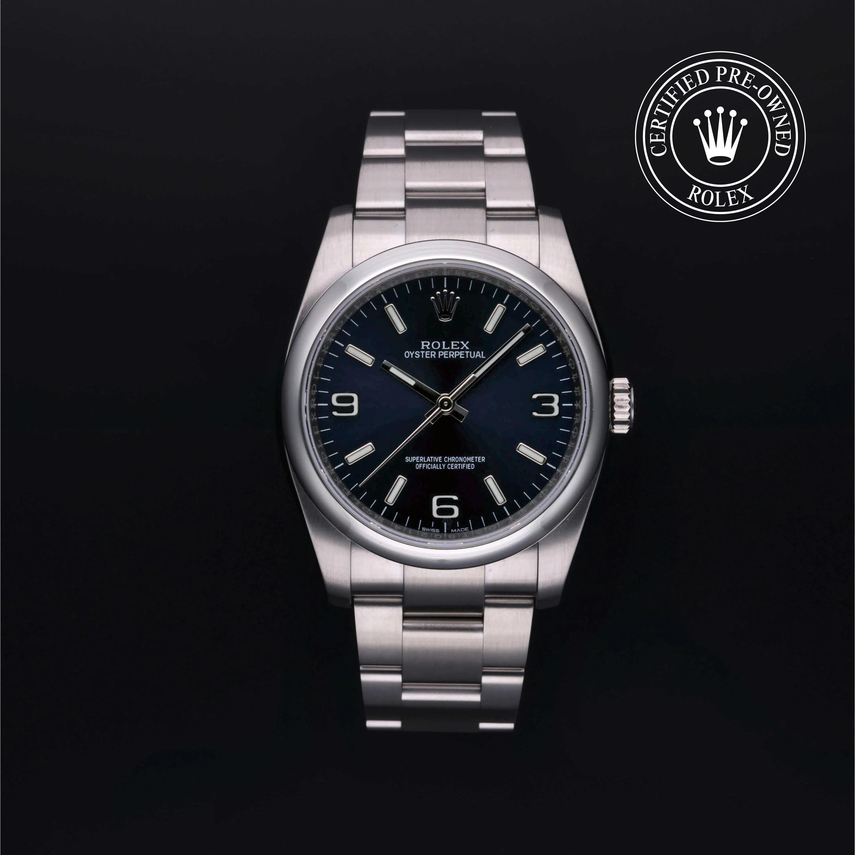 Rolex Certified Pre-Owned Oyster Perpetual (116000) self - winding automatic watch, features a 36mm stainless steel case and domed bezel surrounding a blue dial. The watch is secured on a stainless steel Oyster bracelet complete with a folding buckle. Functions include hours, minutes and seconds. This watch has received Rolex-authorized service and certification. It comes with the original box and papers, and includes a custom Rolex Certified Pre-Owned hang tag, travel pouch and RCPO international warranty card.