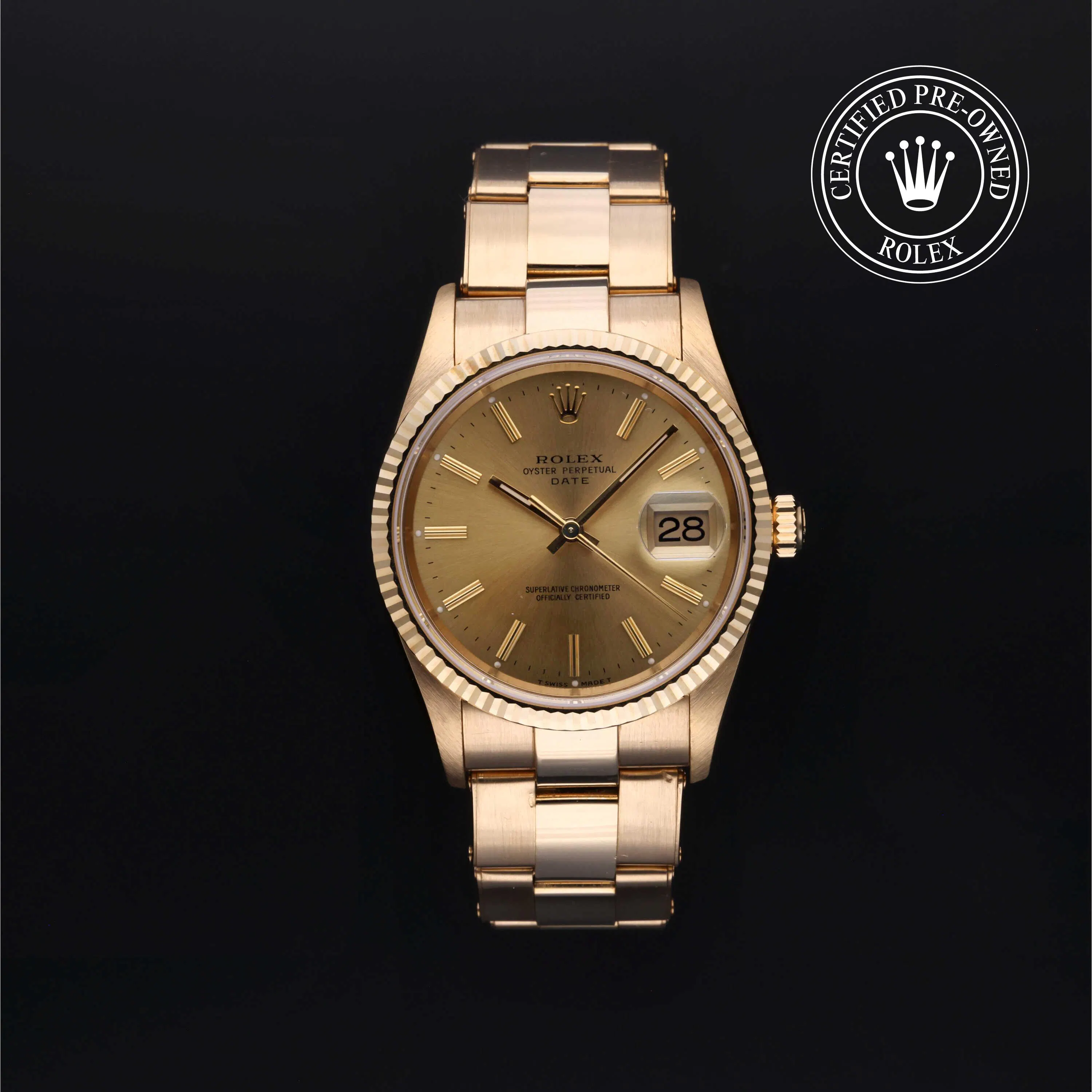 Rolex Certified Pre-Owned Oyster Perpetual Date (15238) self - winding automatic watch, features a 34mm 18k yellow gold case and fluted bezel surrounding a champagne dial on an 18k yellow gold Oyster bracelet. Functions include hours, minutes, seconds and date. This watch has received Rolex-authorized service and certification. It comes with the original box and papers, and includes a custom Rolex Certified Pre-Owned hang tag, travel pouch and RCPO international warranty card.
