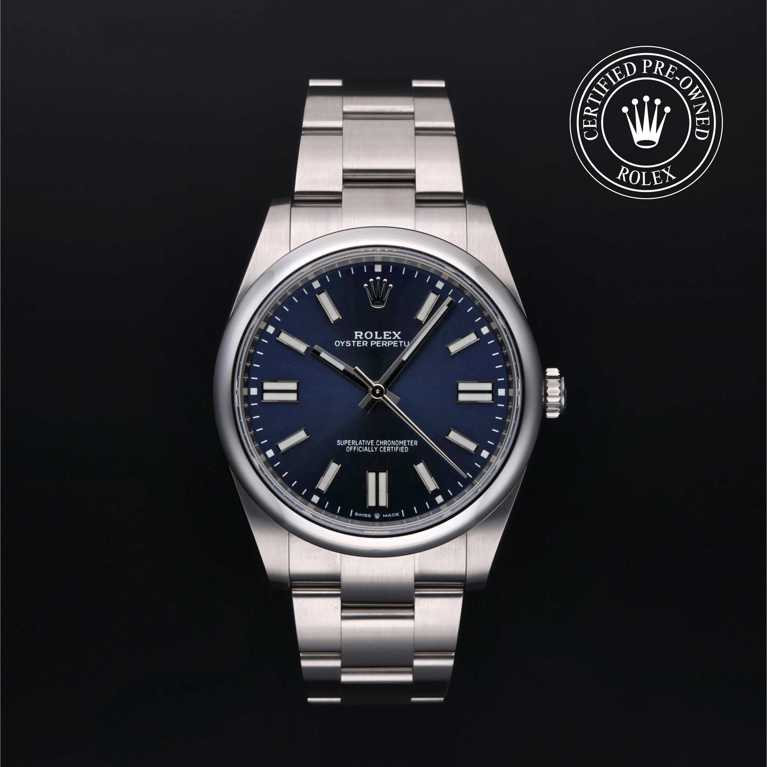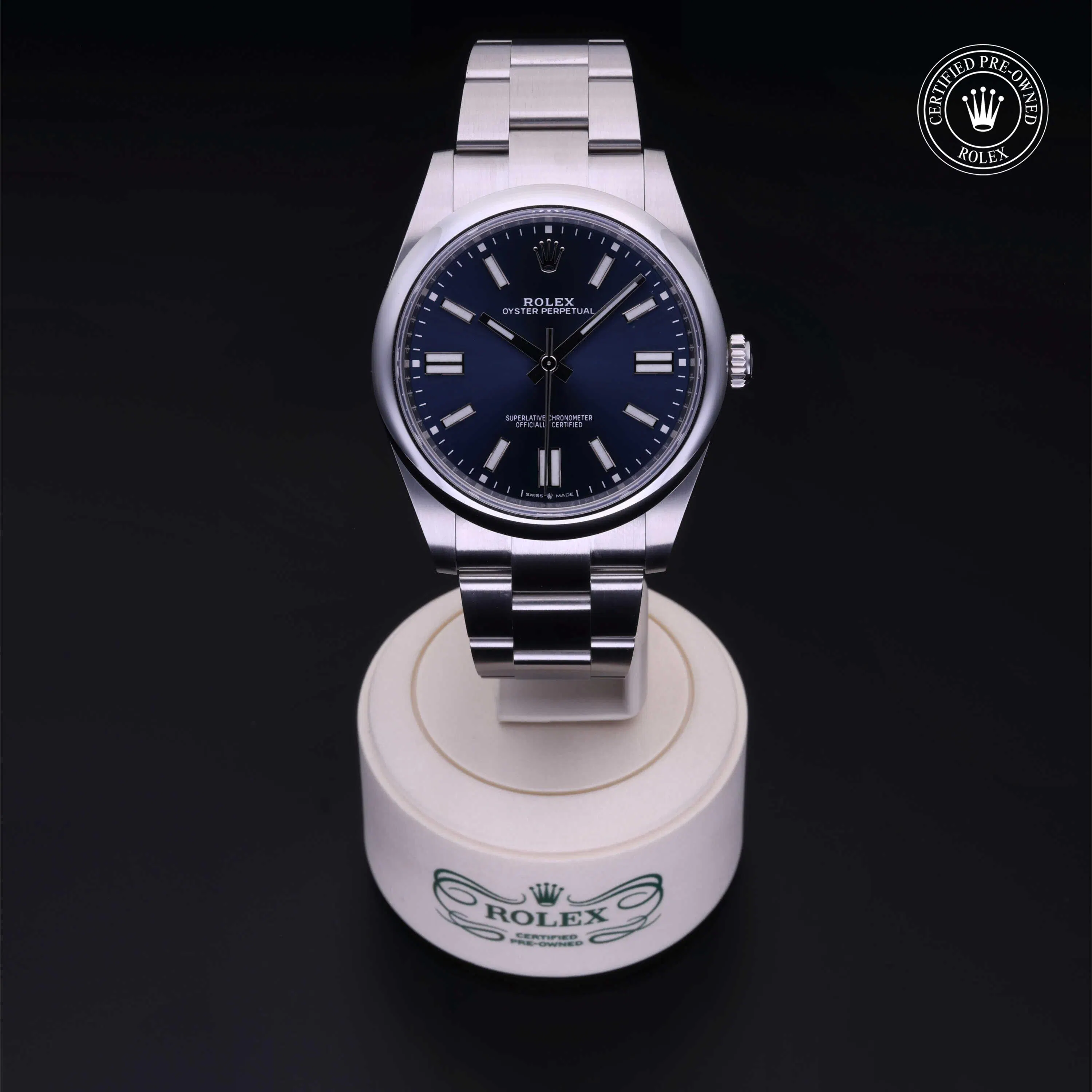 Rolex Certified Pre-Owned Oyster Perpetual (124300) self - winding automatic watch, features a 41mm stainless steel case and domed bezel surrounding a bright blue dial on a stainless steel oyster bracelet. Functions include hours, minutes and seconds. This watch has received Rolex-authorized service and certification. It comes with the original box and papers, and includes a custom Rolex Certified Pre-Owned hang tag, travel pouch and RCPO international warranty card.