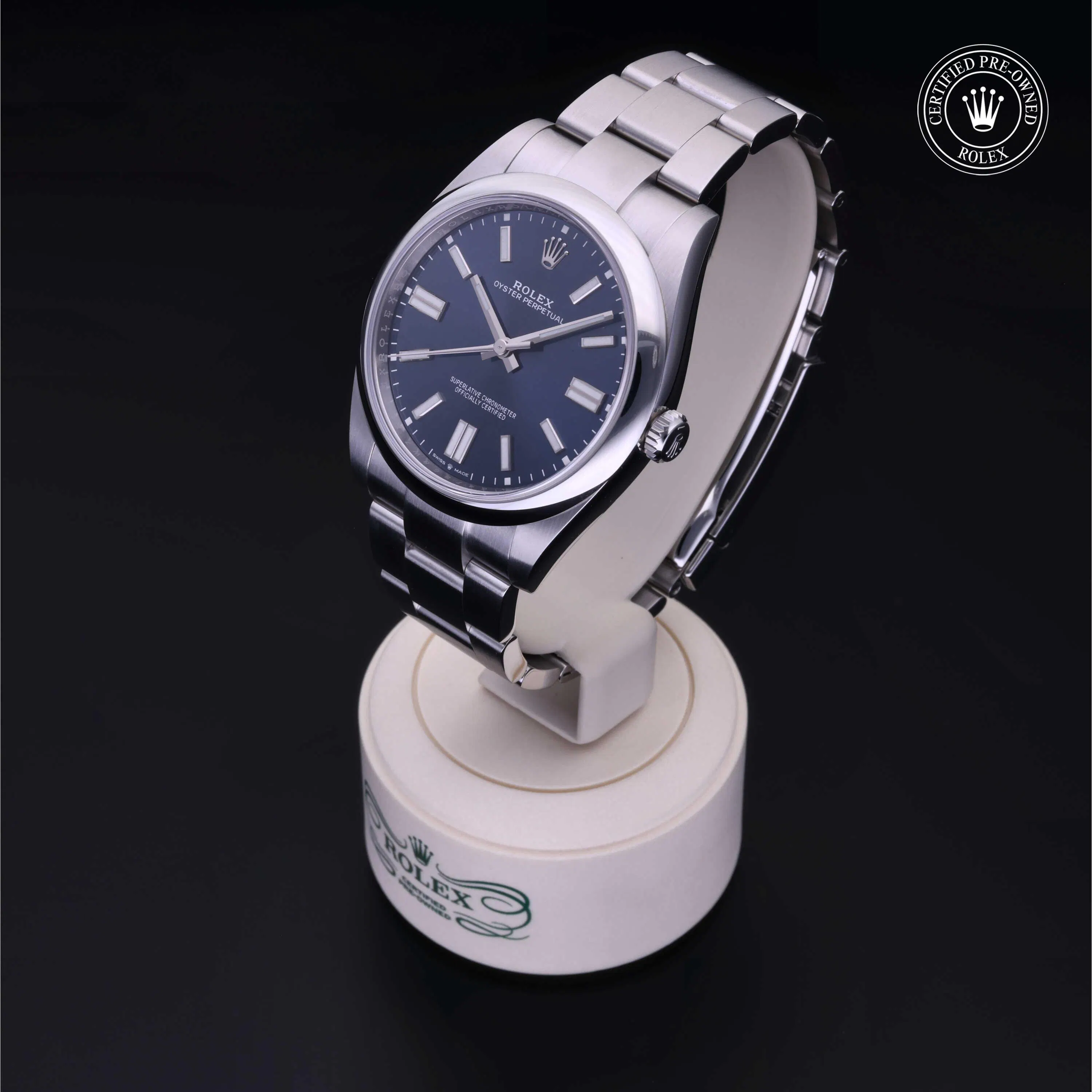 Rolex Certified Pre-Owned Oyster Perpetual (124300) self - winding automatic watch, features a 41mm stainless steel case and domed bezel surrounding a bright blue dial on a stainless steel oyster bracelet. Functions include hours, minutes and seconds. This watch has received Rolex-authorized service and certification. It comes with the original box and papers, and includes a custom Rolex Certified Pre-Owned hang tag, travel pouch and RCPO international warranty card.