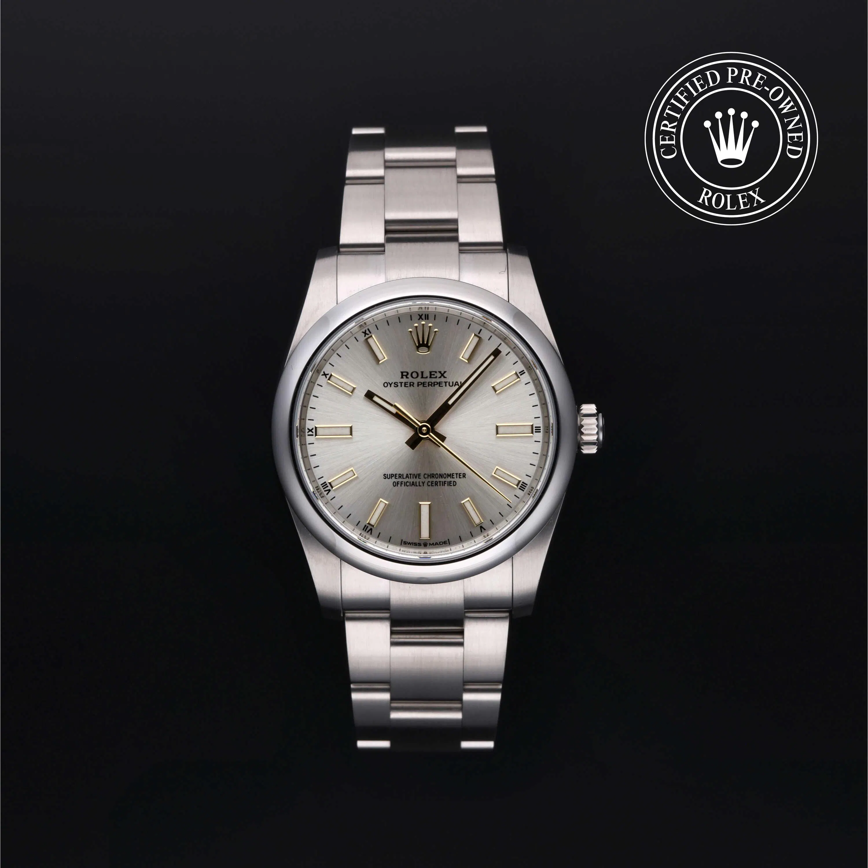 Rolex Certified Pre-Owned Oyster Perpetual (124200) self - winding automatic watch, features a 34mm stainless steel case surrounding a silver dial with gold applied index markers. The watch is secured on a stainless steel Oyster bracelet complete with a folding buckle. Functions include hours, minutes and seconds. This watch has been serviced by an authorized service center and certified by Rolex. It comes with the original box and papers as well as a custom Rolex Certified Pre-Owned hang tag, travel pouch and international warranty card.