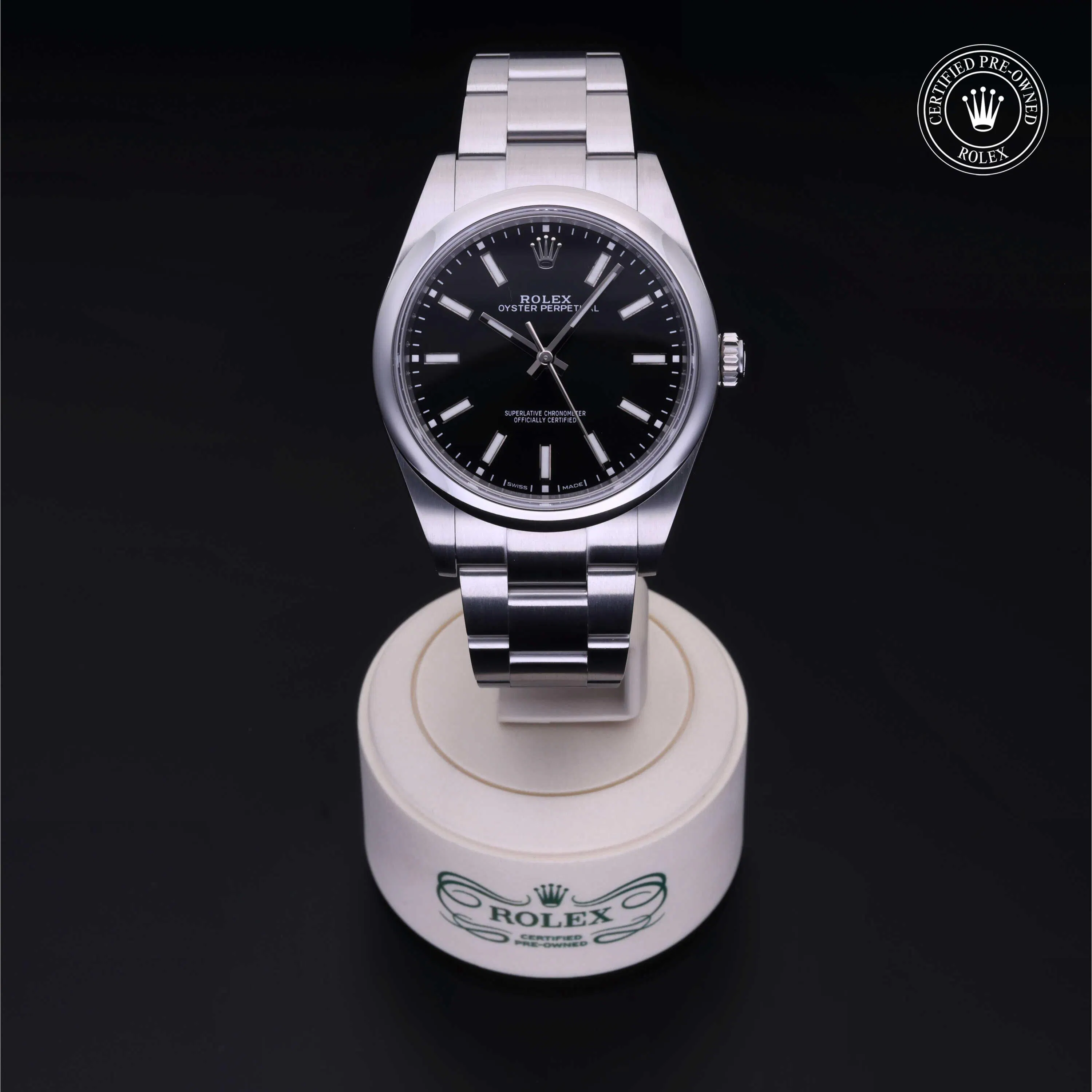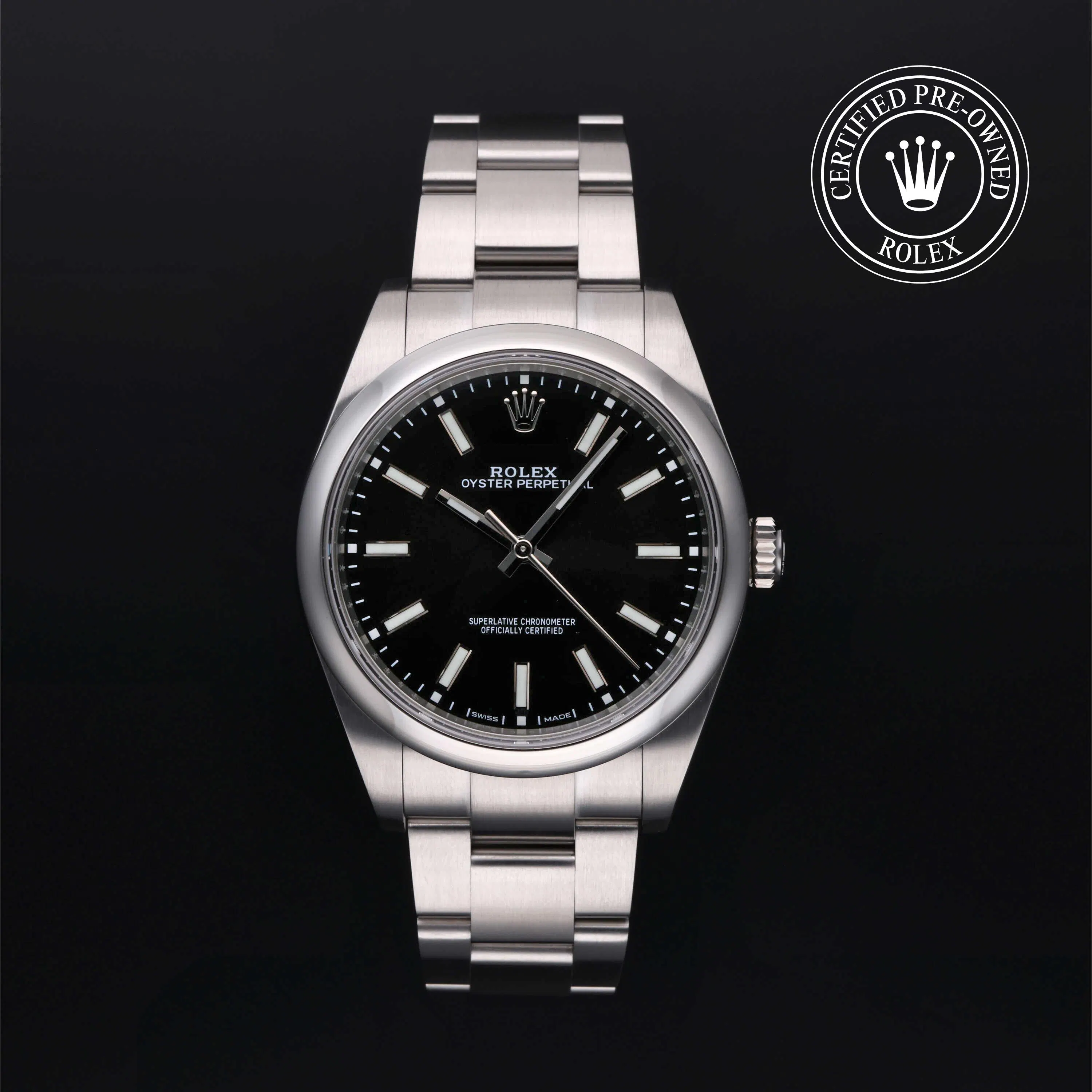 Rolex Certified Pre-Owned Oyster Perpetual (114300) self - winding automatic watch, features a 39mm stainless steel case and domed bezel surrounding a black dial on a stainless steel oyster bracelet. Functions include hours, minutes and seconds. This watch has received Rolex-authorized service and certification. It comes with the original papers, and includes a custom Rolex Certified Pre-Owned hang tag, travel pouch and RCPO international warranty card.
