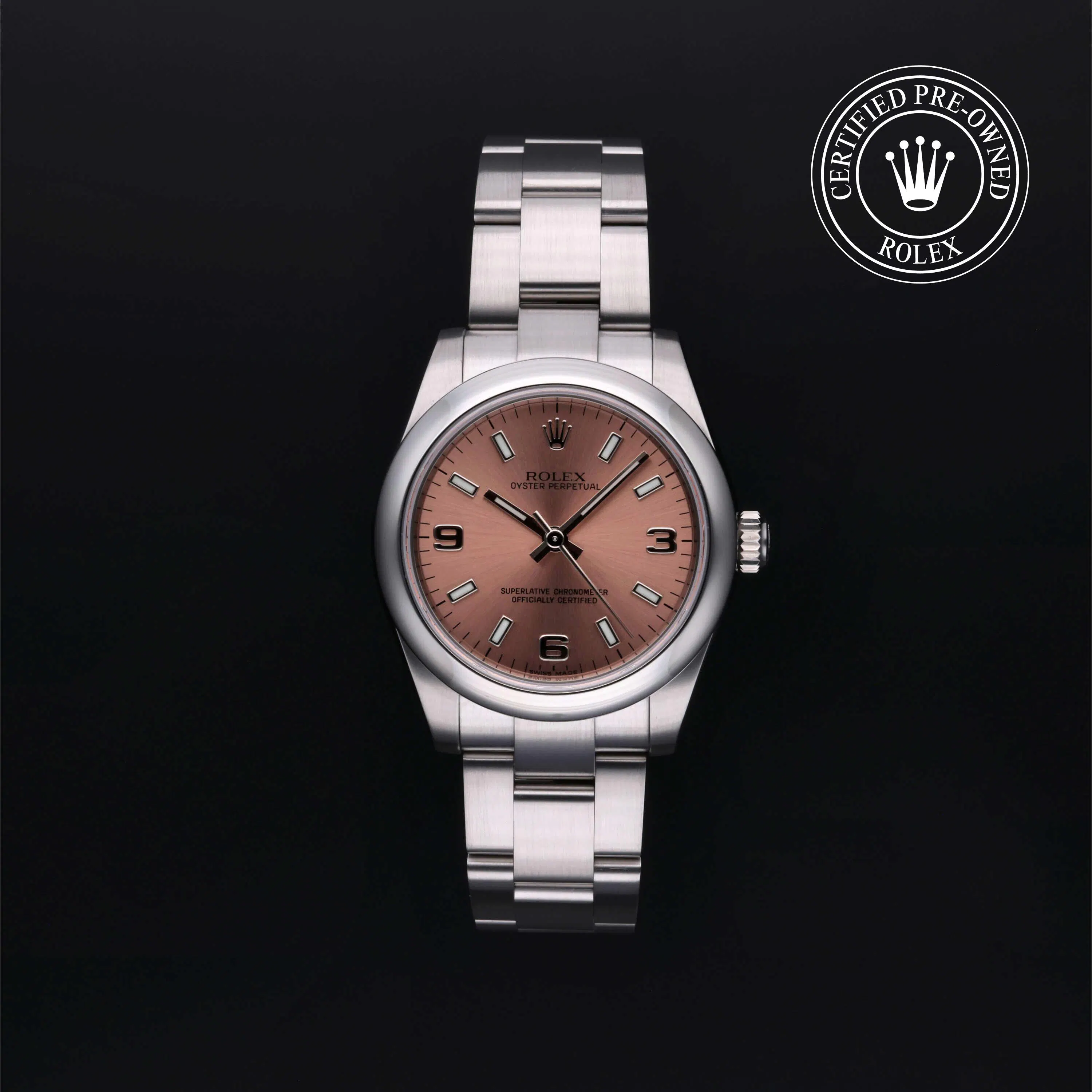 Rolex Certified Pre-Owned Oyster Perpetual (177200) self - winding automatic watch, features a 31mm stainless steel case and domed bezel surrounding a pink dial on a stainless steel Oyster bracelet. Functions include hours, minutes and seconds. This watch has received Rolex-authorized service and certification. It does not come with the original box or papers, but includes a custom Rolex Certified Pre-Owned hang tag, travel pouch and RCPO international warranty card.