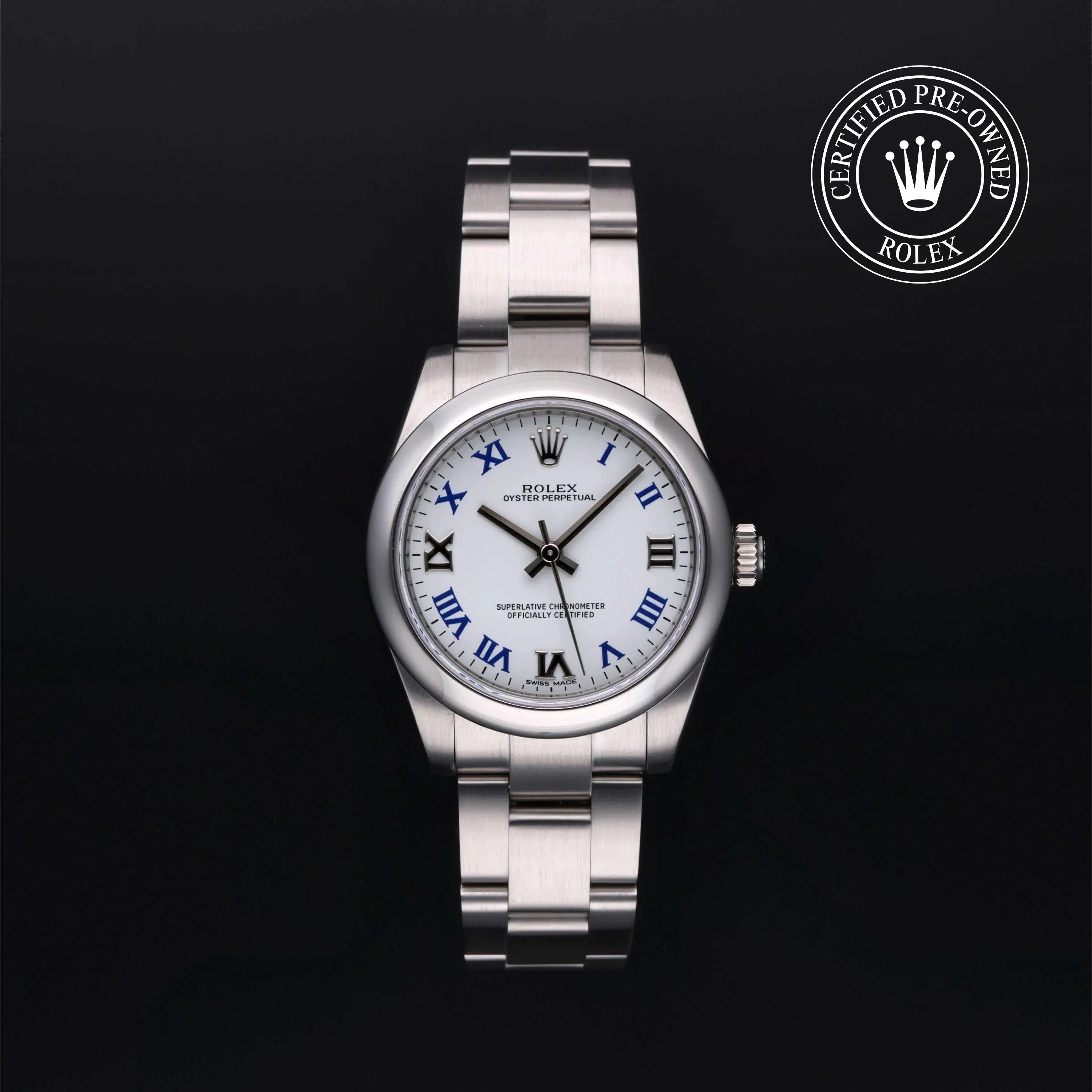 Rolex Certified Pre-Owned Oyster Perpetual (177200) self - winding automatic watch, features a 31mm stainless steel case and domed bezel surrounding a white dial on a stainless steel Oyster bracelet. Functions include hours, minutes and seconds. This watch has received Rolex-authorized service and certification. It does not come with the original box or papers, but includes a custom Rolex Certified Pre-Owned hang tag, travel pouch and RCPO international warranty card.