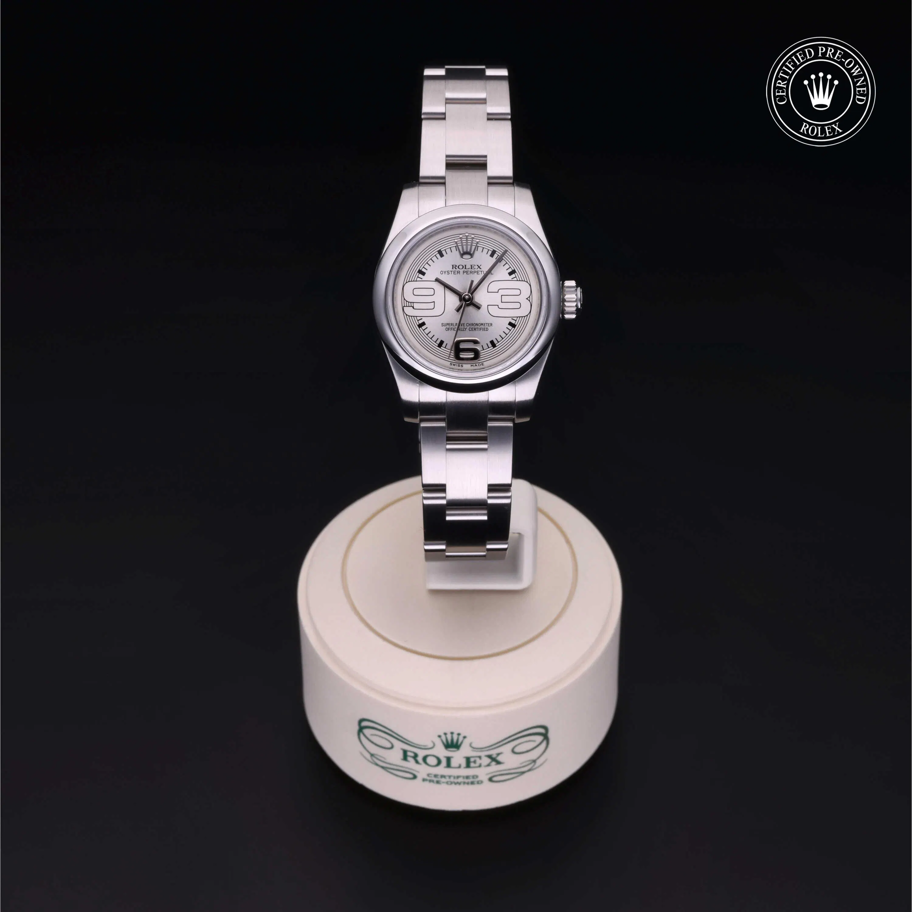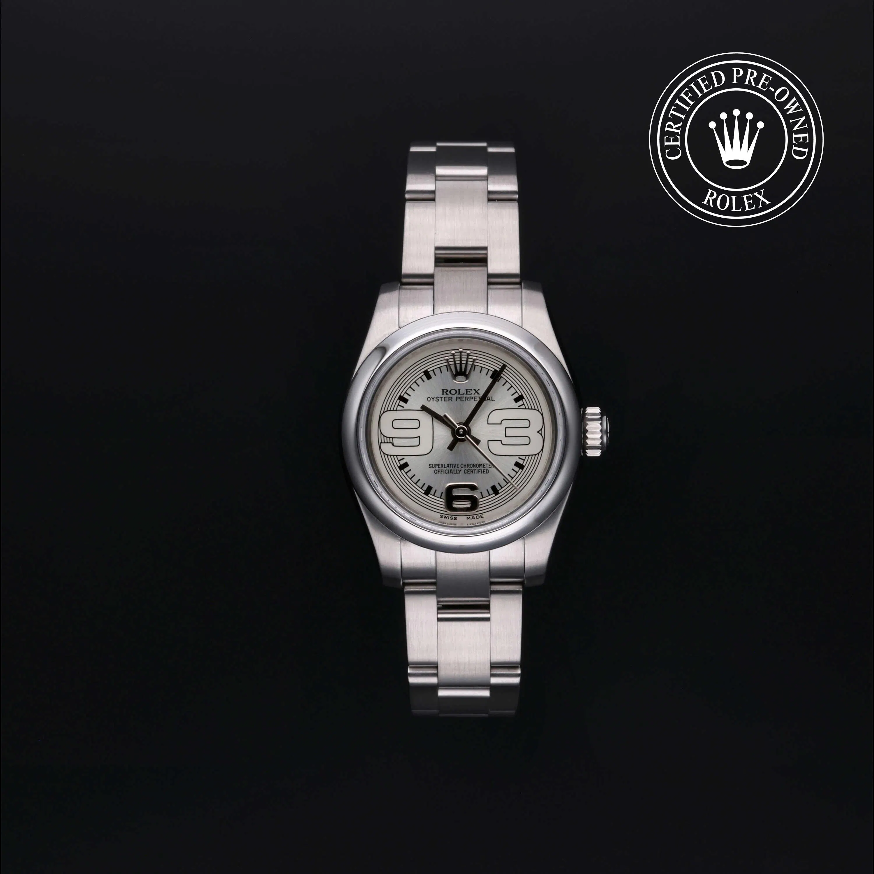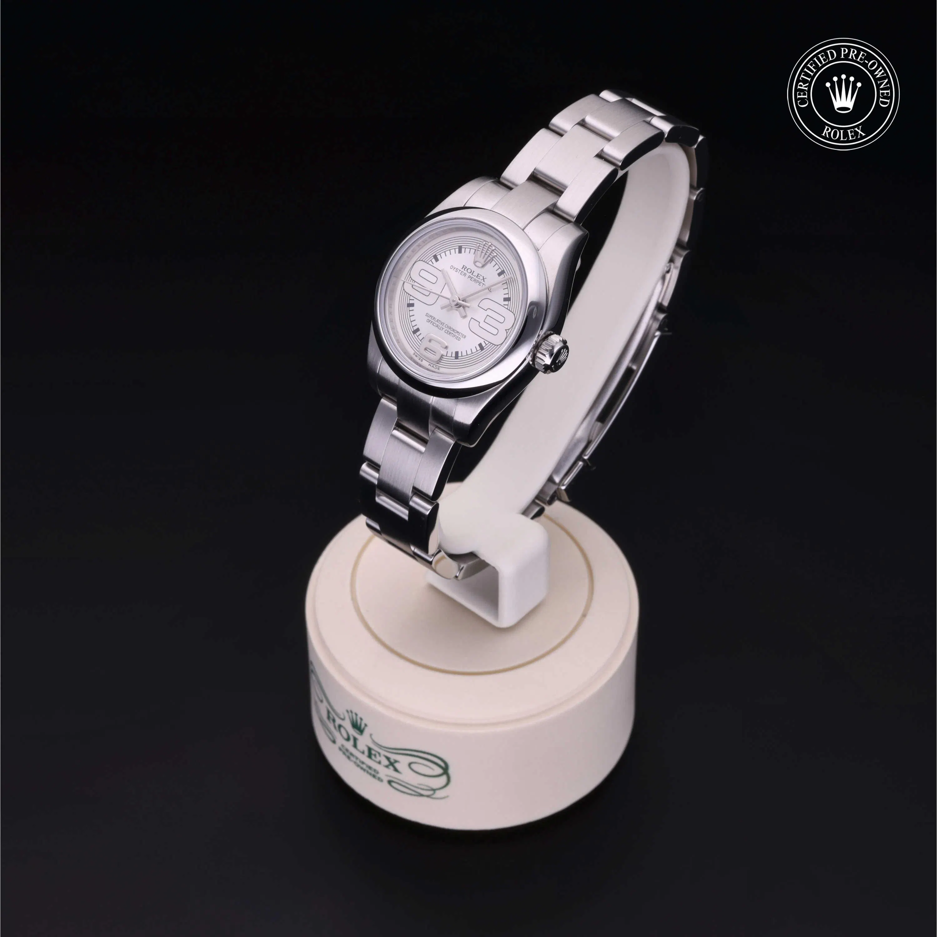 Rolex Certified Pre-Owned Oyster Perpetual (176200) self - winding automatic watch, features a 26mm stainless steel case with a domed bezel surrounding a silver dial. The watch is secured on a stainless steel Oyster bracelet complete with a folding buckle. Functions include hours, minutes and seconds. This watch has been serviced by an authorized service center and certified by Rolex. It does not come with the original box or papers, but includes a custom Rolex Certified Pre-Owned hang tag, travel pouch and international warranty card.