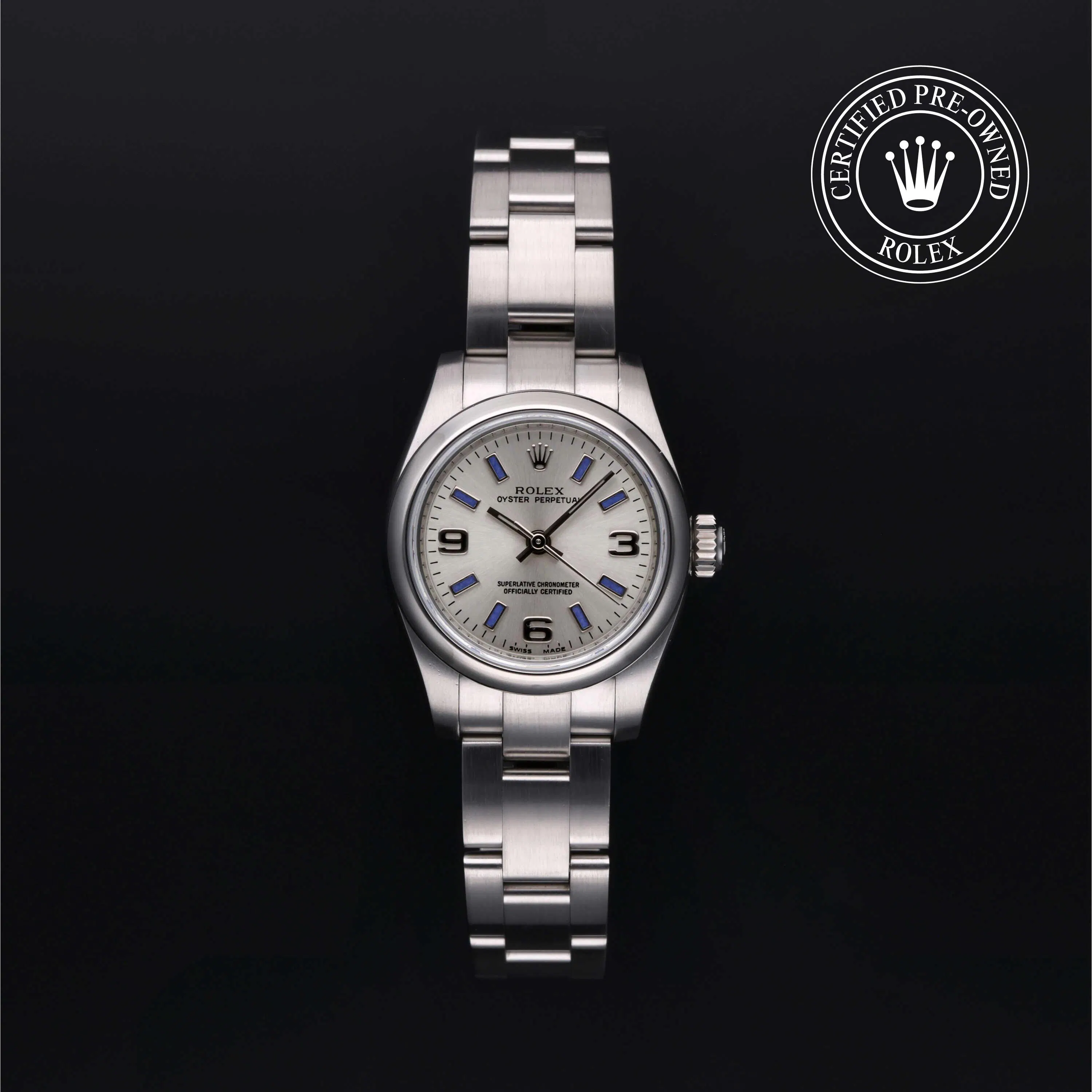Sleek and striking, this silver dial Oyster Perpetual features a 34mm stainless steel case and the iconic 3-6-9 Explorer-style hour markers. It remains a favorite for those seeking used mid-size Rolex watches.