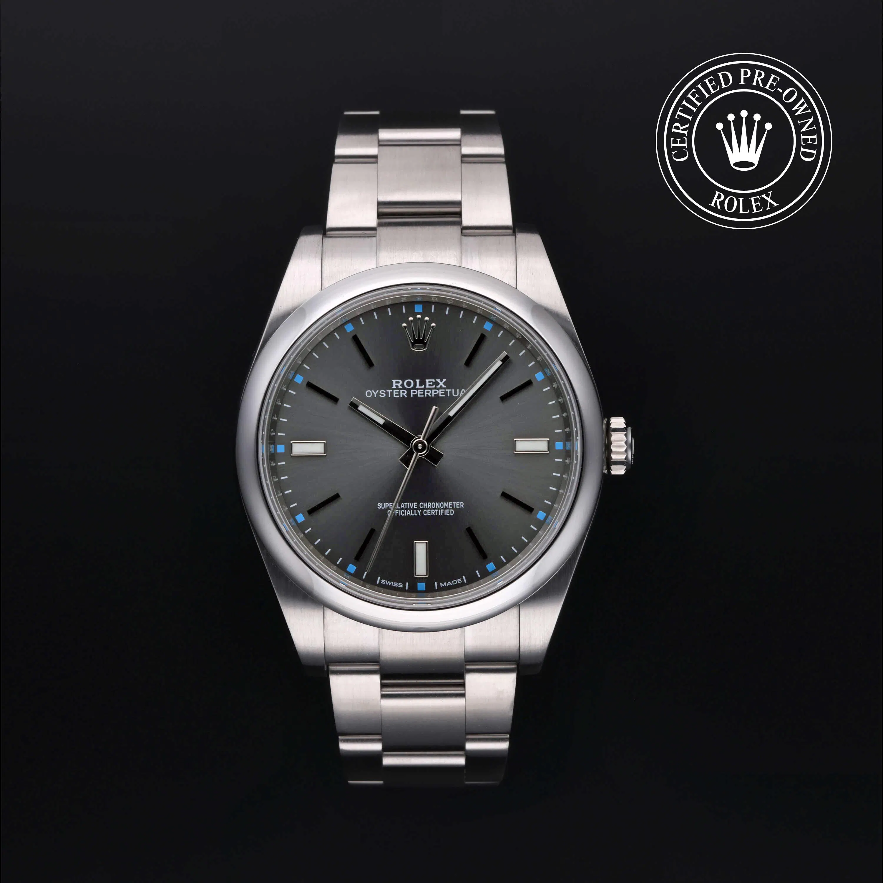 This 39mm stainless steel Oyster Perpetual features a clean white dial and 100m waterproofness. It appeals to collectors looking for a discontinued size with modern proportions and understated elegance in a used Rolex Oyster Perpetual.