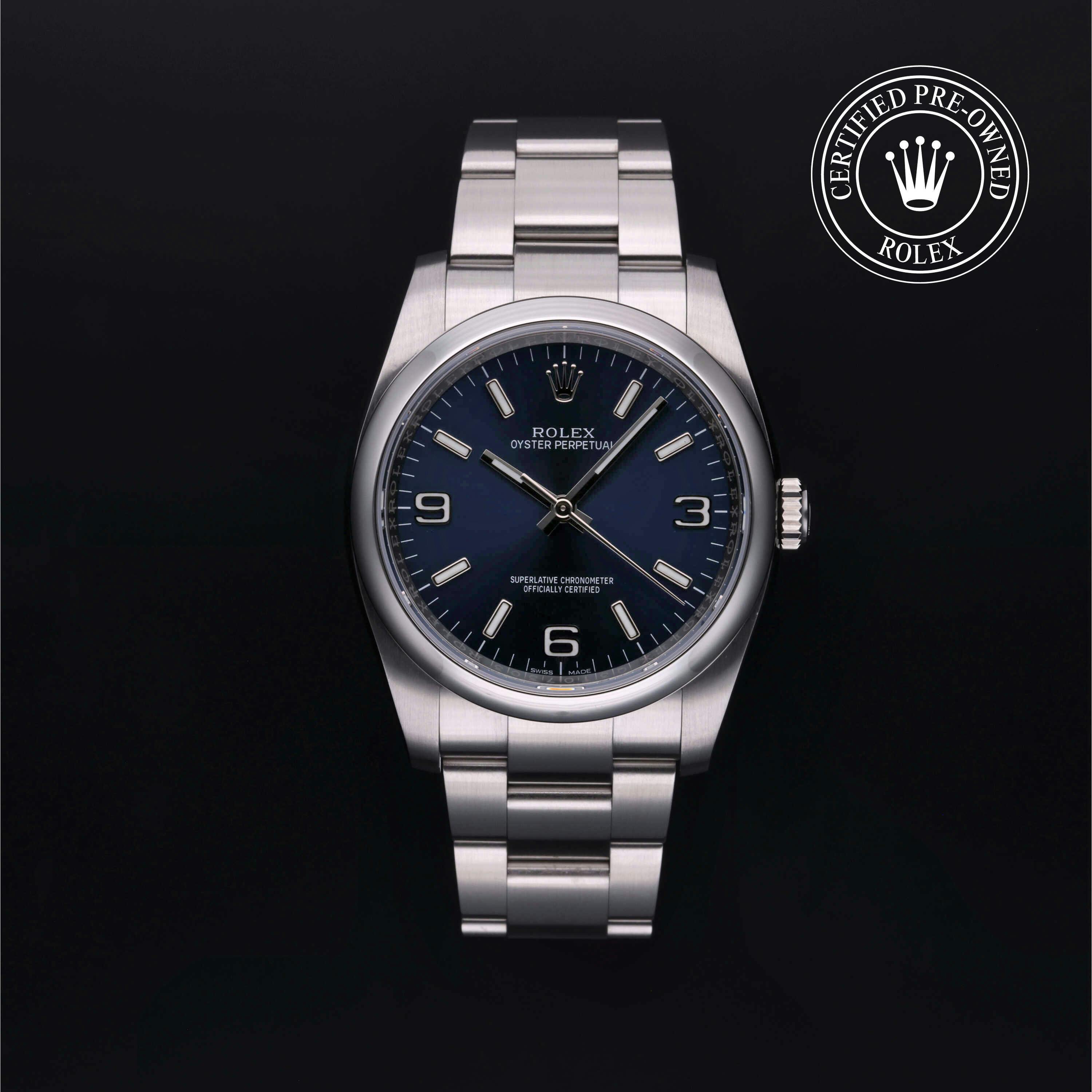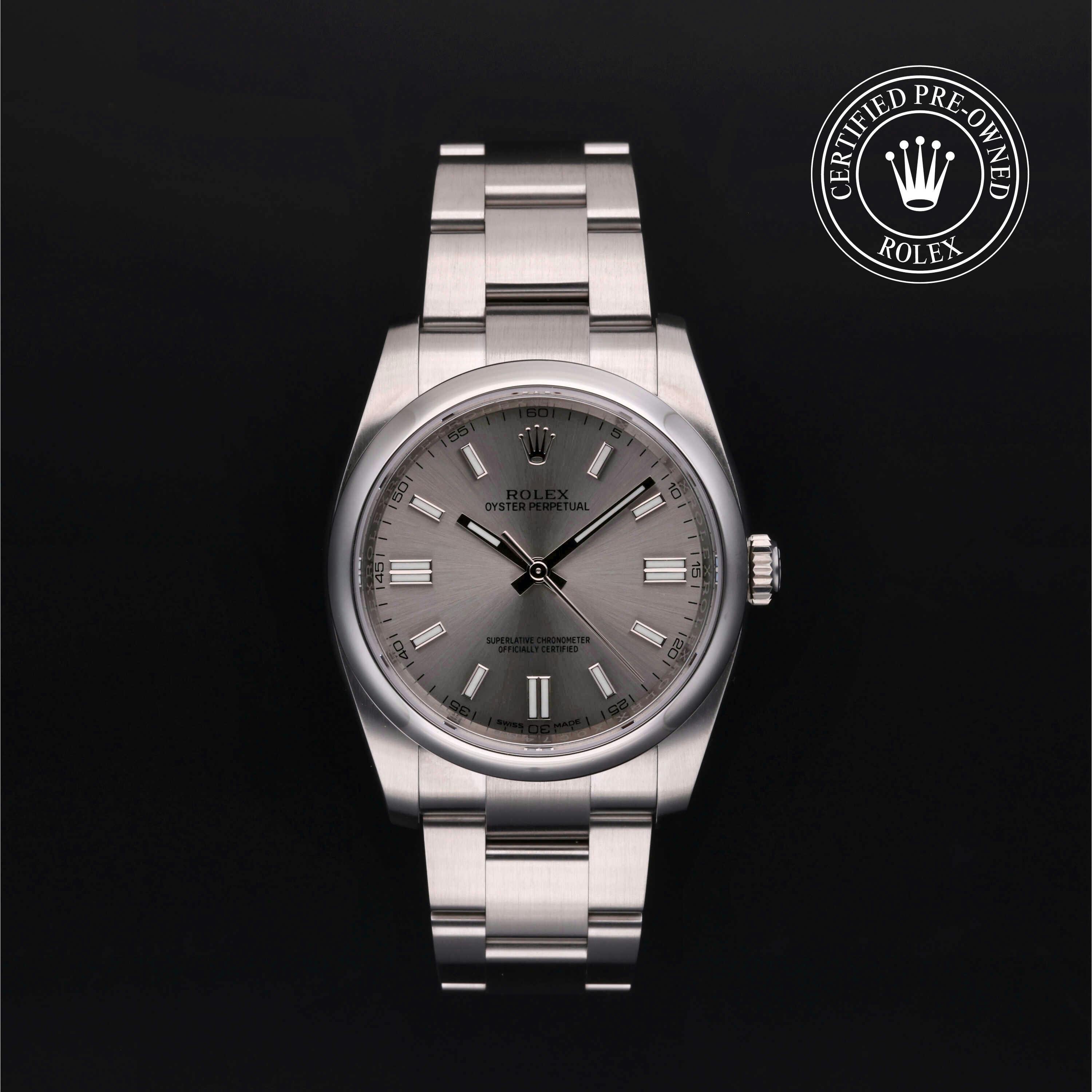 This 39mm stainless steel Oyster Perpetual features a clean white dial and 100m waterproofness. It appeals to collectors looking for a discontinued size with modern proportions and understated elegance in a used Rolex Oyster Perpetual.