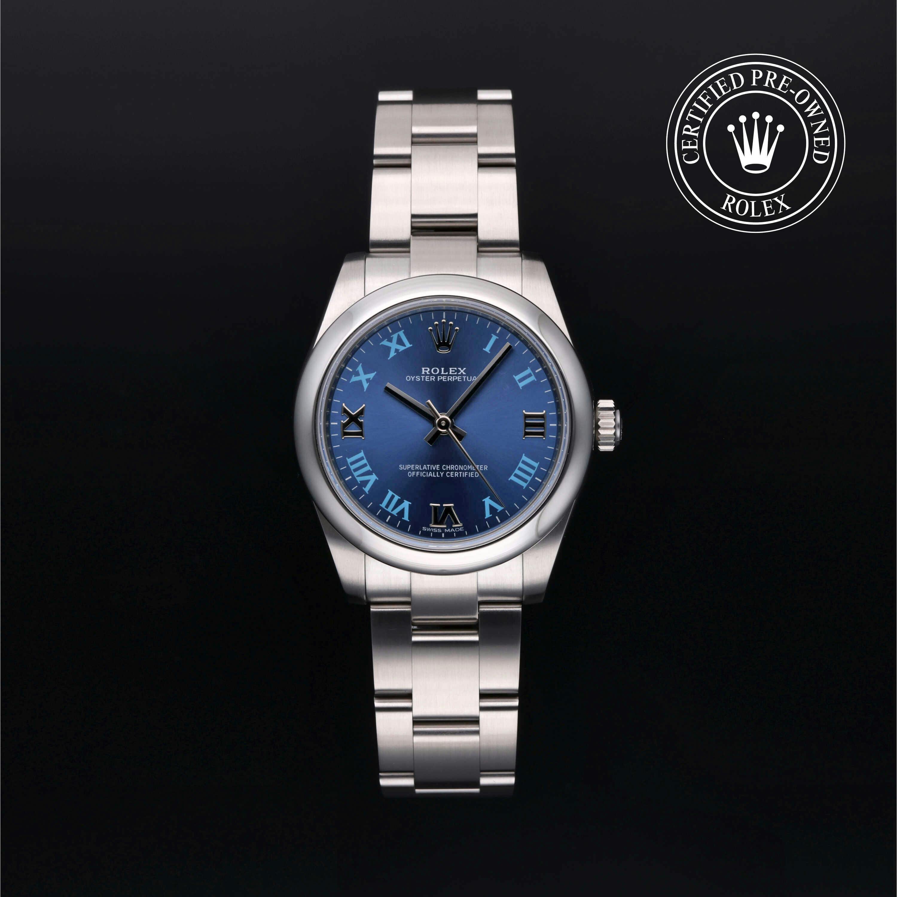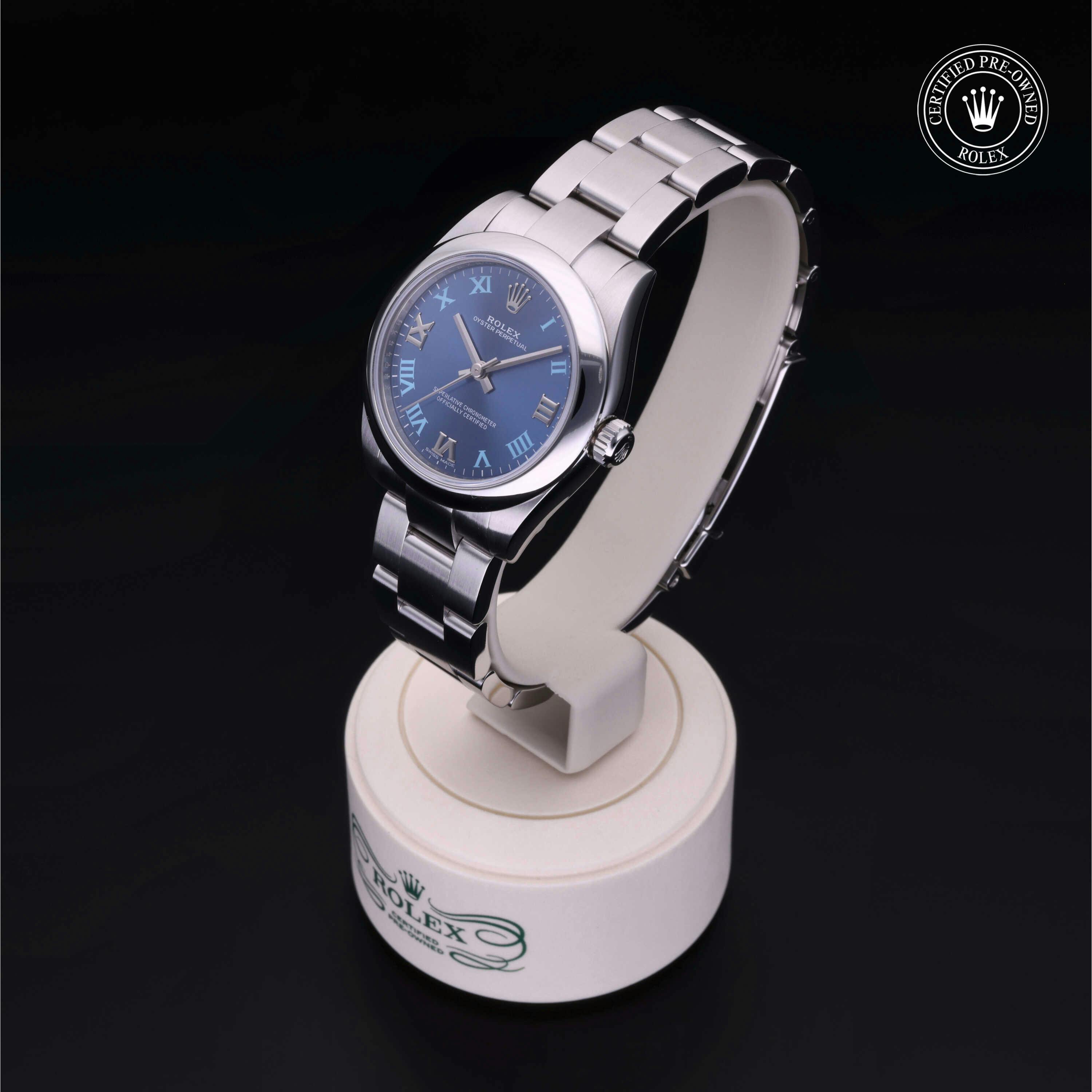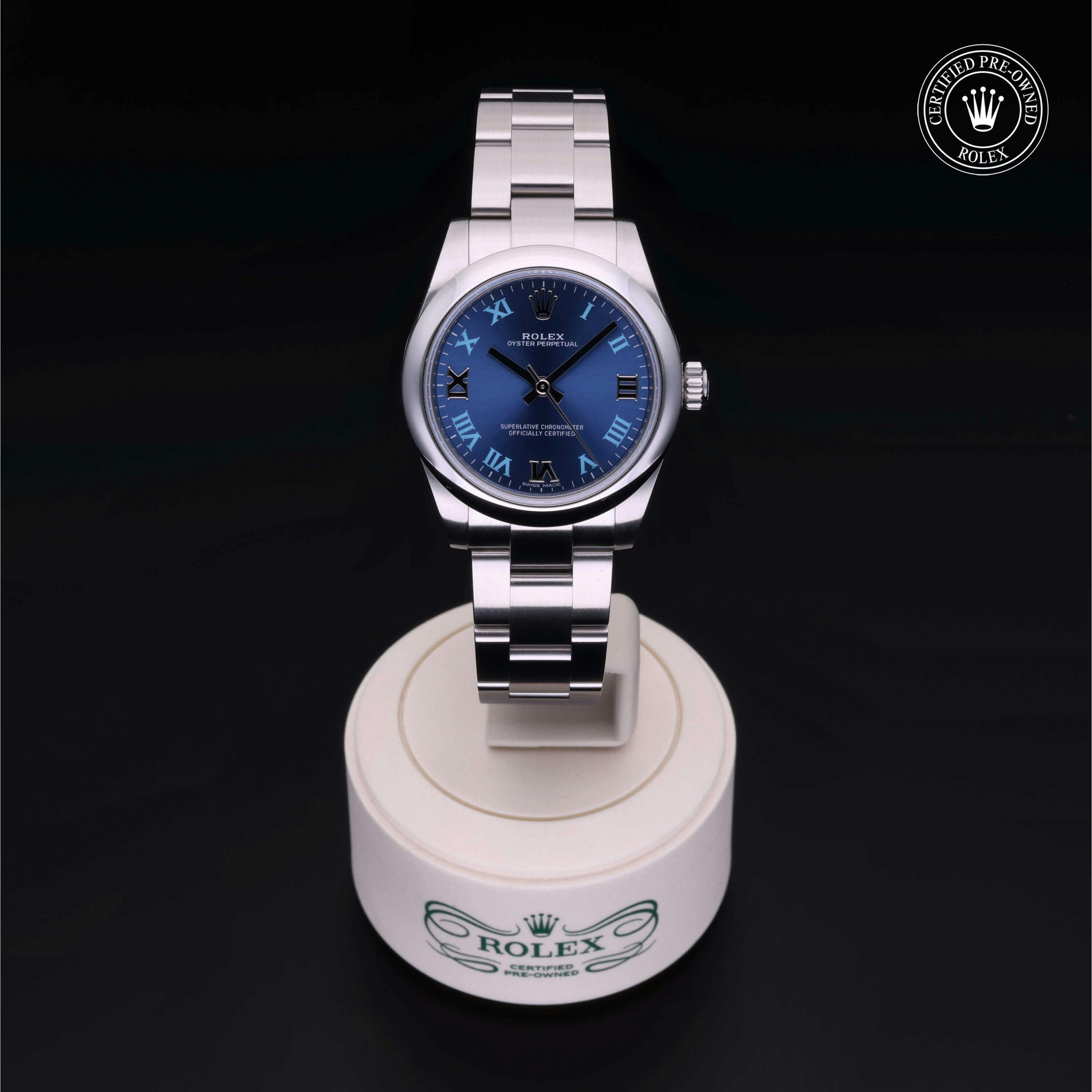 Pre-Owned Rolex Oyster Perpetual (177200) self - winding automatic watch, features a 31mm stainless steel case surrounding a blue dial on a strap. Functions include hours, minutes, seconds This watch has been serviced and comes complete with the original box and papers. Time remaining on the Manufacturer's service warranty!