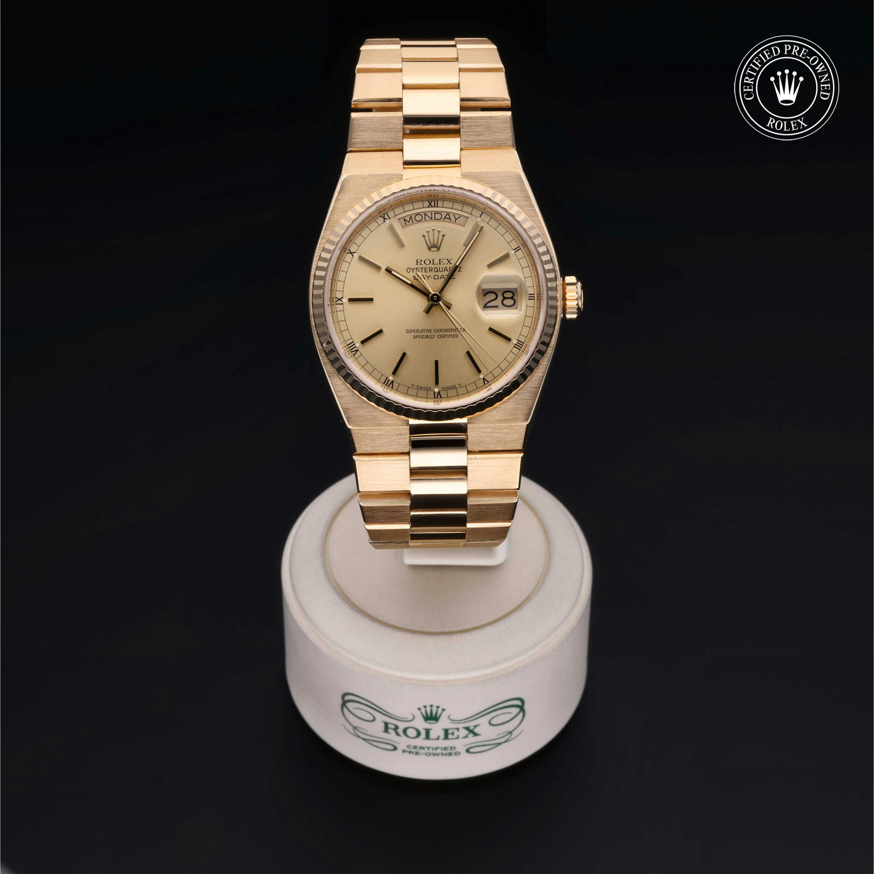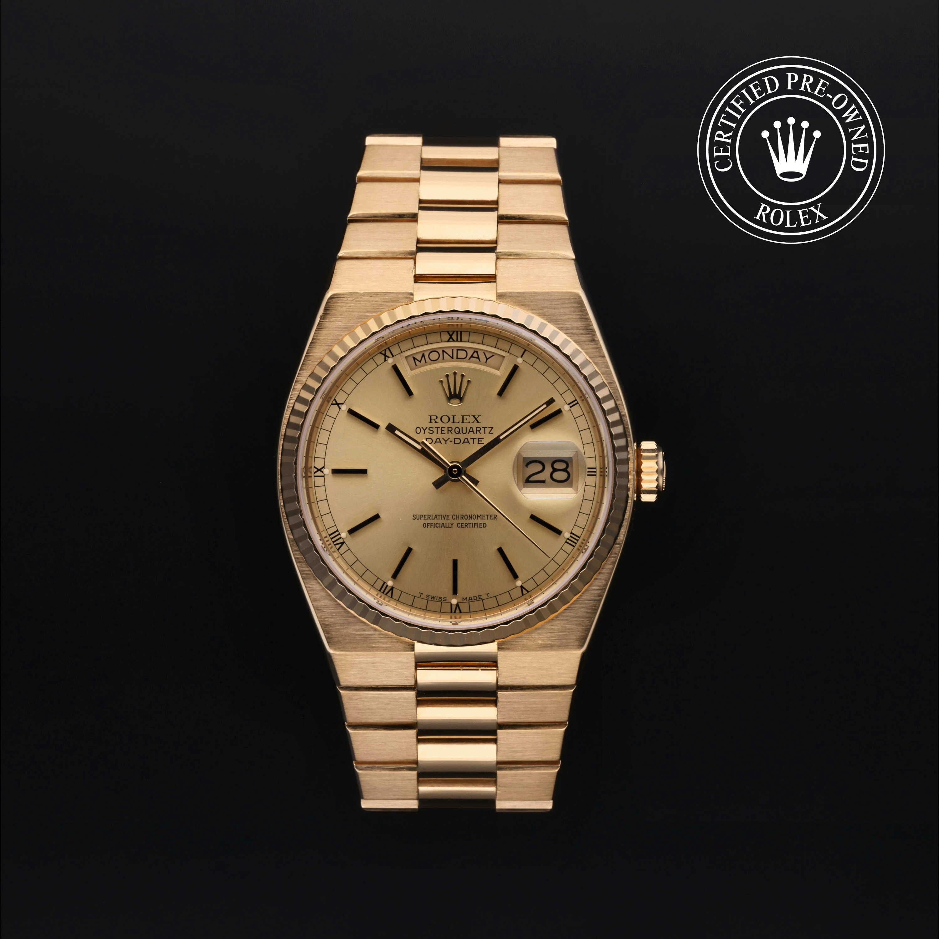 Rolex Certified Pre-Owned Oysterquartz Day-Date (19018) quartz watch, features a 36mm 18k yellow gold case and fluted bezel surrounding a champagne dial on an 18k yellow gold oyster quartz bracelet. Functions include hours, minutes, seconds, date and day. This watch has received Rolex-authorized service and certification. It does not come with the original box or papers, but includes a custom Rolex Certified Pre-Owned hang tag, travel pouch and RCPO international warranty card.