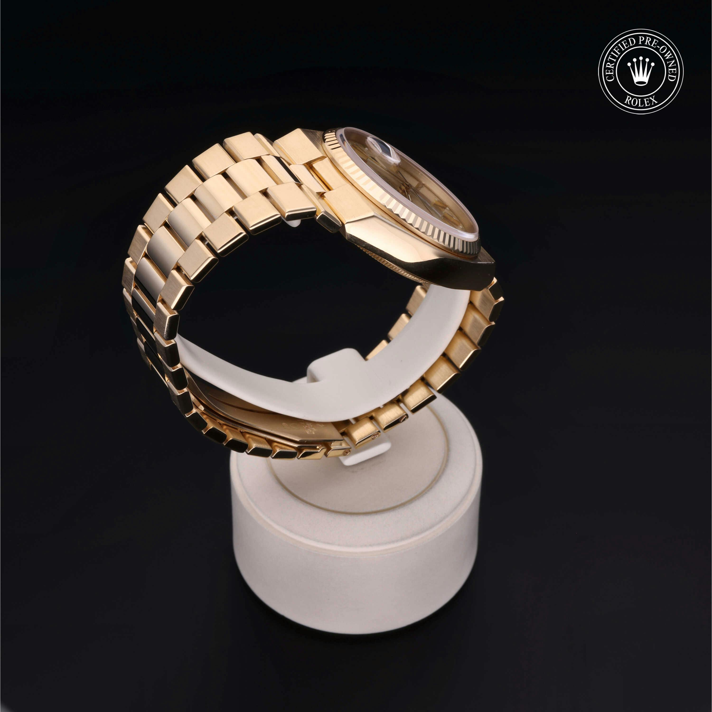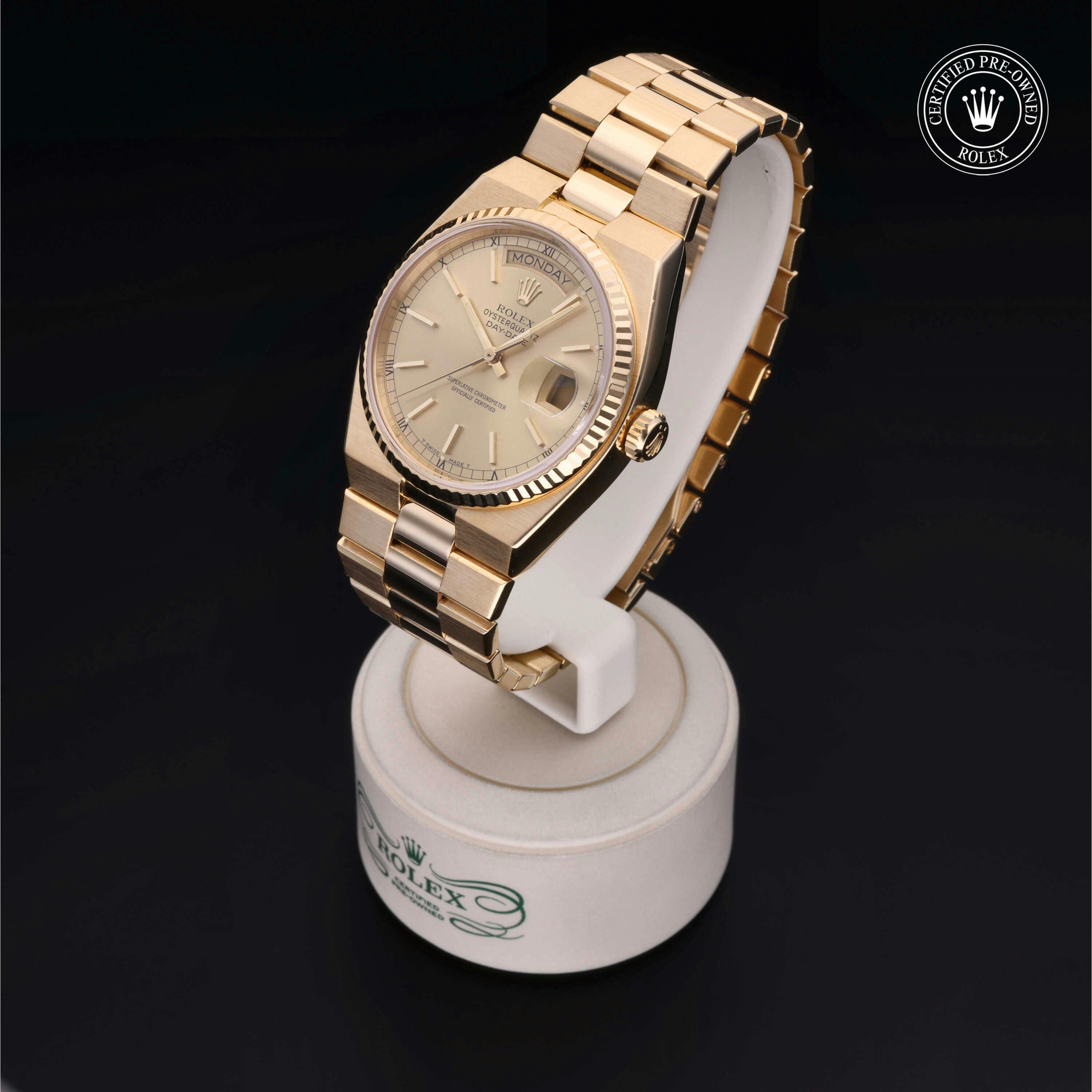 Rolex Certified Pre-Owned Oysterquartz Day-Date (19018) quartz watch, features a 36mm 18k yellow gold case and fluted bezel surrounding a champagne dial on an 18k yellow gold oyster quartz bracelet. Functions include hours, minutes, seconds, date and day. This watch has received Rolex-authorized service and certification. It does not come with the original box or papers, but includes a custom Rolex Certified Pre-Owned hang tag, travel pouch and RCPO international warranty card.