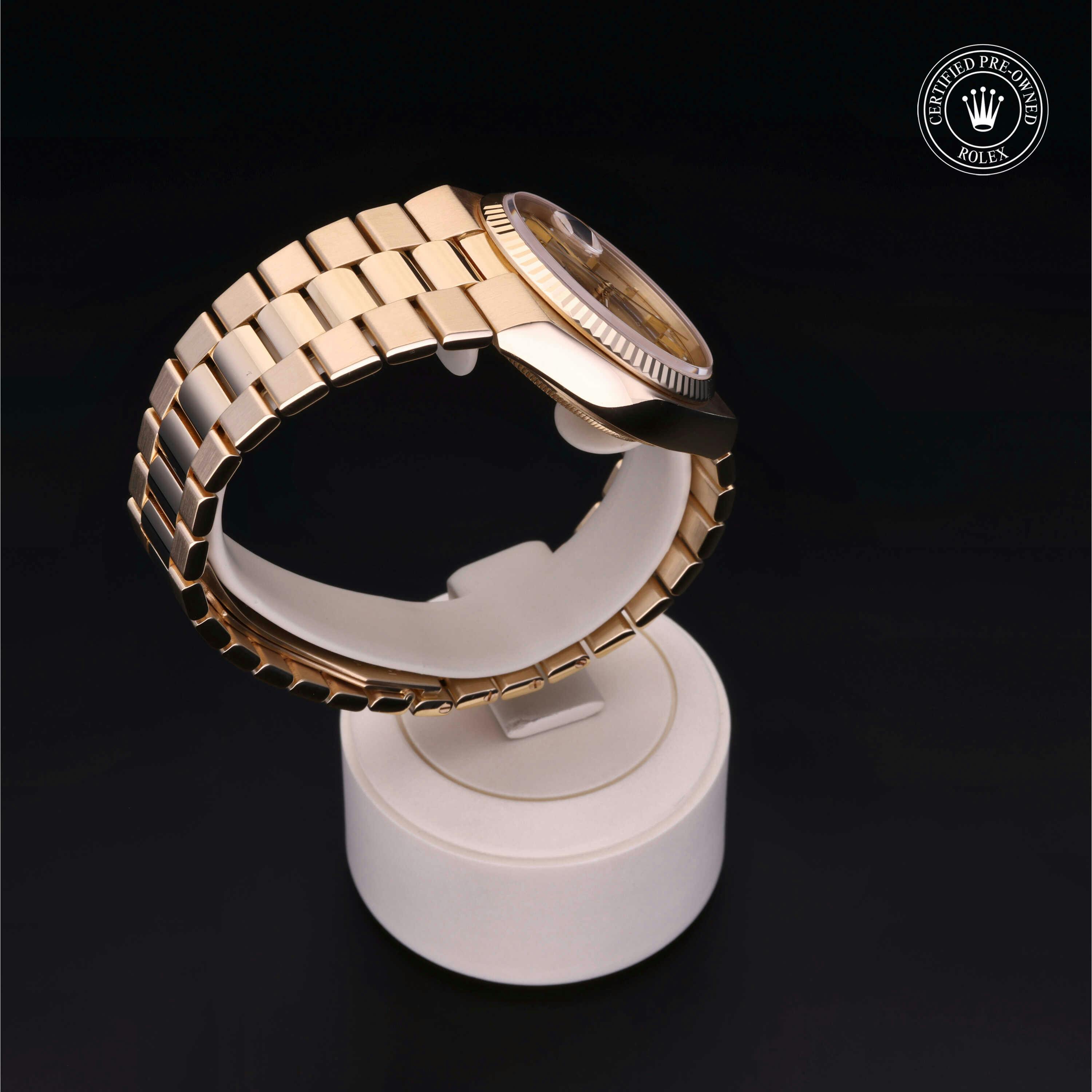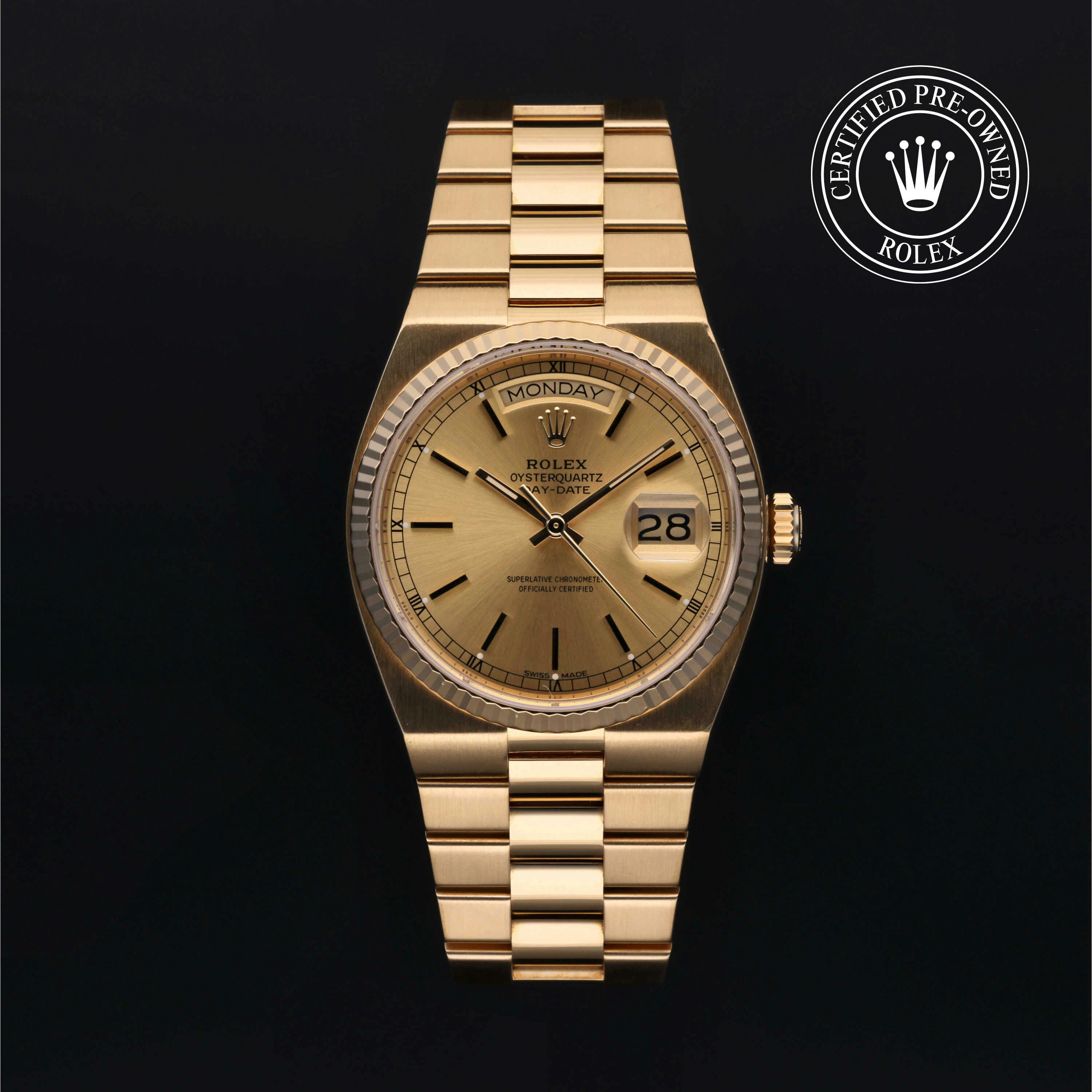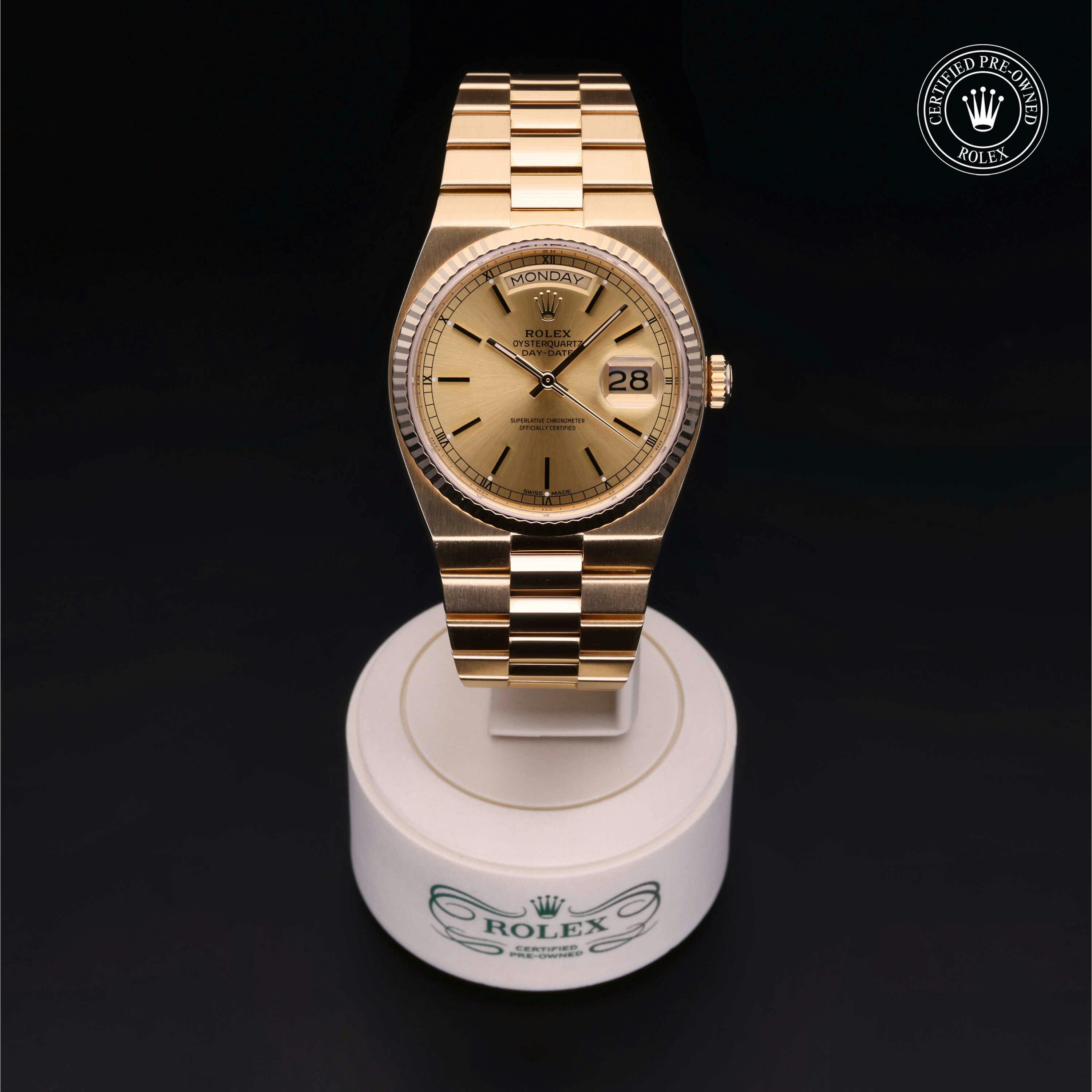 Pre-Owned Rolex Oysterquartz Day-Date (19018) watch, features a 36mm 18k yellow gold case surrounding a champagne dial on a strap. Functions include hours, minutes, seconds, date, day This watch has been serviced and comes with papers. Time remaining on the Manufacturer's service warranty! This watch will be ready to ship in 5-7 days!