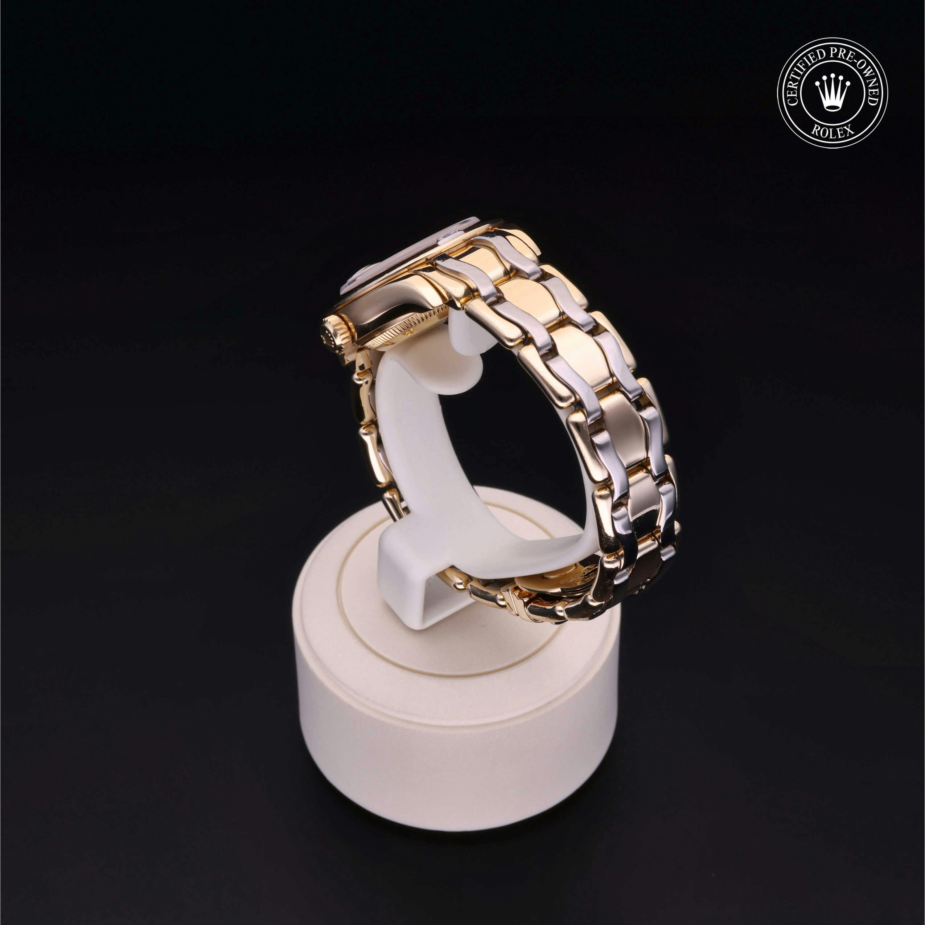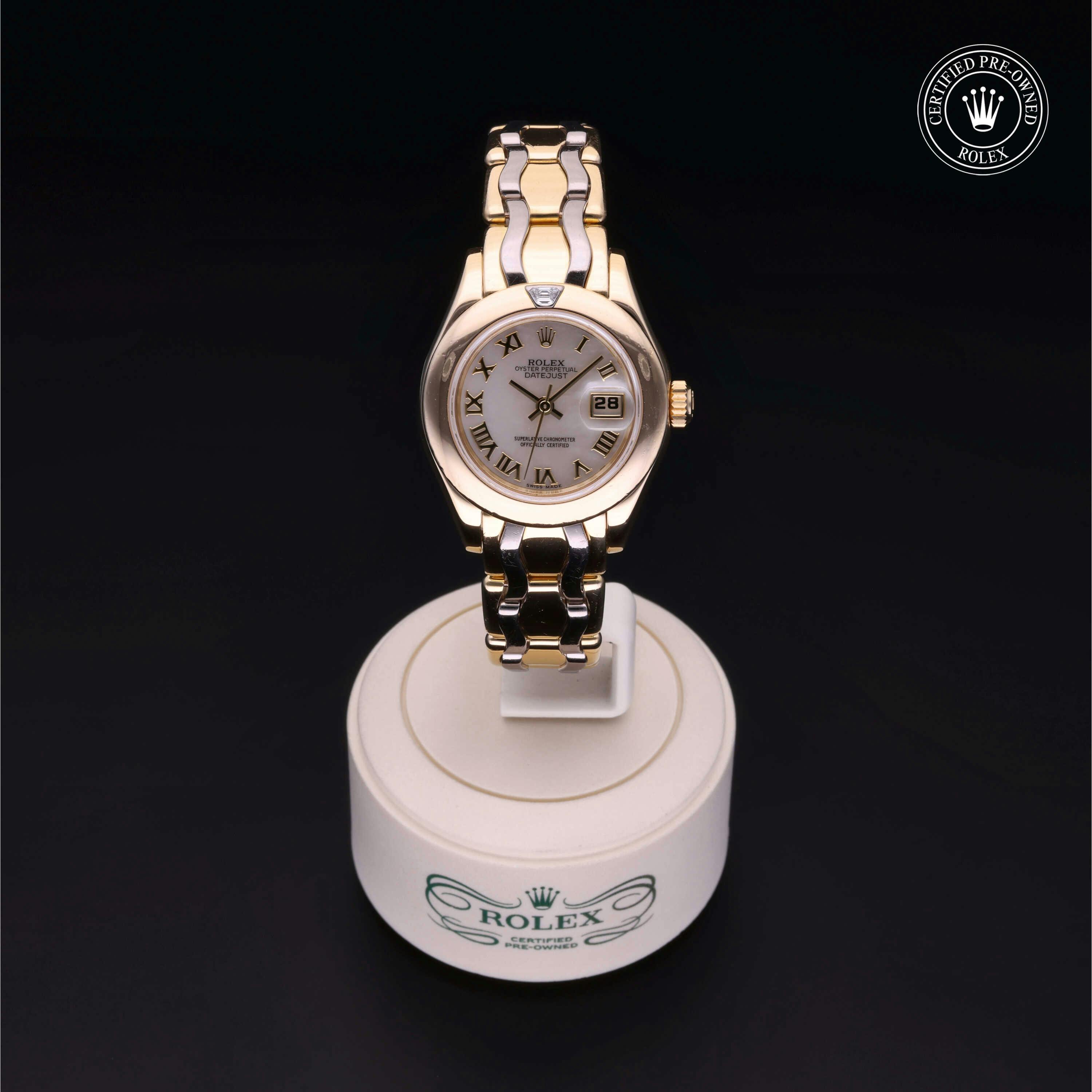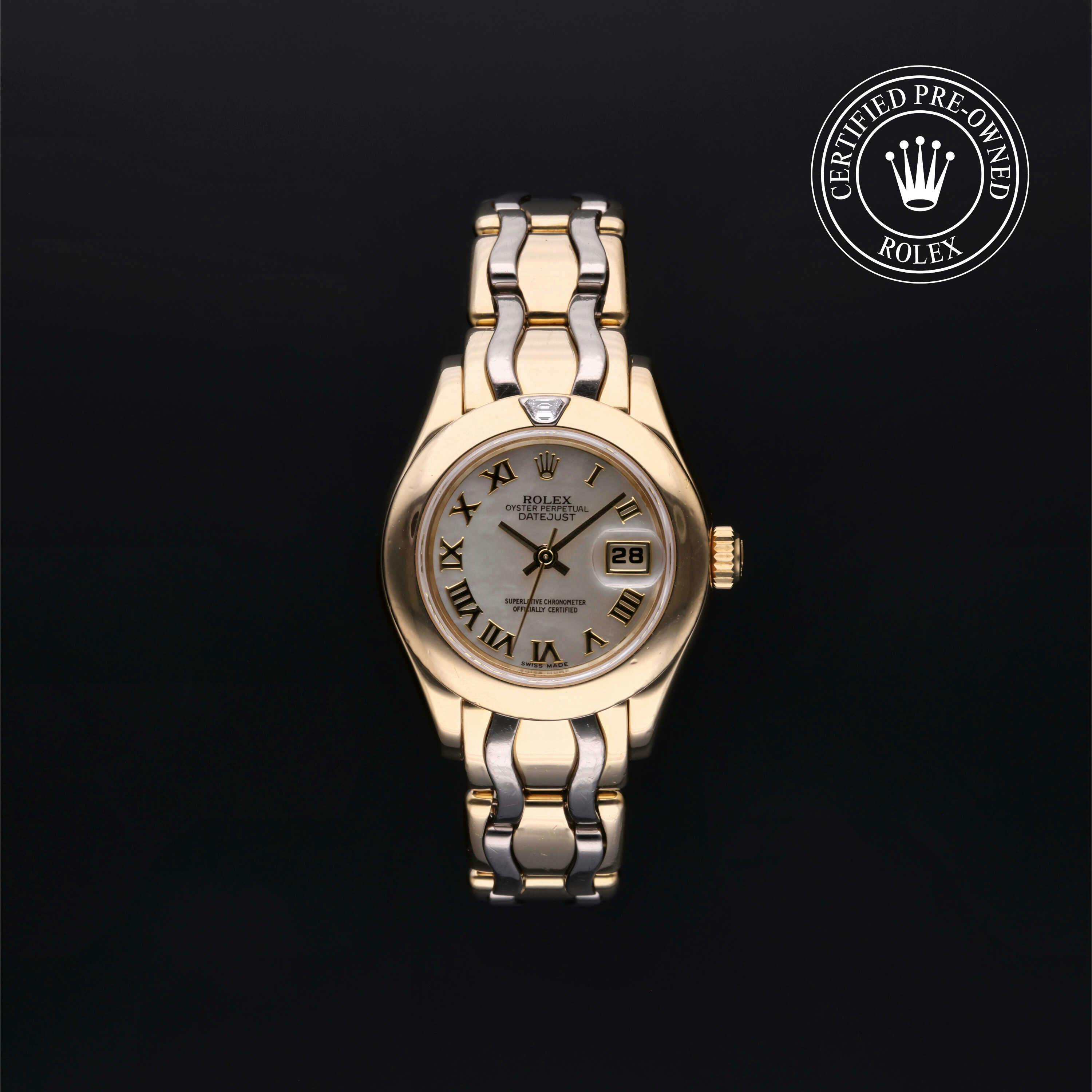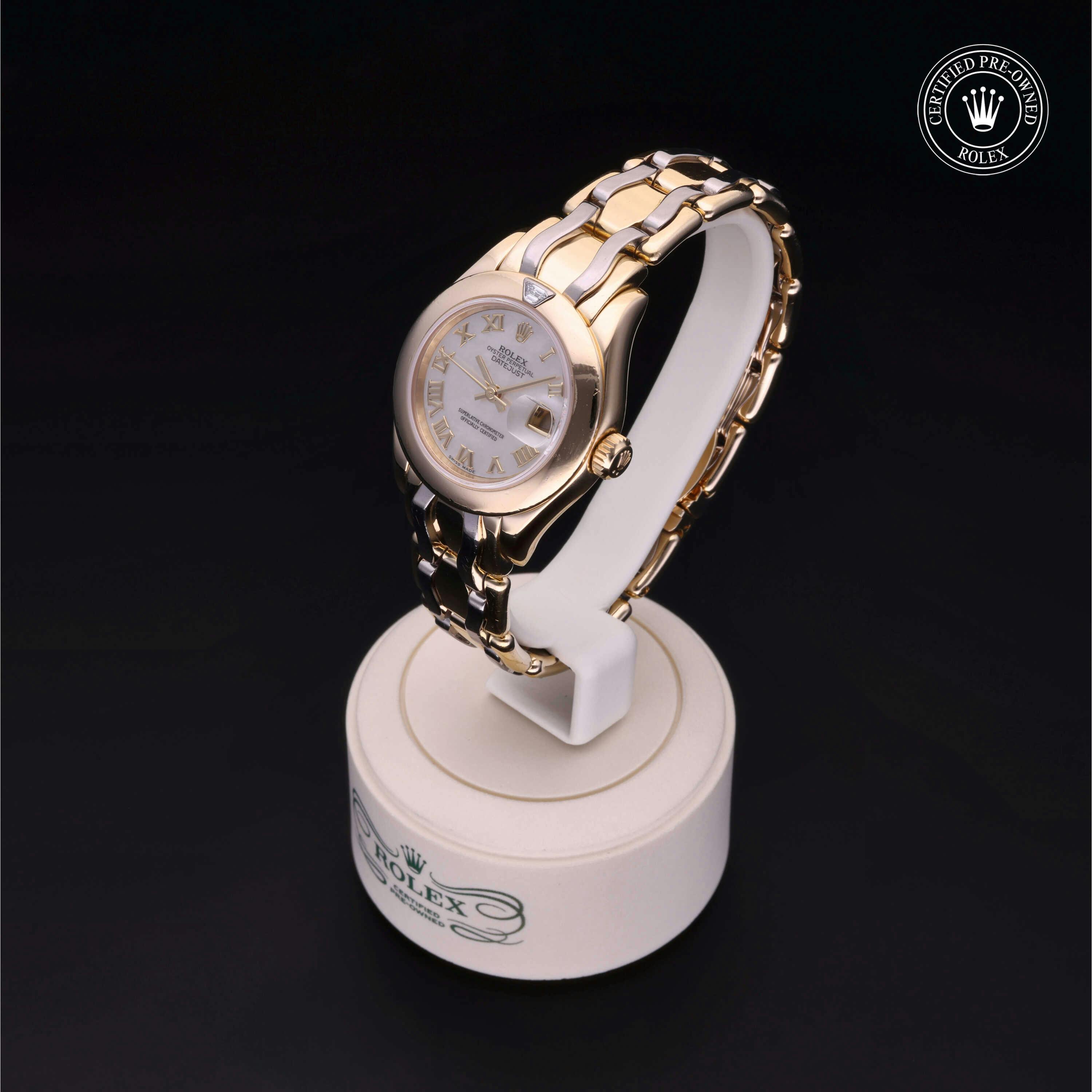 Rolex Certified Pre-Owned Pearlmaster Datejust (69328) self - winding automatic watch, features a 29mm 18k yellow gold case and smooth diamond set bezel surrounding a white, mother of pearl dial on an 18k yellow and white gold pearlmaster bracelet. Functions include hours, minutes, seconds and date. This watch has received Rolex-authorized service and certification. It comes with the original box and papers, and includes a custom Rolex Certified Pre-Owned hang tag, travel pouch and RCPO international warranty card.